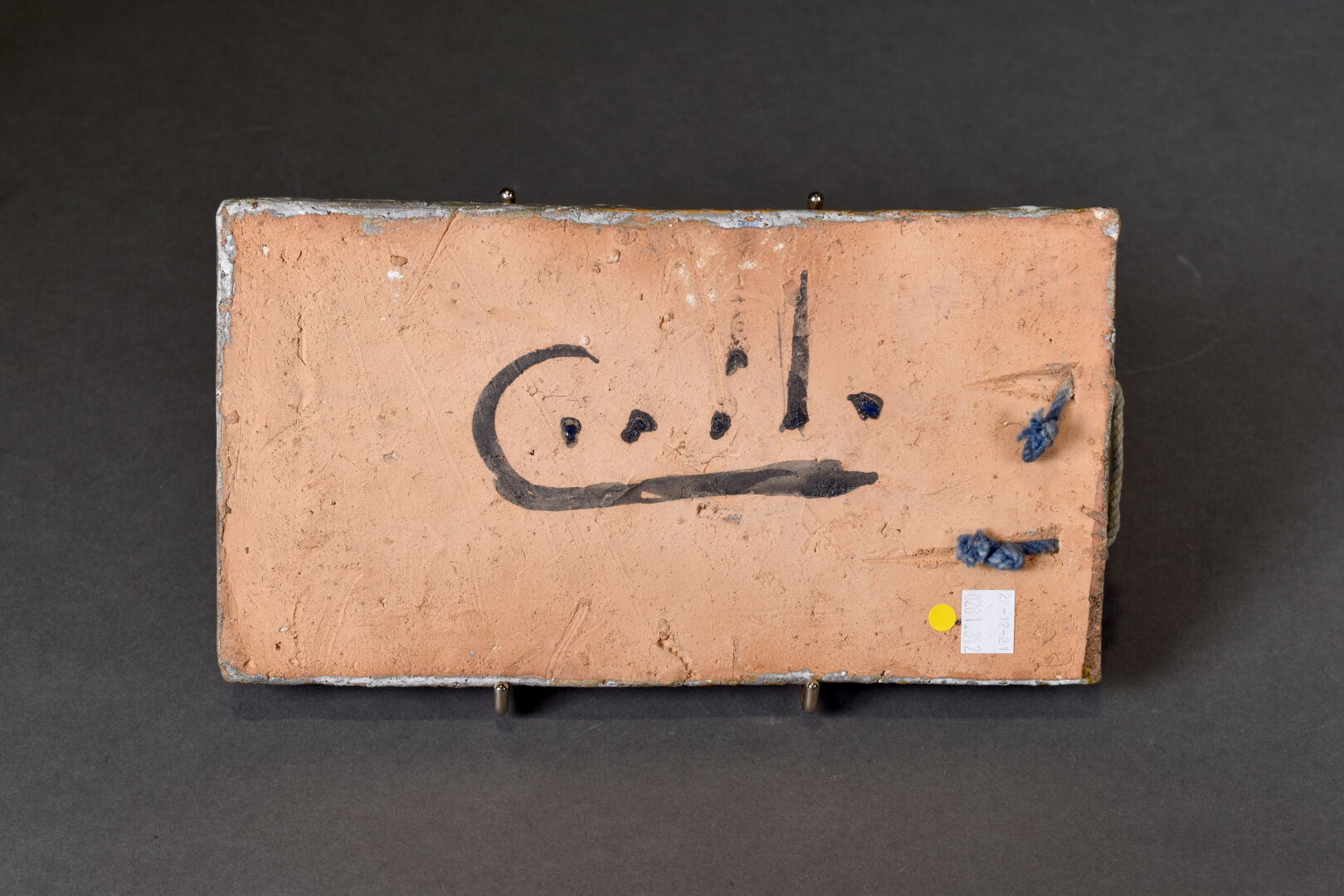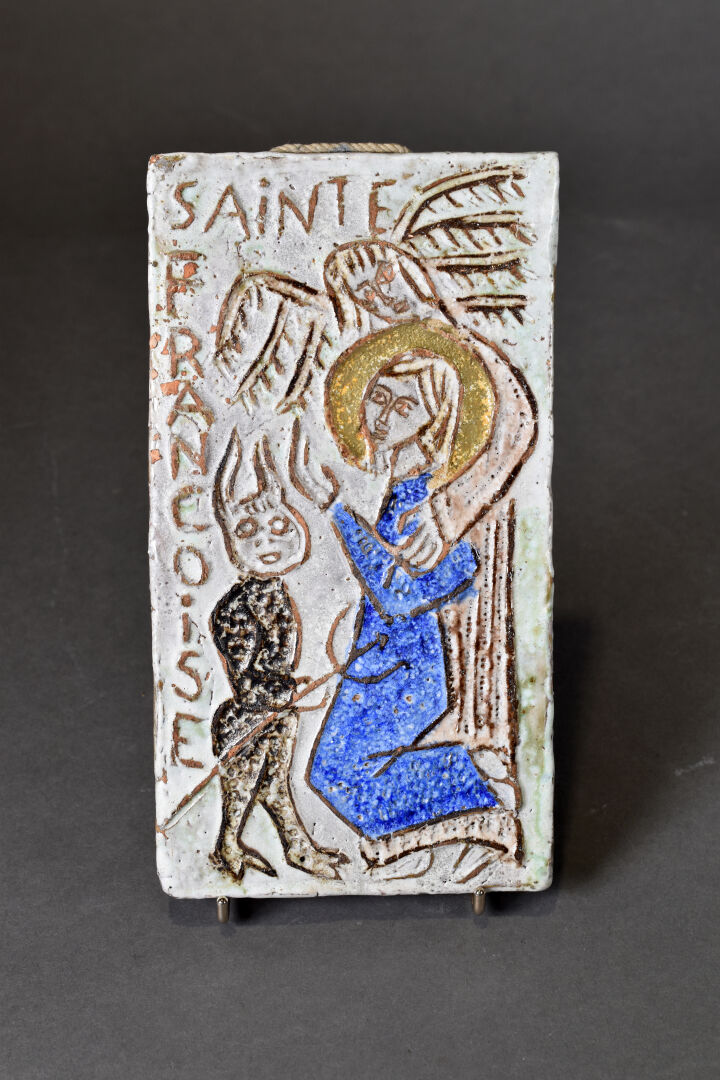 Carreau de céramique émaillé et gravé à décor de Sainte Françoise accompagnée d’un ange, en prière face au diable. XXe siècle. 27 x 15 cm.