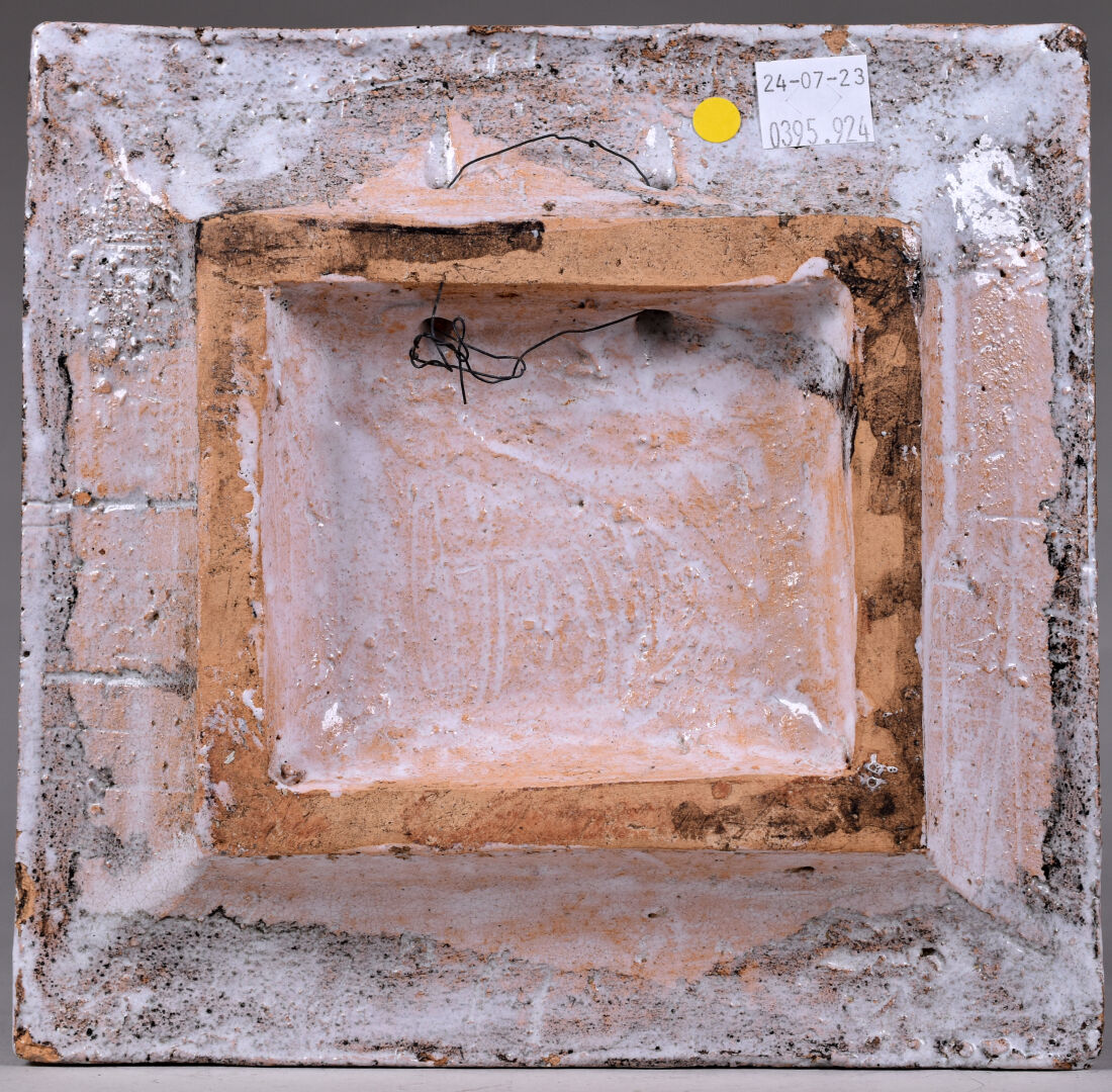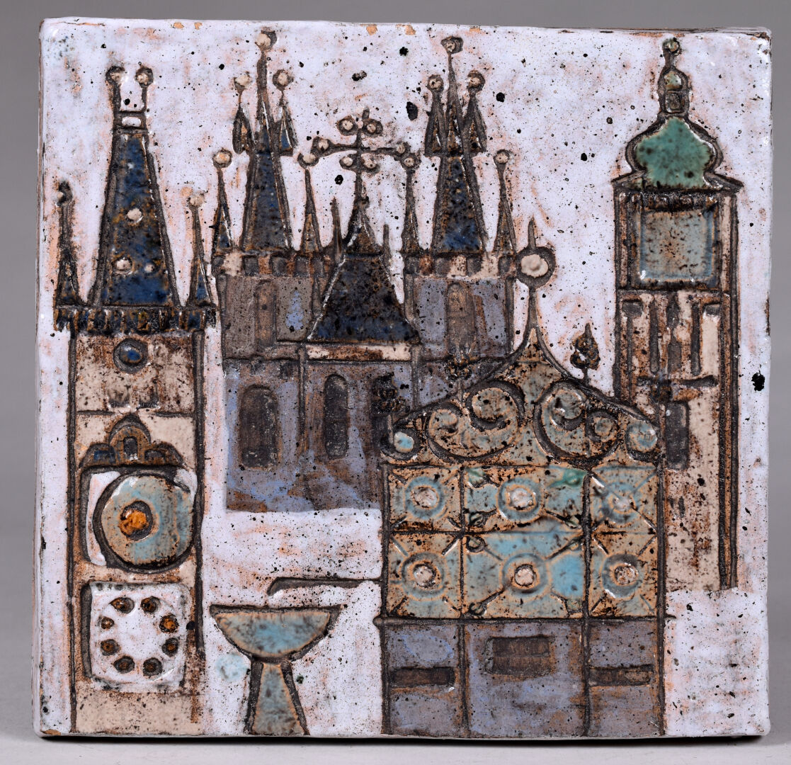 Carreau de céramique émaillé et gravé d’une ville imaginaire. Vallauris ? XXe siècle. 18,5 x 19 cm.