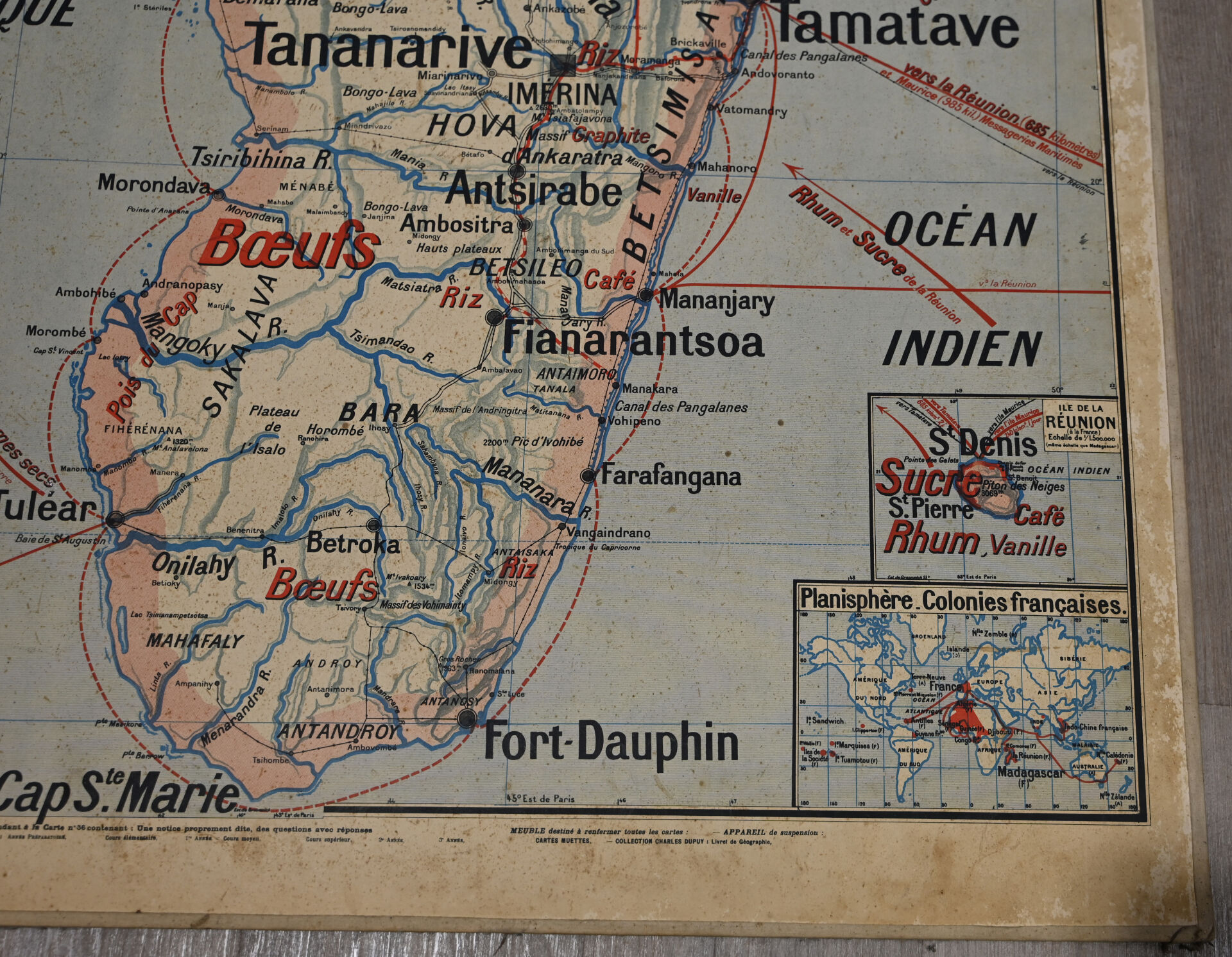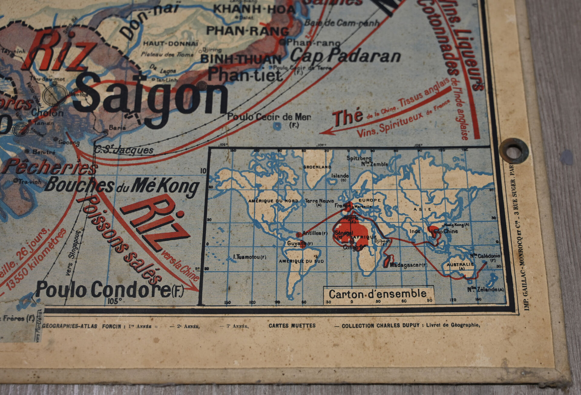 Carte scolaire de l’Asie du Sud-Est INDICHINE FRANCAISE (Laos et Siam et de l’autre côté Magascar). Librairie Armand Colin – VIDAL LABLACHE. 118 x 98 cm.