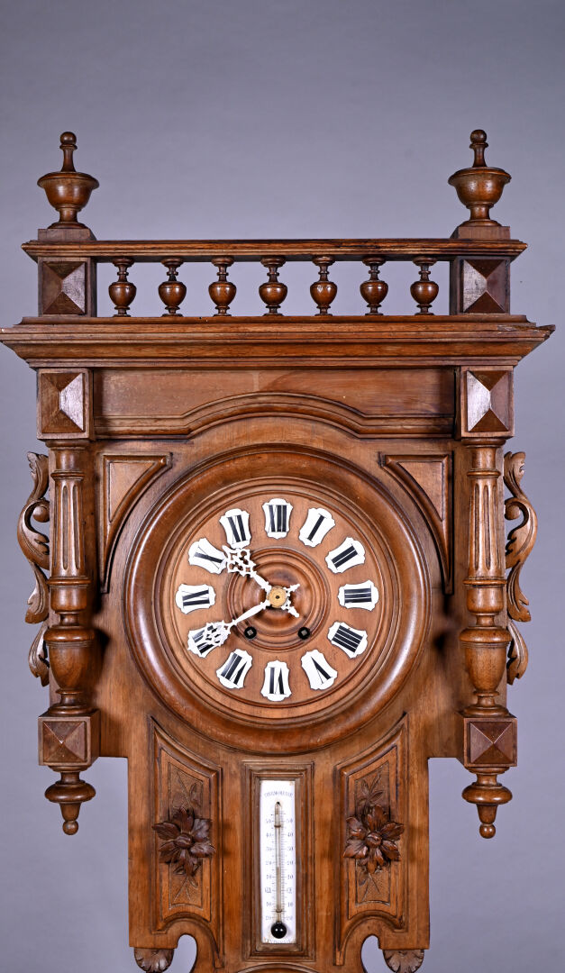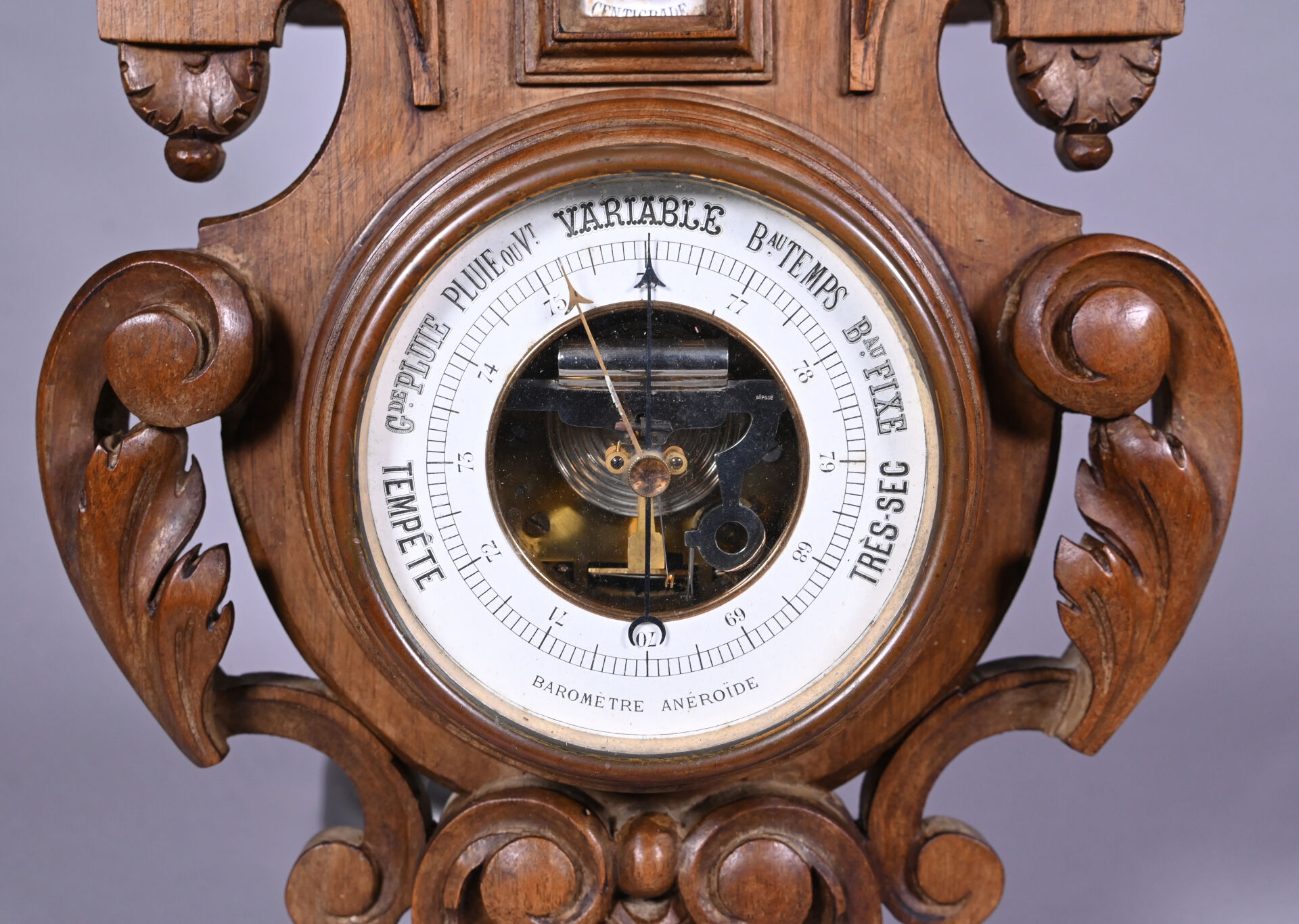 Cartel Baromètre thermomètre d’applique en noyer mouluré sculpté, le cadran à cartouches. Style Henri II. Haut. : 89 cm.