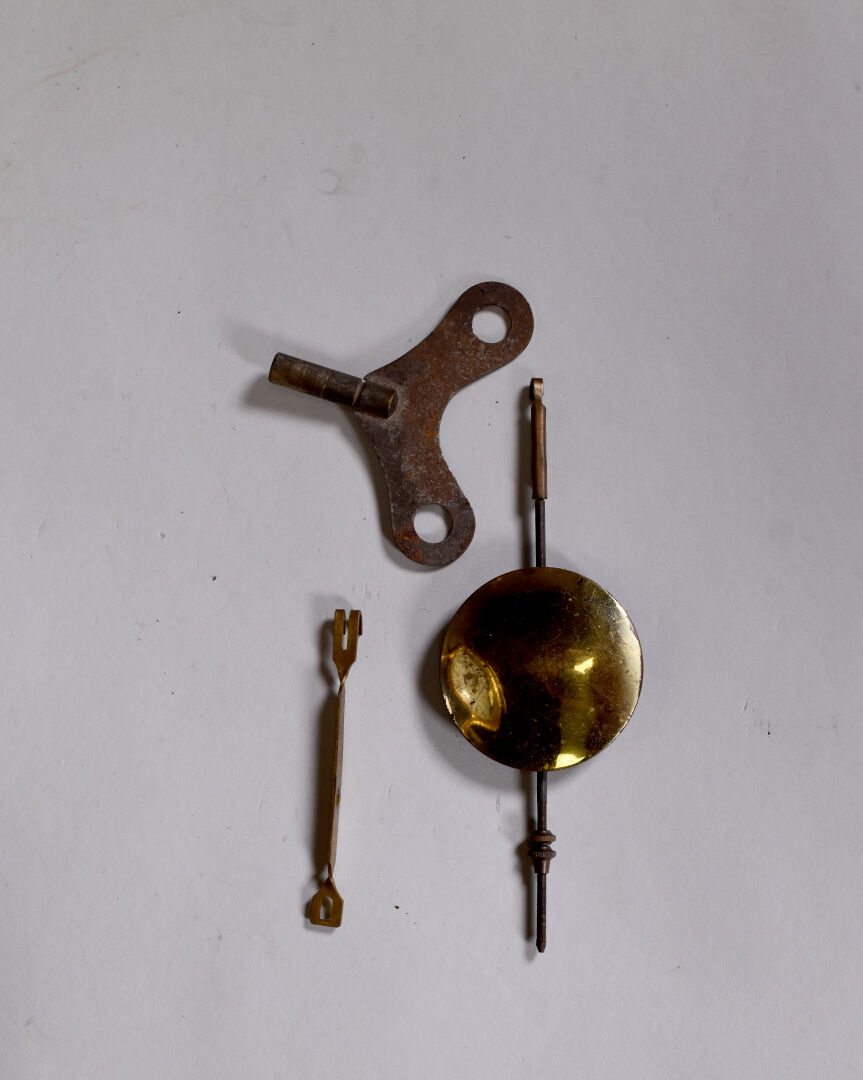 Cartel d’applique et son cul de lampe en bois laqué noir à décor peint en polychromie de fleurs. Cadran signé Vedette. Style Napoléon III, XXe siècle. Avec clé et balancier.Haut. totale : 67 cm.