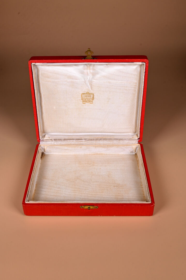 CARTIER. Inde Rajasthan. Minaudière en cuivre à décor ciselé d’animaux. Cabochons de quartz aventuriné, lapis et rubis pierres de couleur. Avec étui pour rouge et briquet. Ecrin d’origine. Vers 120. La fiche sera complétée dans les jours à venir.