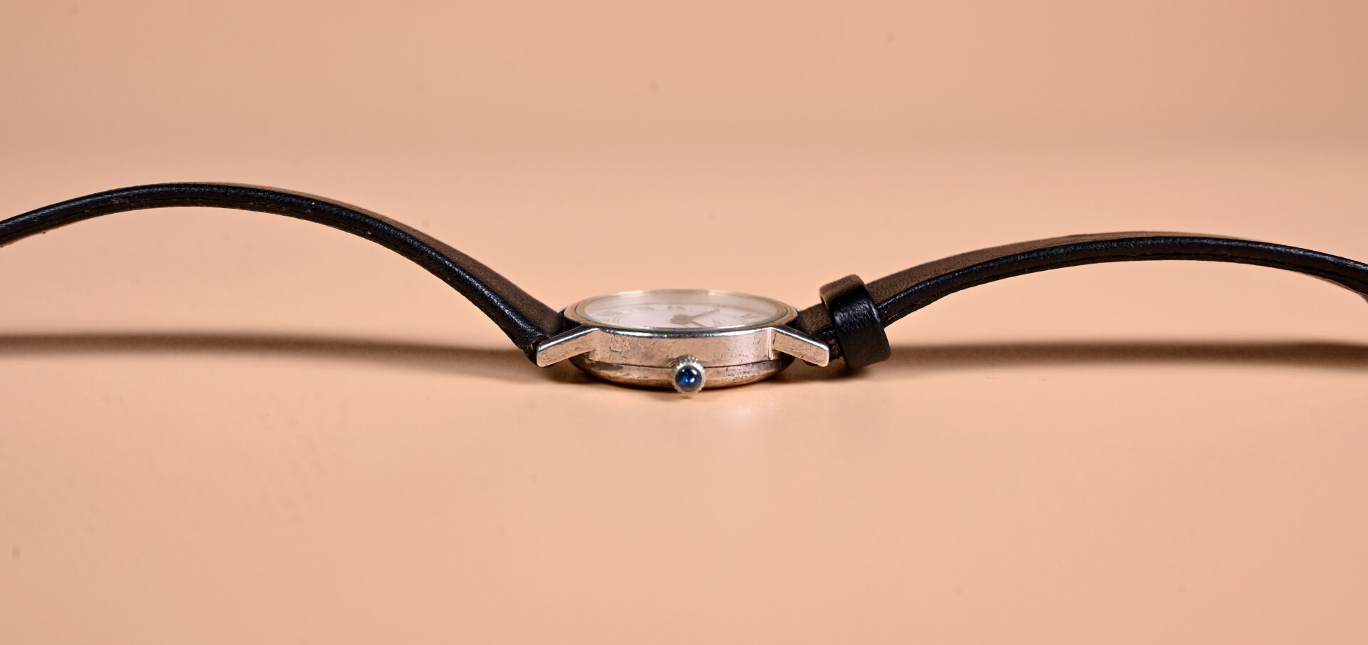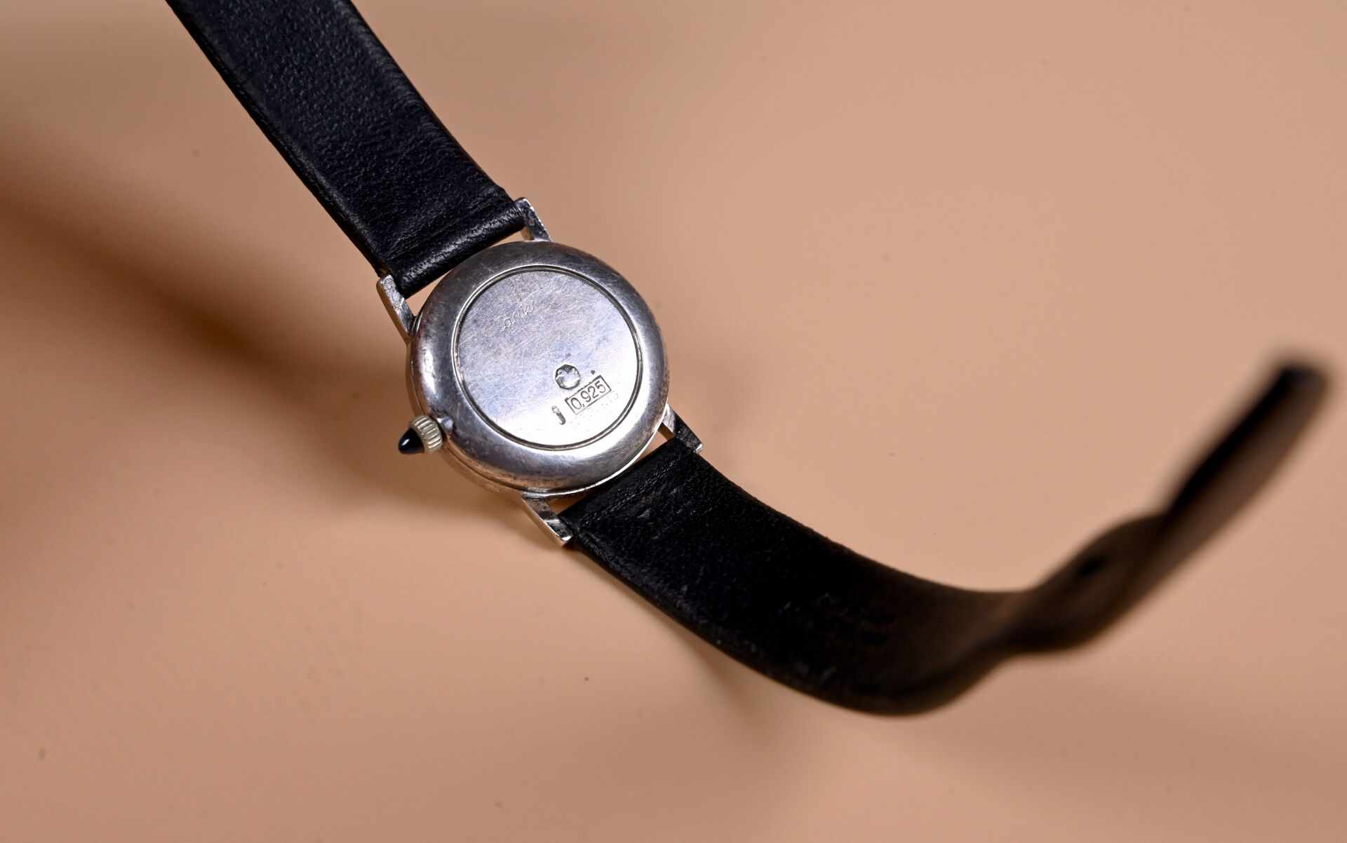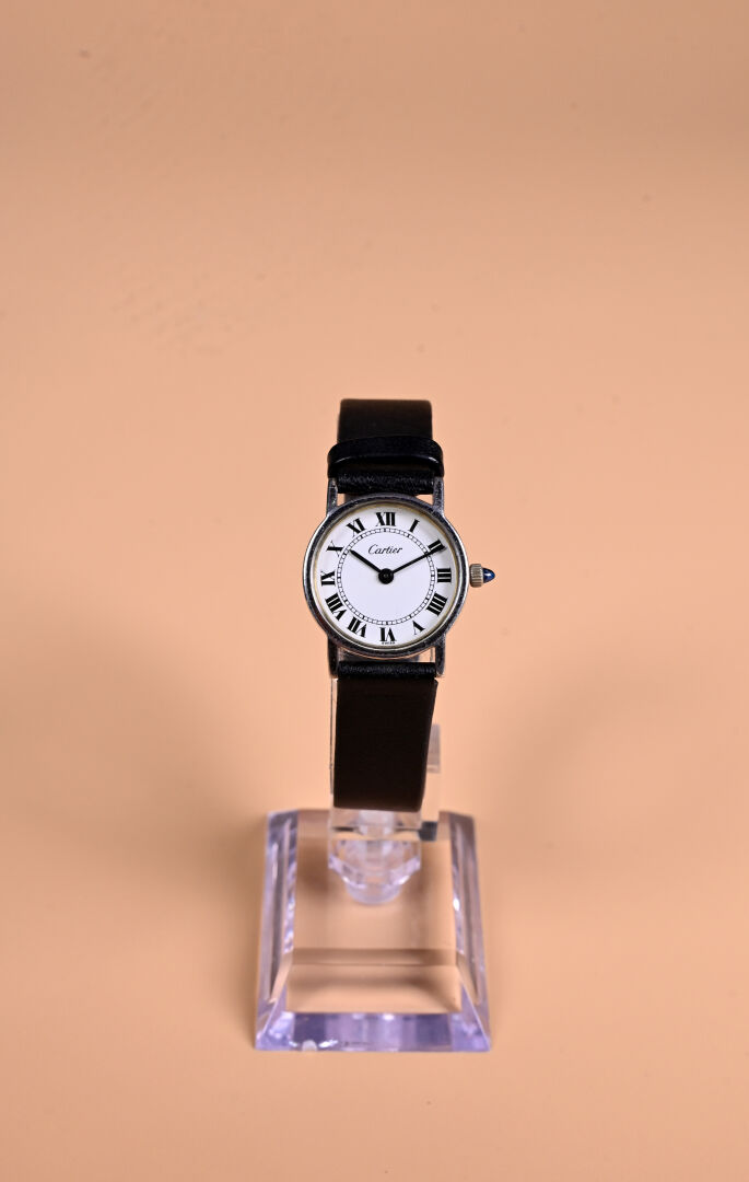 CARTIER LADY SOLO. Montre à boitier rond en argent 925/1000e. Cadran à fonds blanc avec index des heures en chiffres romains en noir. Mouvement mécanique à remontage manuel, réf. : 78-1. Bracelet rapporté simili-cuir. Fonctionne. Diam. : 22 mm.