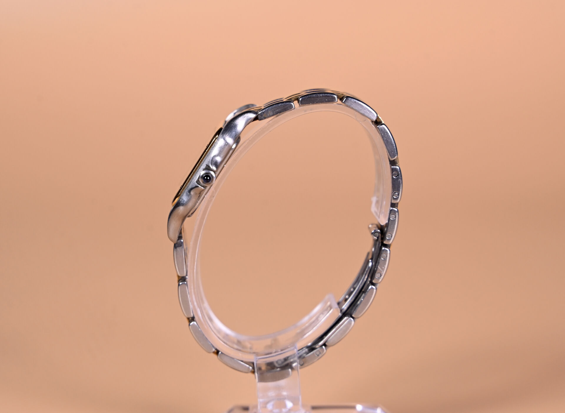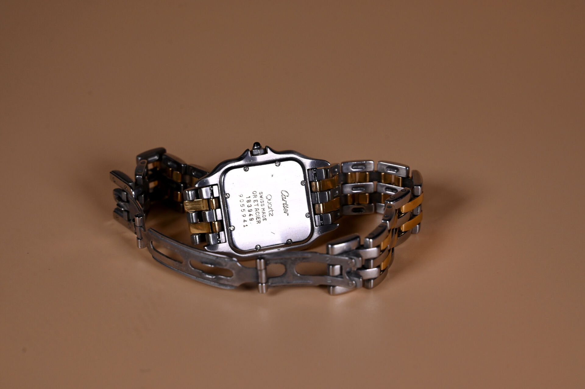 CARTIER Panthère, vers 1990. Montre de dame en acier et or 750 millièmes 18k. Cadran à fond blanc avec index des heures en chiffres romains en noir et guichet dateur à 4h. Mouvement quartz. Boucle déployante signée. Dimensions boîtier : 26 mm. Avec maillons supplémentaires, écrin d’origine et facture de révision avec pochon. A réviser.