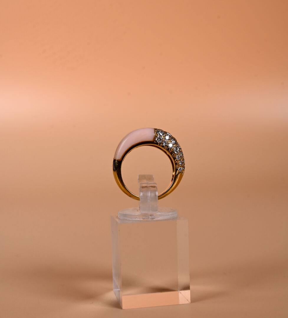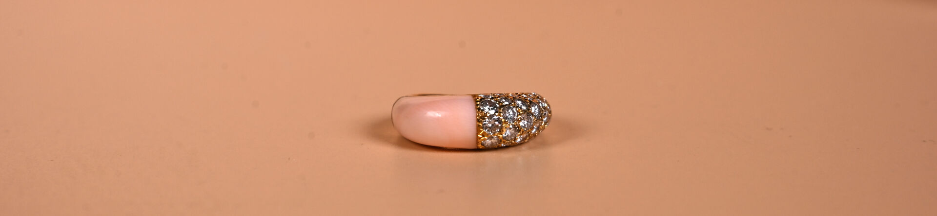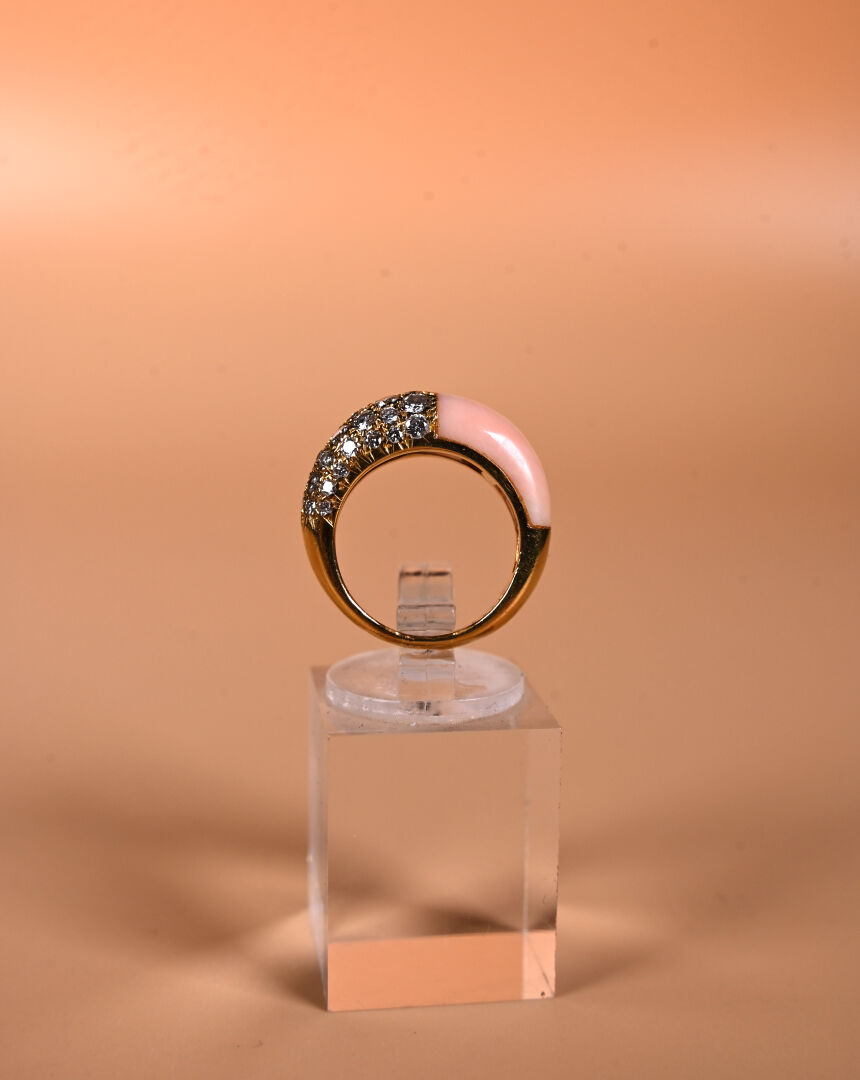 CARTIER Paris. Bague anneau en or jaune 750 millièmes (18k) pavée de diamants taille moderne faisant face à un cabochon de corail peau d’ange. Signée et numérotée à l’intérieur. TDD 49. Bel état. Poids brut : 6,4 g Aigle