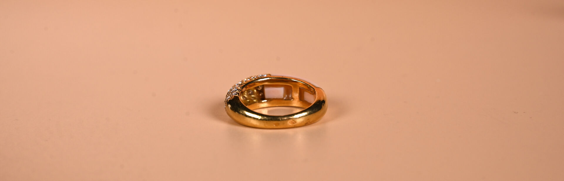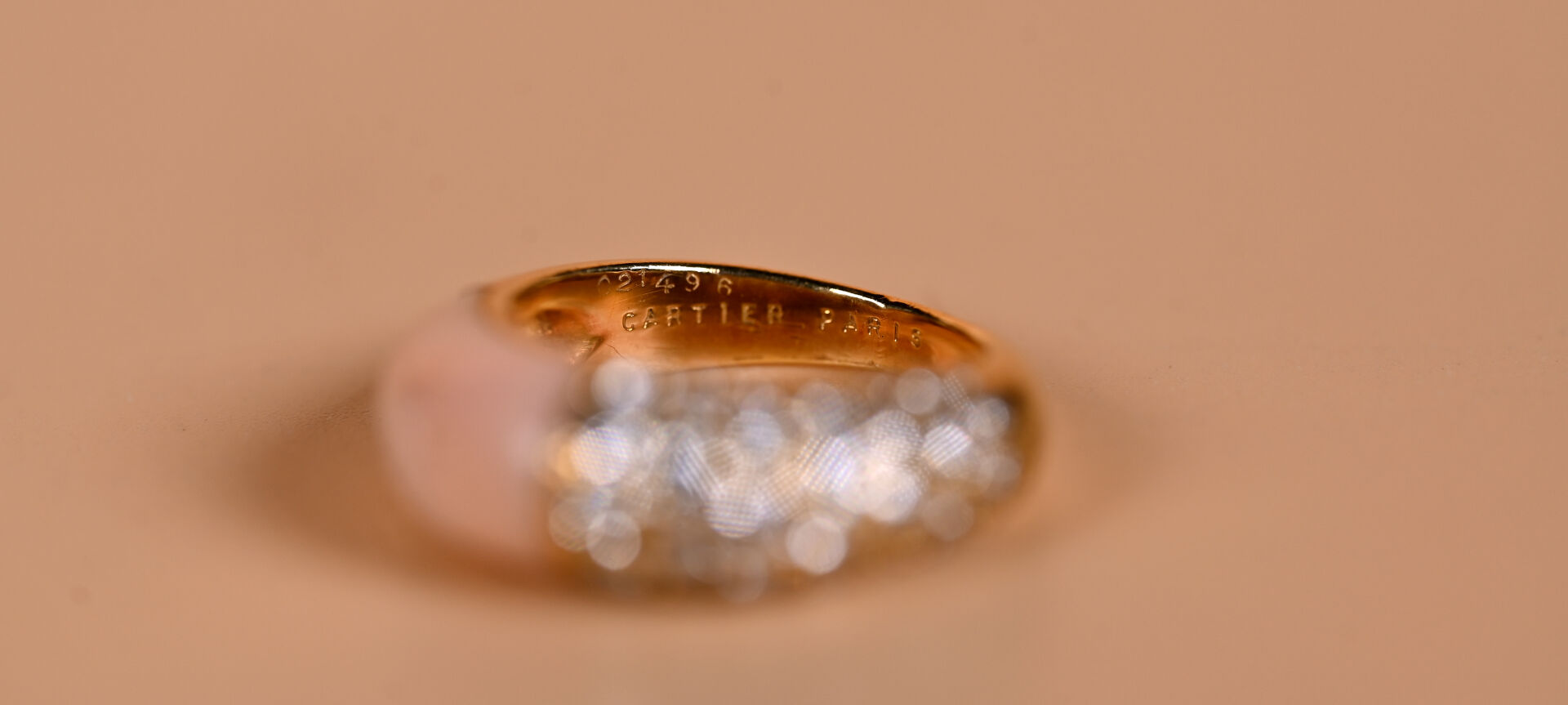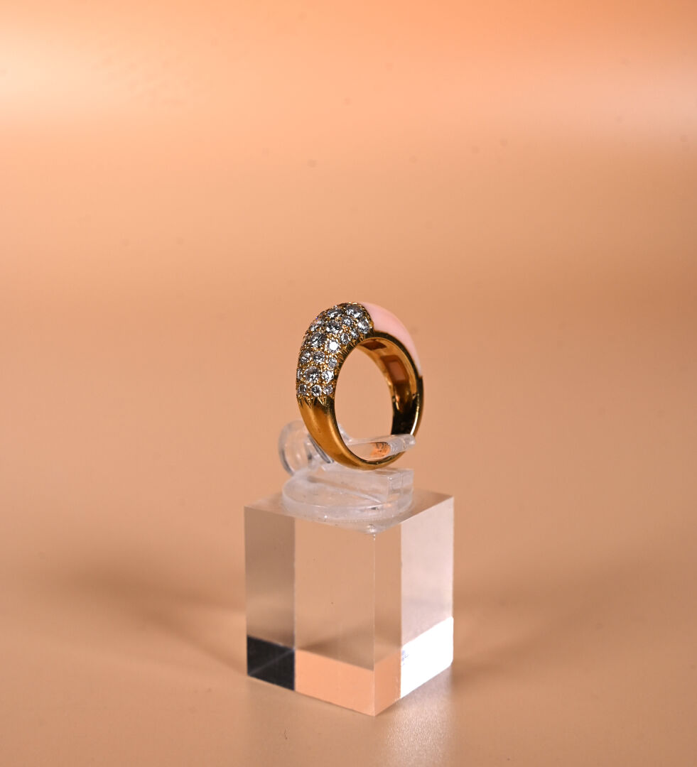 CARTIER Paris. Bague anneau en or jaune 750 millièmes (18k) pavée de diamants taille moderne faisant face à un cabochon de corail peau d’ange. Signée et numérotée à l’intérieur. TDD 49. Bel état. Poids brut : 6,4 g Aigle