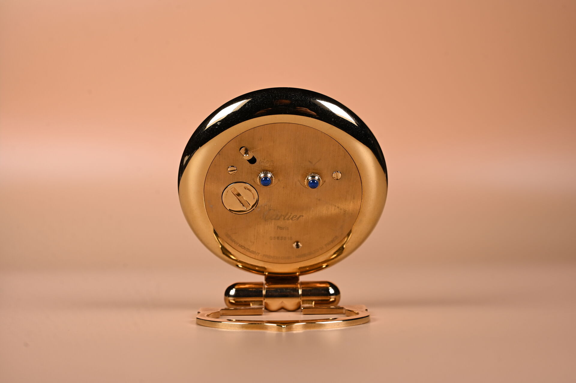 CARTIER, pendulette de bureau en métal doré. Mouvement à quartz ( pile à réviser). Numéroté 2/245. Ht. 10 cm.