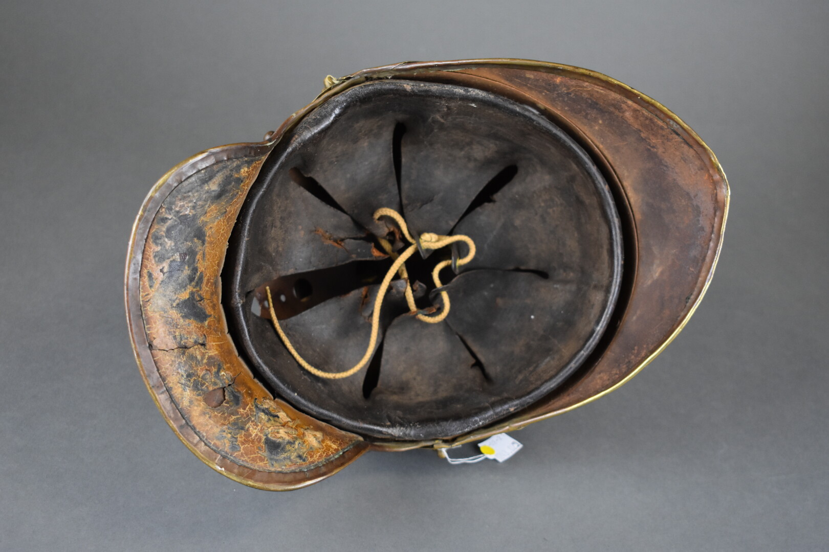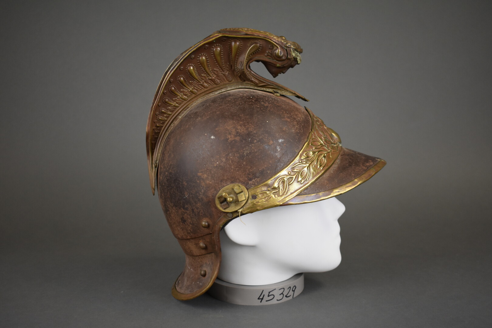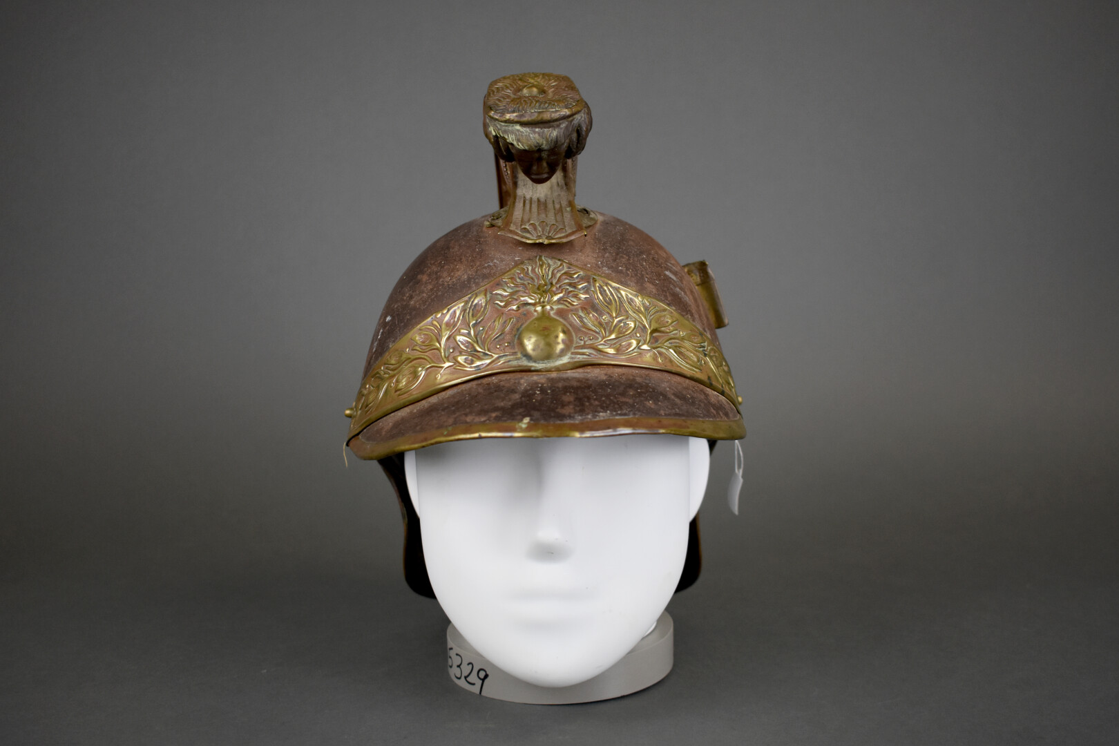 Casque de dragon troupe, modèle 1874, incomplet, bombe en acier oxydation uniforme, (restaurable). Signet enfoncé, manque crinière, jugulaire. Porte-plume présent. Coiffe interne dent de loup cuir présente. Marquage de fabricant. L. HELERONNER. Etat 3.