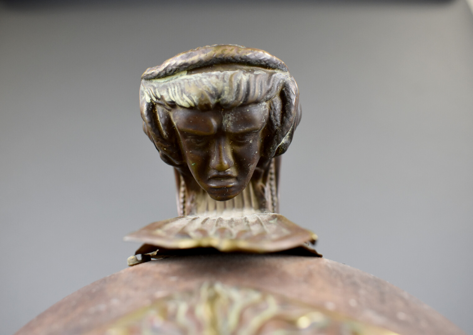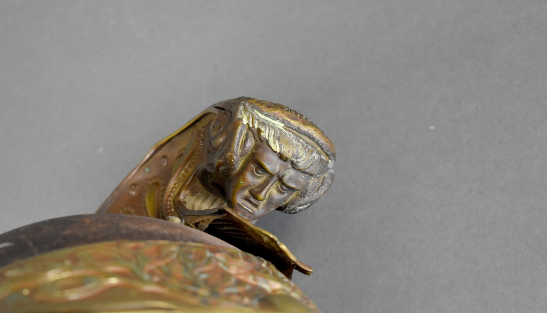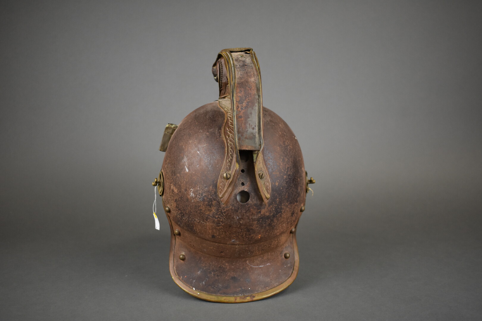 Casque de dragon troupe, modèle 1874, incomplet, bombe en acier oxydation uniforme, (restaurable). Signet enfoncé, manque crinière, jugulaire. Porte-plume présent. Coiffe interne dent de loup cuir présente. Marquage de fabricant. L. HELERONNER. Etat 3.