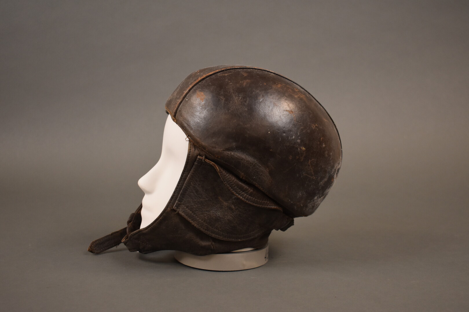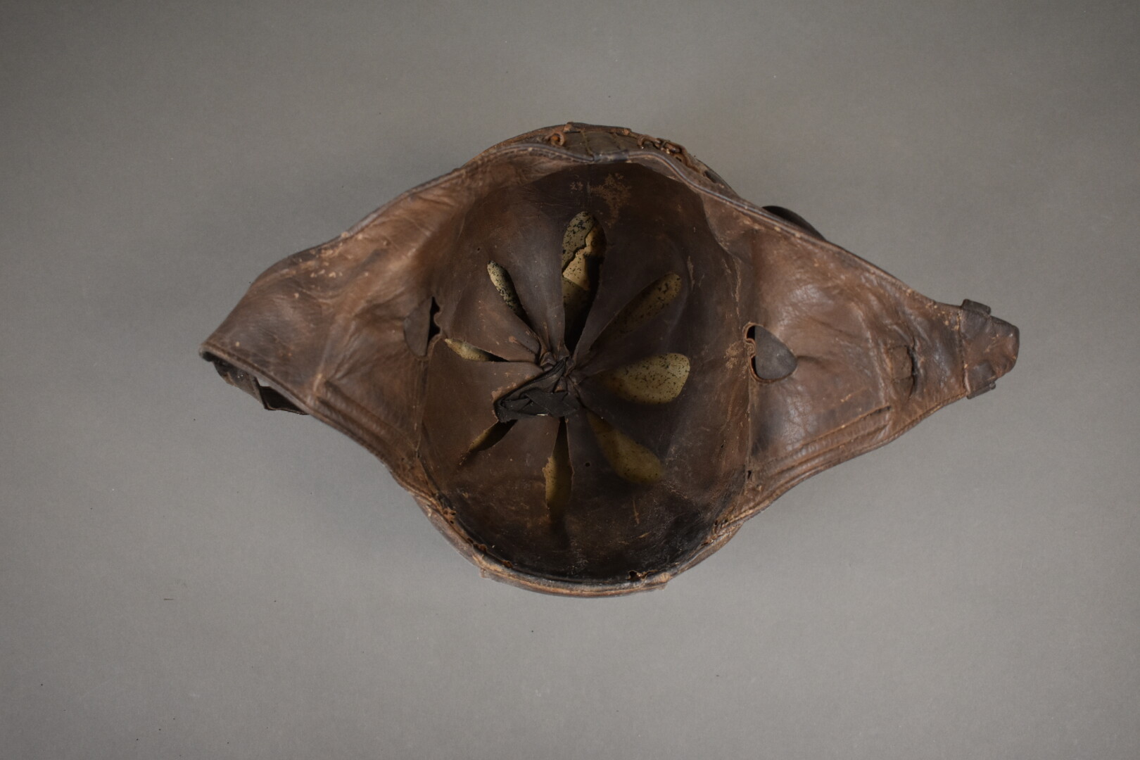 Casque de pilote français Guéneau fabriqué le 15/11/1944 taille 58. Casque habillé de cuir fauve avec son intérieur étiquette fabricant papier décollée mais présente. Etat 1-