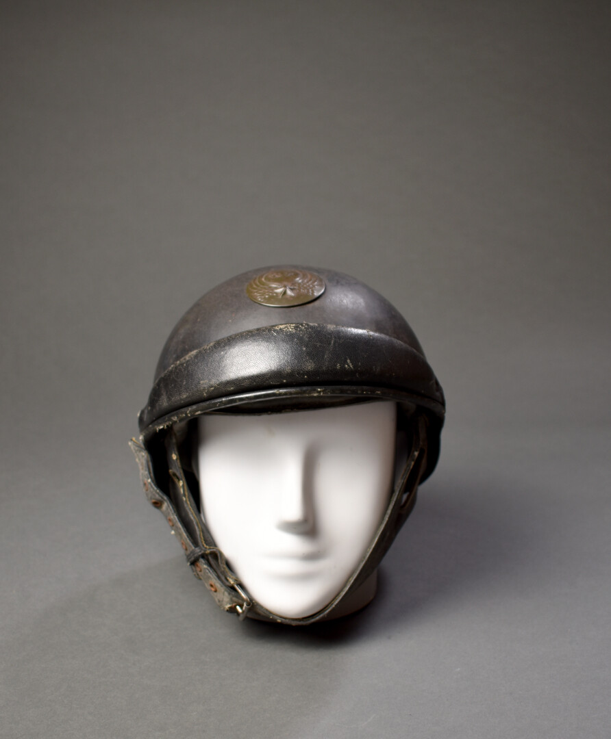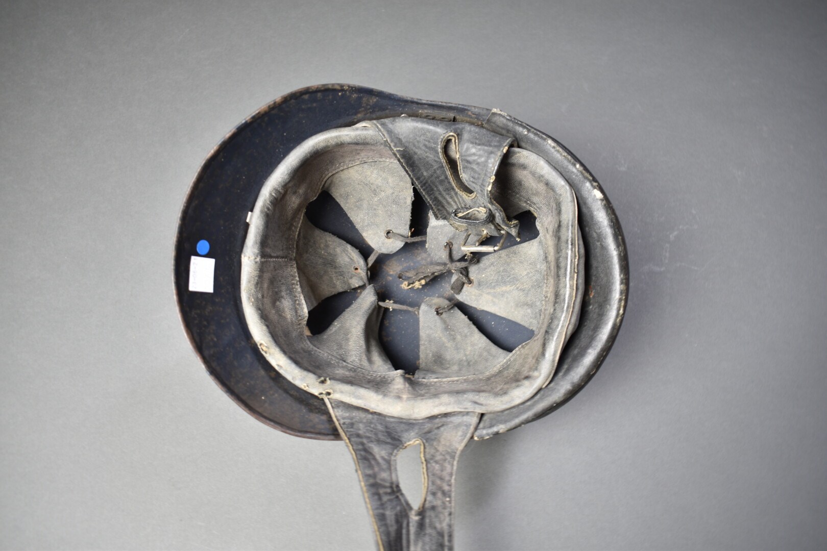 Casque modèle 1935 de troupe motorisée, peinture bleue Louise, garniture cuir noir. Rondache armée de l’Air. Etat 1-.