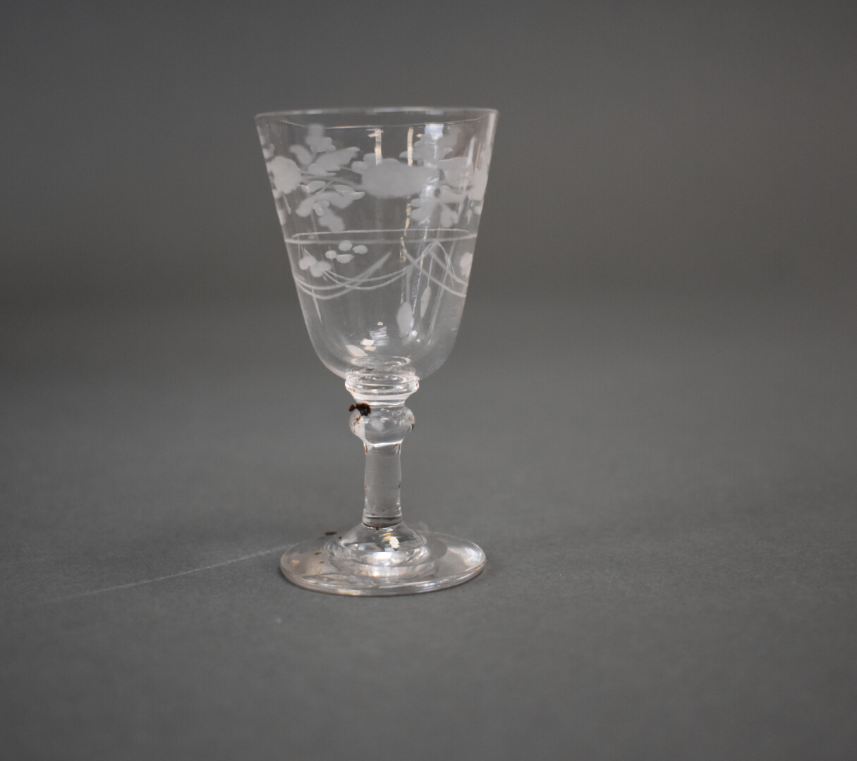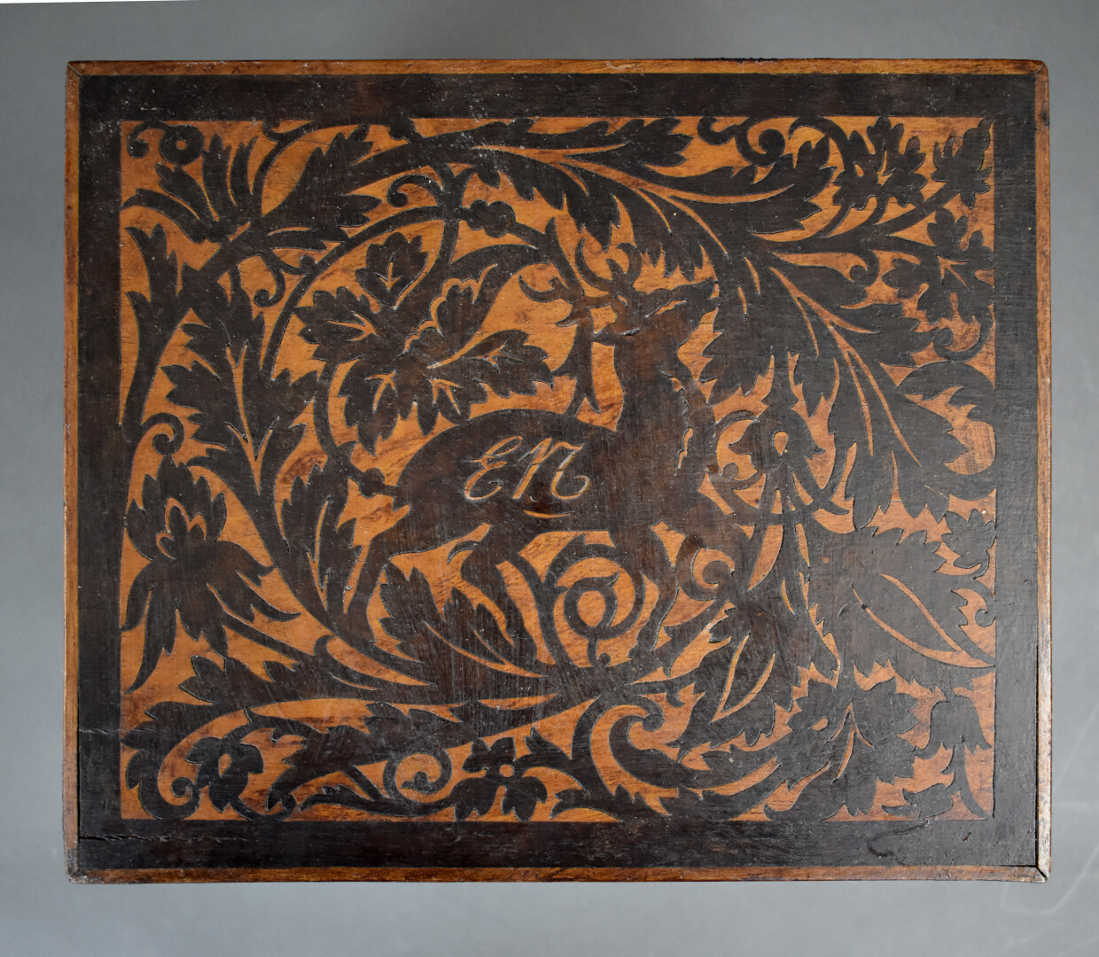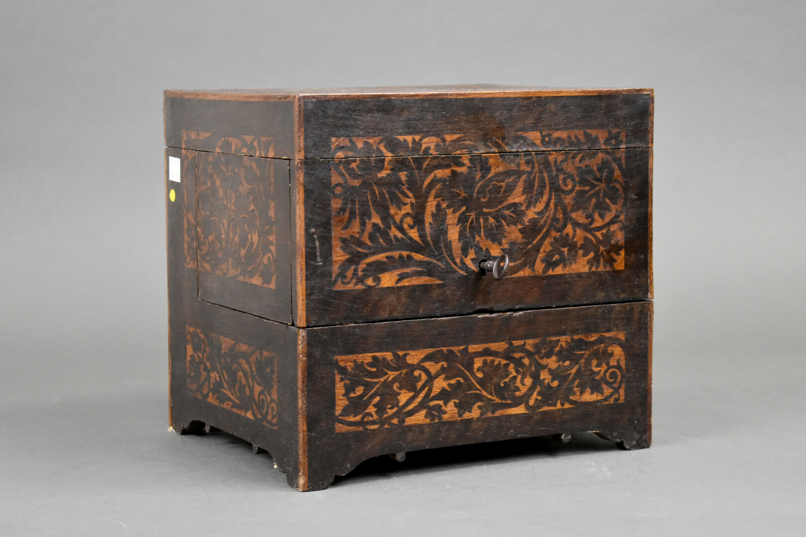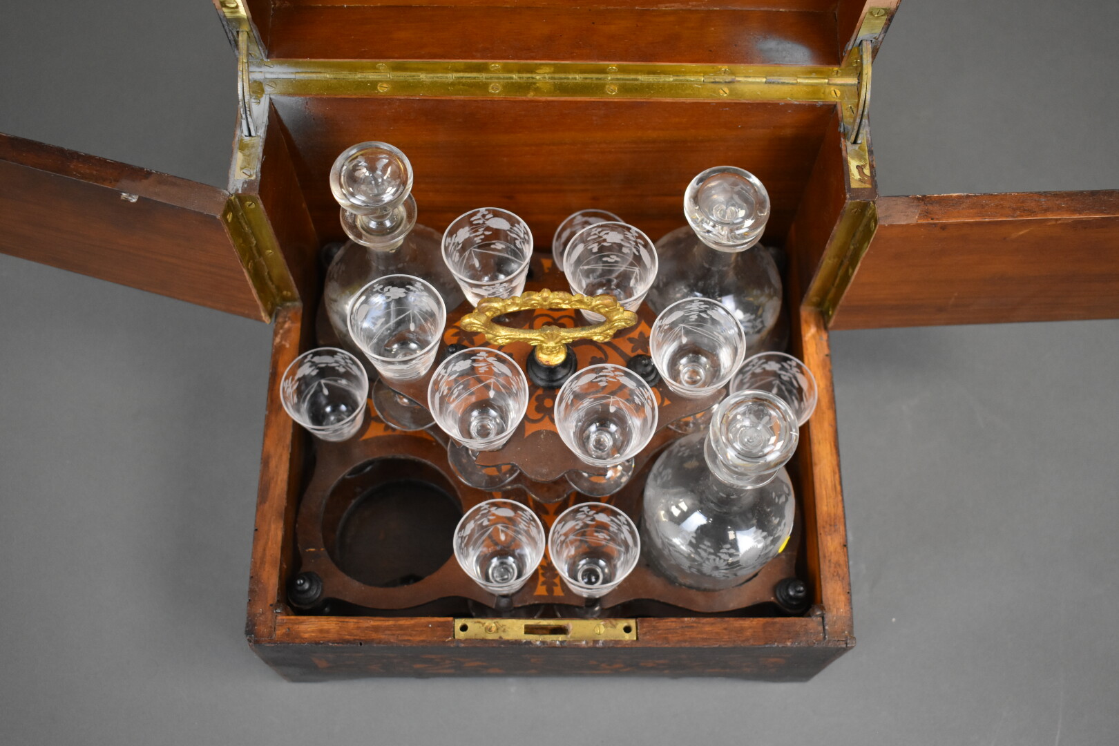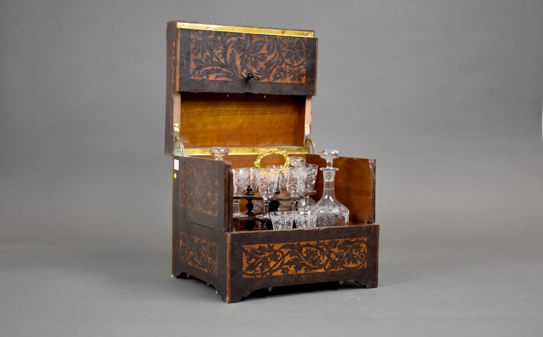 Cave à liqueur en bois de placage à décor marqueté d’acanthes et feuillage (usures et petits éclats). Elle contient 11 petits verres et 3 carafes (dont une avec le bouchon accidenté) en verre à décor gravé de fleurs. Fin du XIXe ou début du XXe siècle. Haut. : 25 cm – Larg. : 26,5 cm – Prof. : 22,5 cm.