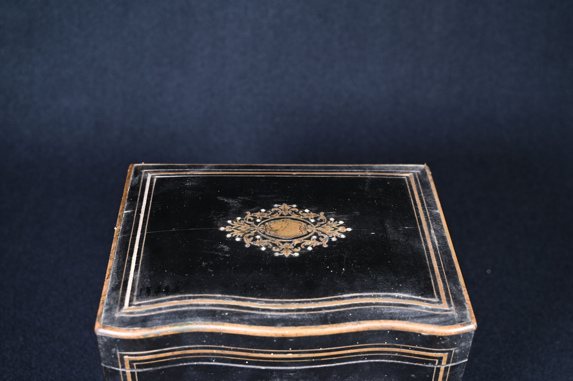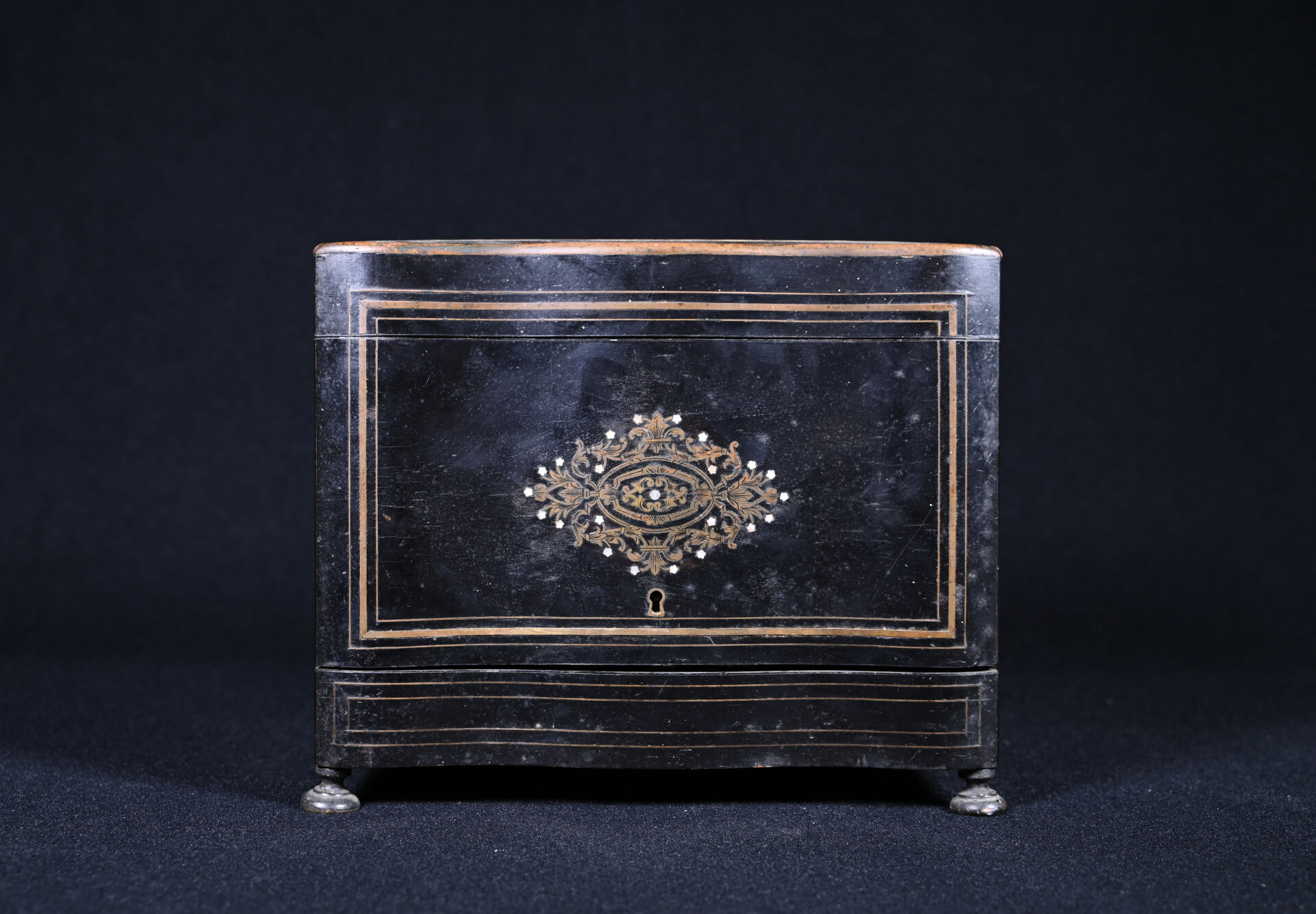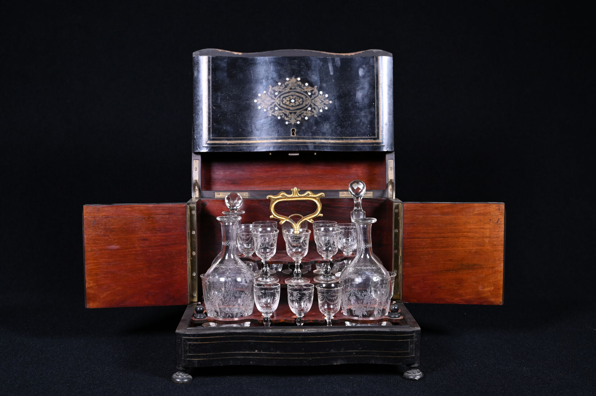 Cave à liqueur en bois noirci à décor marqueté de laiton et nacre (éclats et petits manques). L’intérieur plaqué de palissandre abritant 4 carafes et 16 verres gravés et dépareillés (incomplet). Sans clé. Epoque Napoléon III. Haut. : 28,5 cm – Larg. : 33,5 cm – Prof. : 25,5 cm.