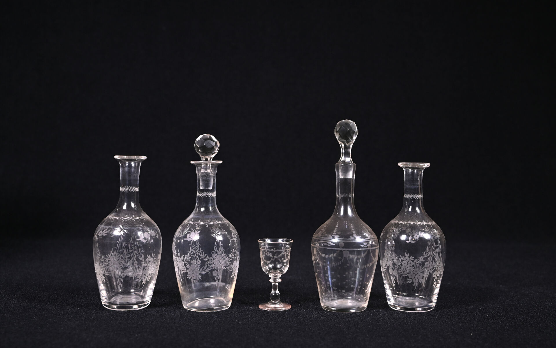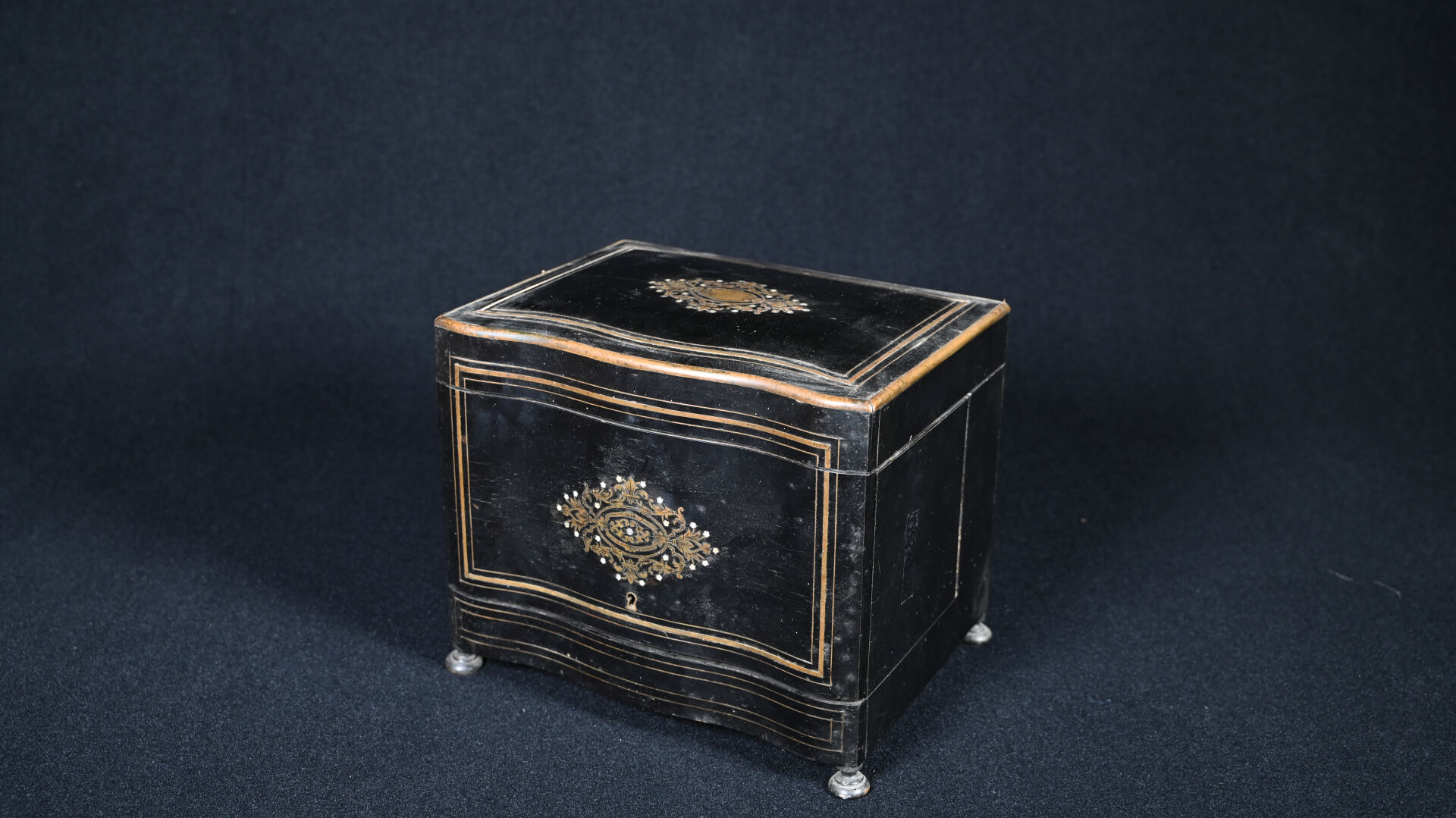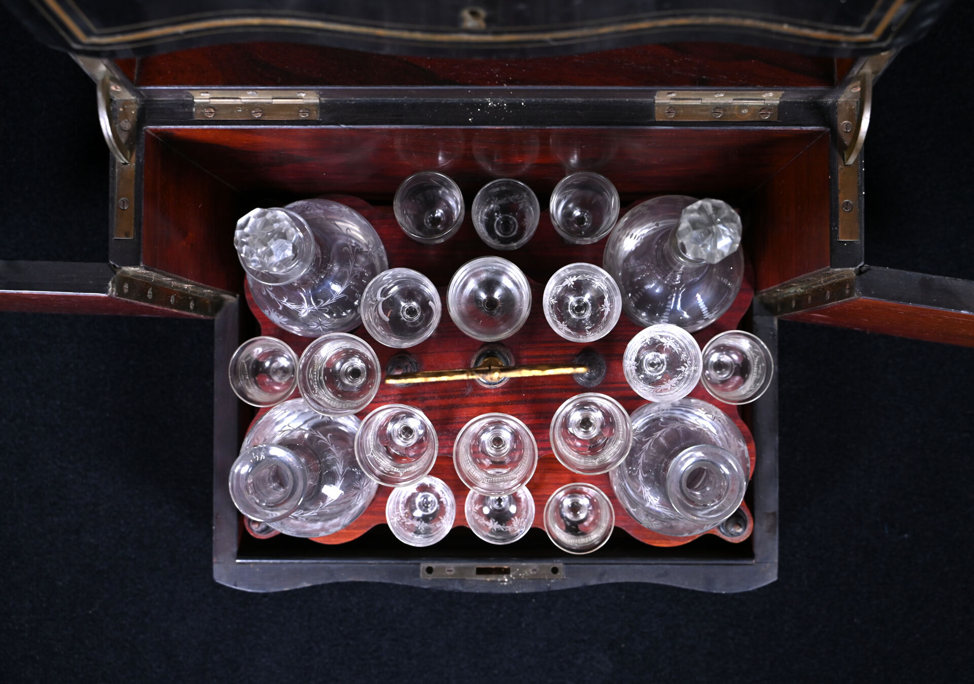 Cave à liqueur en bois noirci à décor marqueté de laiton et nacre (éclats et petits manques). L’intérieur plaqué de palissandre abritant 4 carafes et 16 verres gravés et dépareillés (incomplet). Sans clé. Epoque Napoléon III. Haut. : 28,5 cm – Larg. : 33,5 cm – Prof. : 25,5 cm.