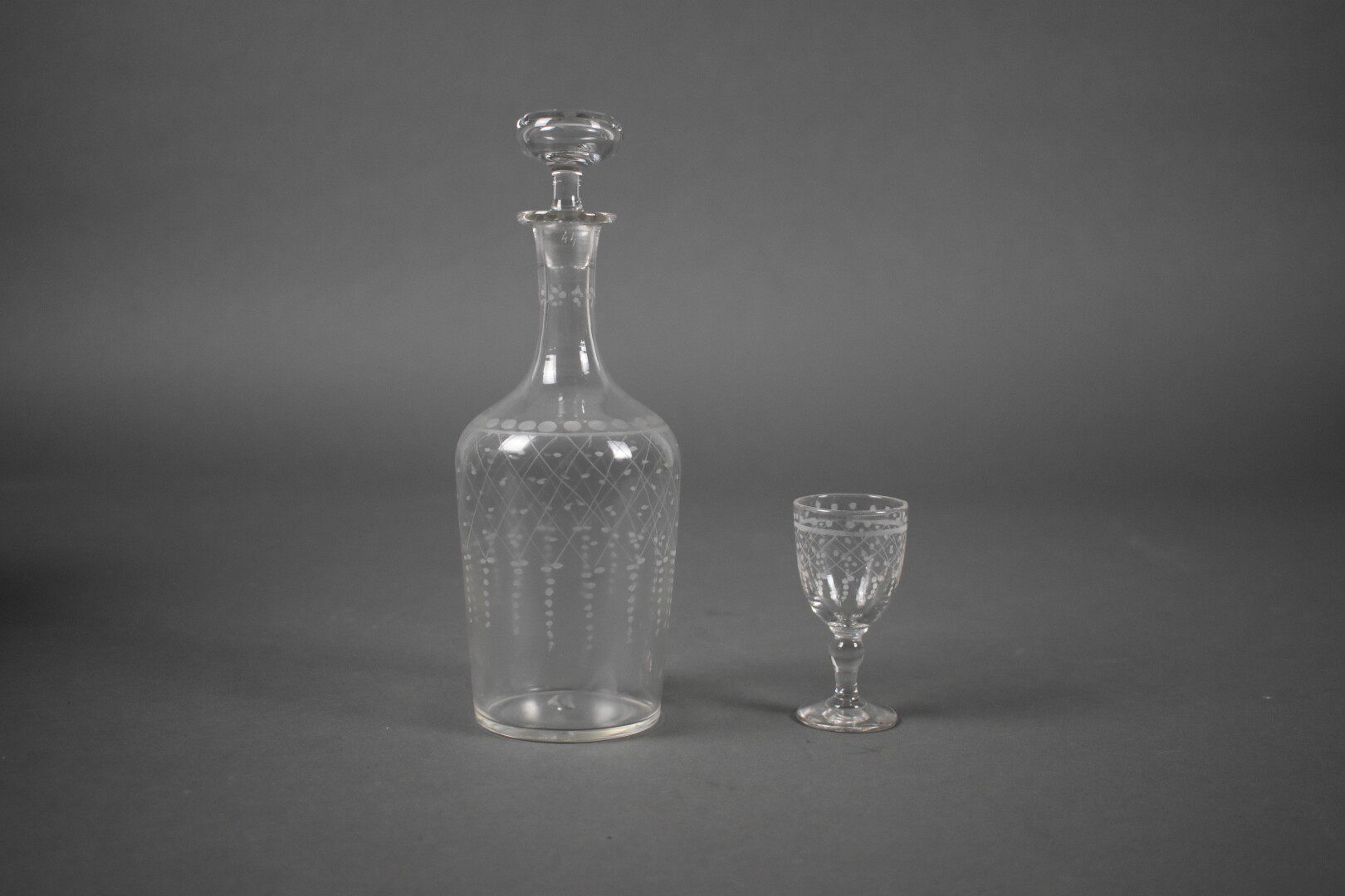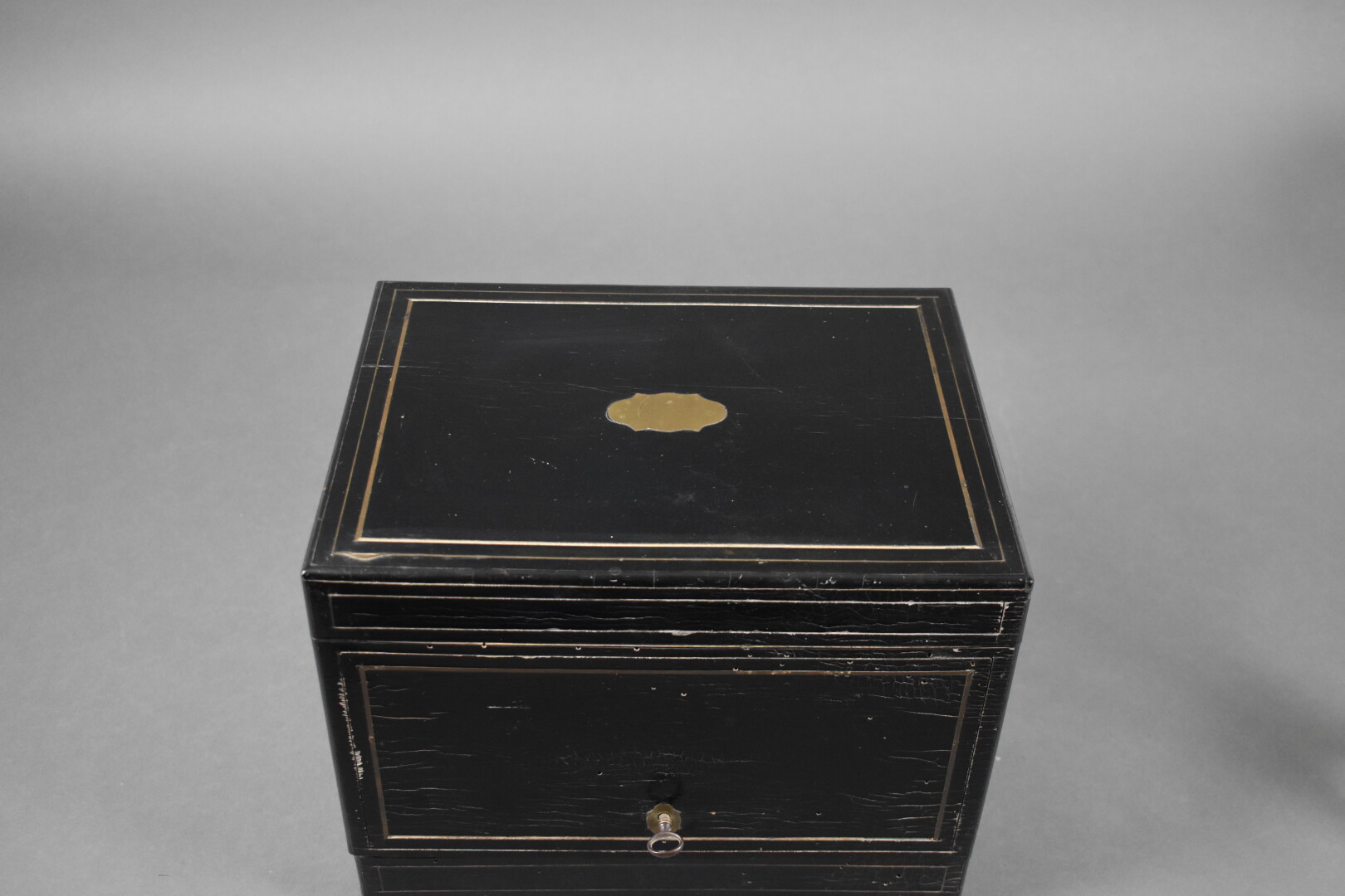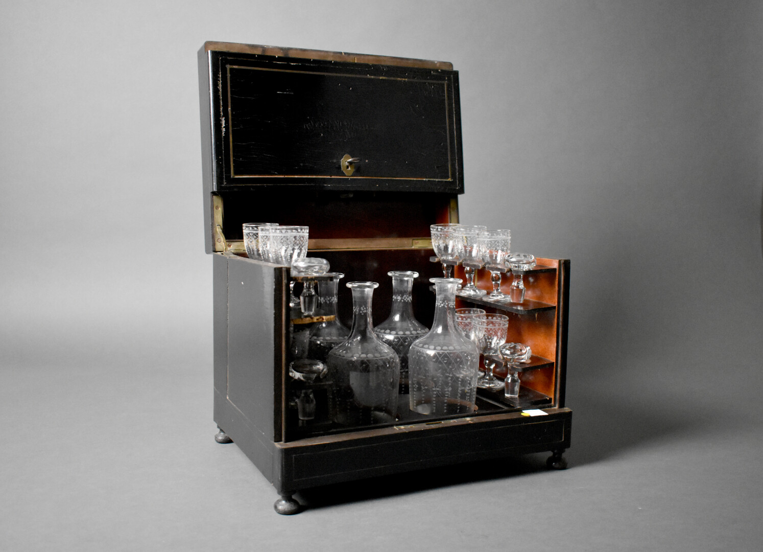 Cave à liqueur en bois noirci et filets de laiton (éclats et manques). Intérieur plaqué de bosis rouge découvrant Quatre carafes et leurs bouchons et 10 verres (manquent deux). Epoque Napoléon III. Haut. : 25 cm.