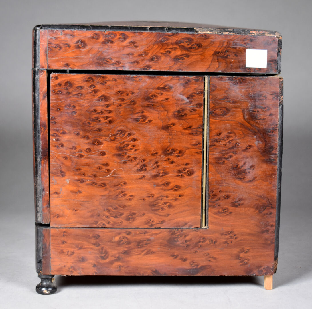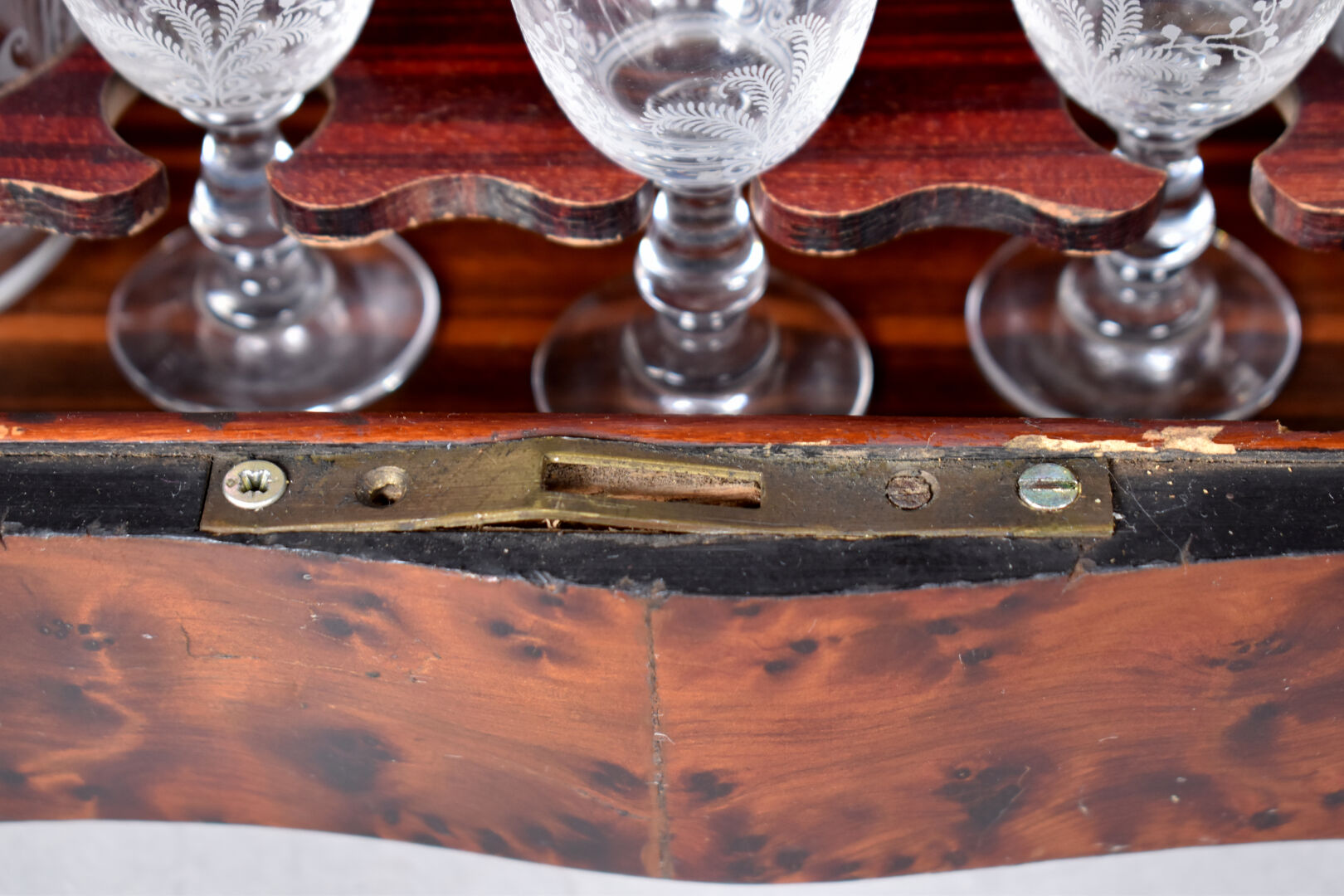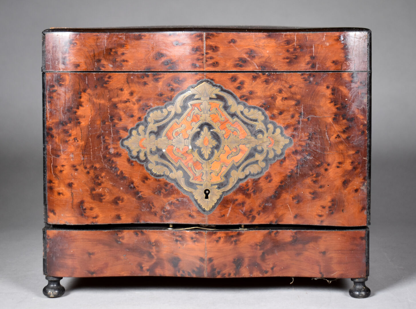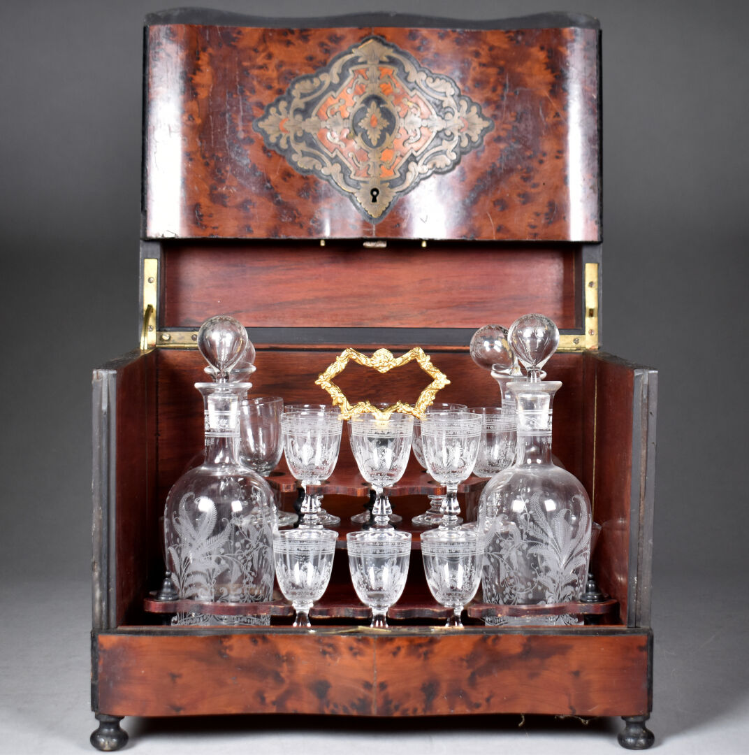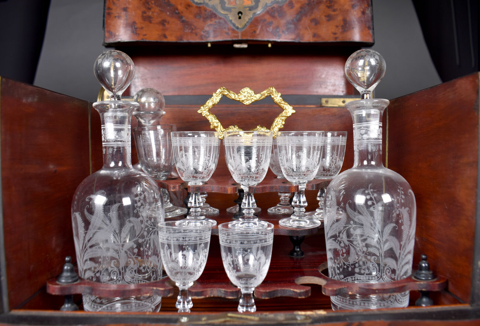 Cave à liqueur en placage de bois à décor marqueté de laiton. L’intérieur comprenant quatre carafes et 13 verres à liqueur, certains à décor de feuillages (manquent 3 et 3 en verre simple rapportés), quelques égrenures, éclats et 2 bouchons cassés. Accidents et manques au placage et aux charnières. Epoque Napoléon III. Dim. Haut. : 27 cm – Larg. : 32 cm – Prof. : 24 cm.