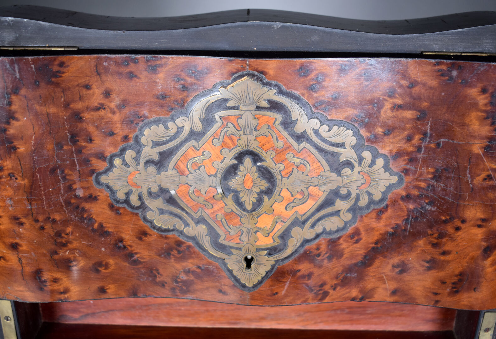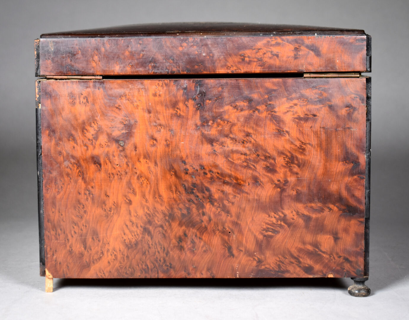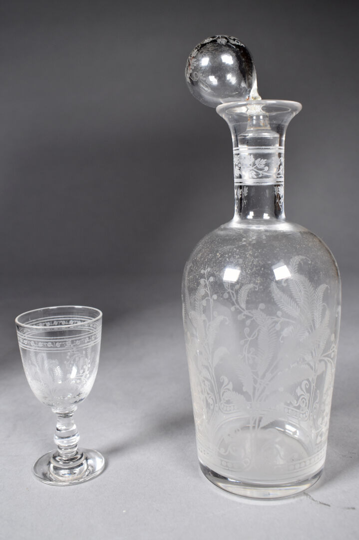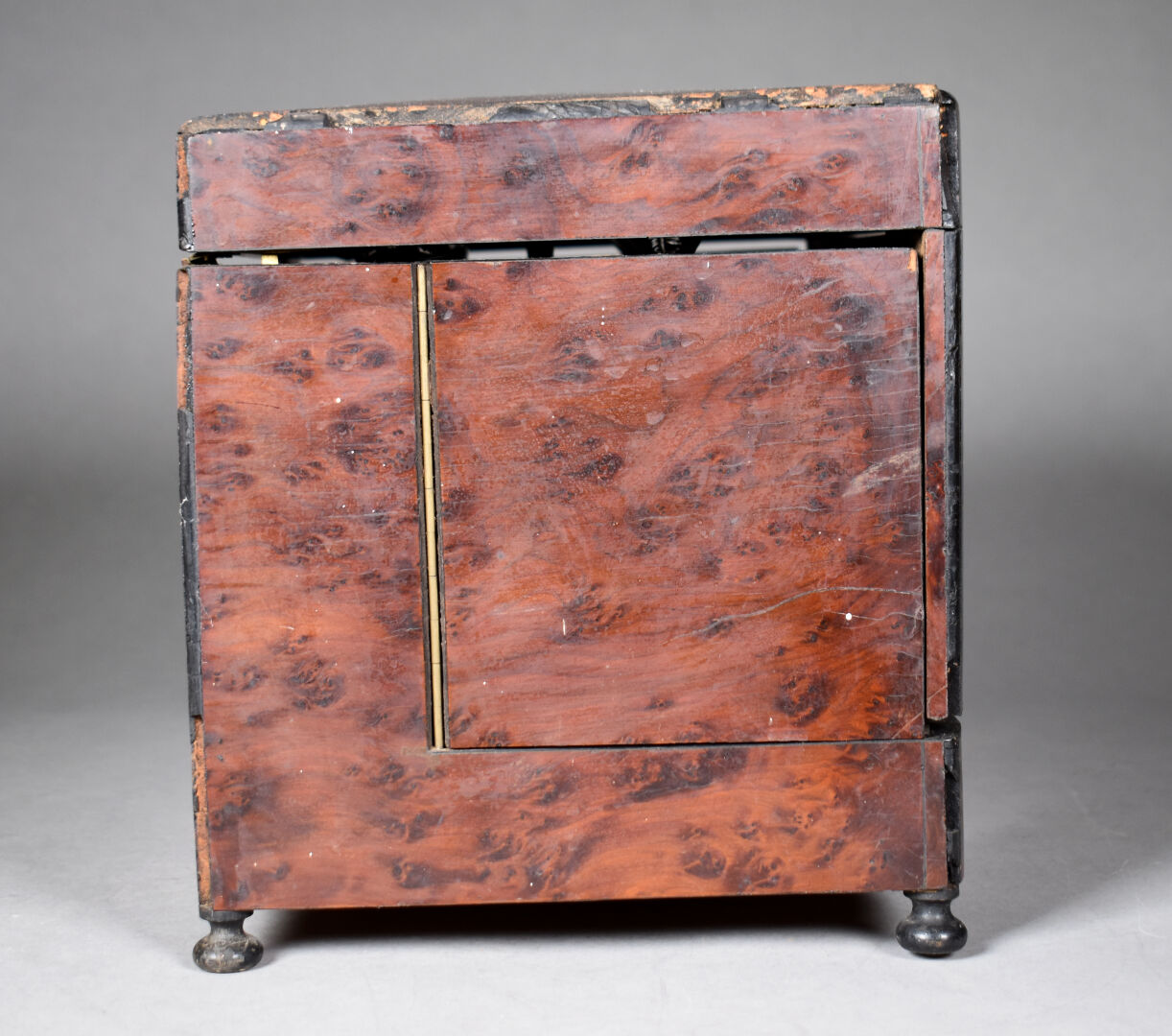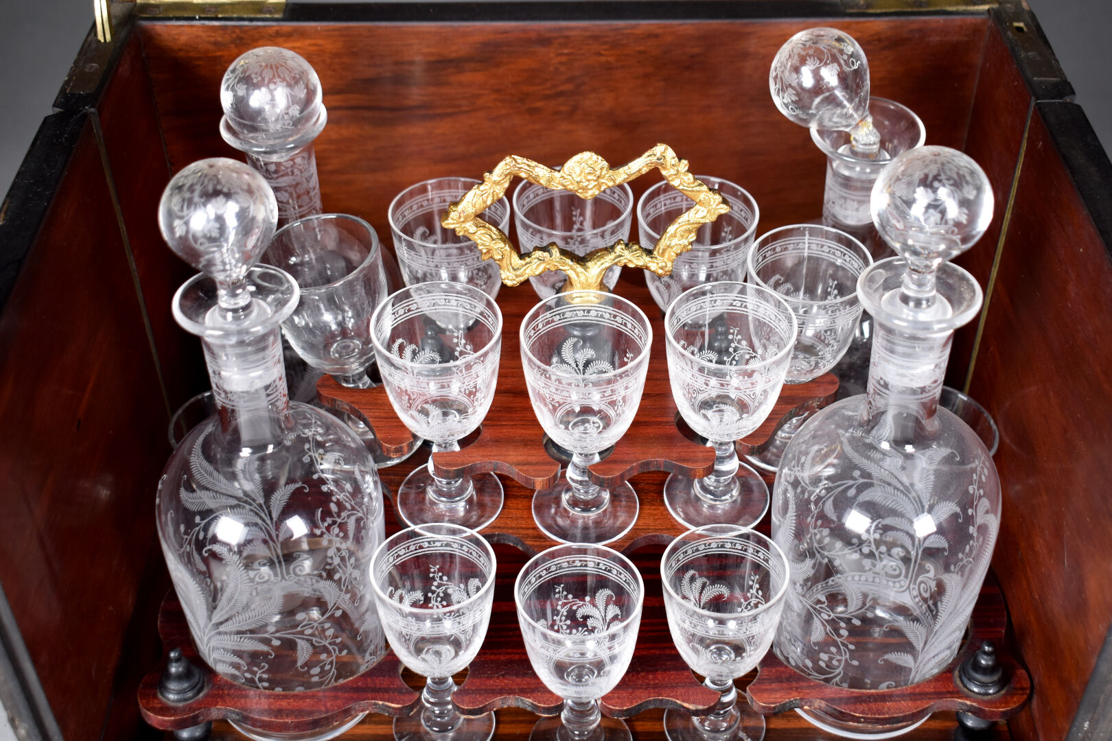 Cave à liqueur en placage de bois à décor marqueté de laiton. L’intérieur comprenant quatre carafes et 13 verres à liqueur, certains à décor de feuillages (manquent 3 et 3 en verre simple rapportés), quelques égrenures, éclats et 2 bouchons cassés. Accidents et manques au placage et aux charnières. Epoque Napoléon III. Dim. Haut. : 27 cm – Larg. : 32 cm – Prof. : 24 cm.