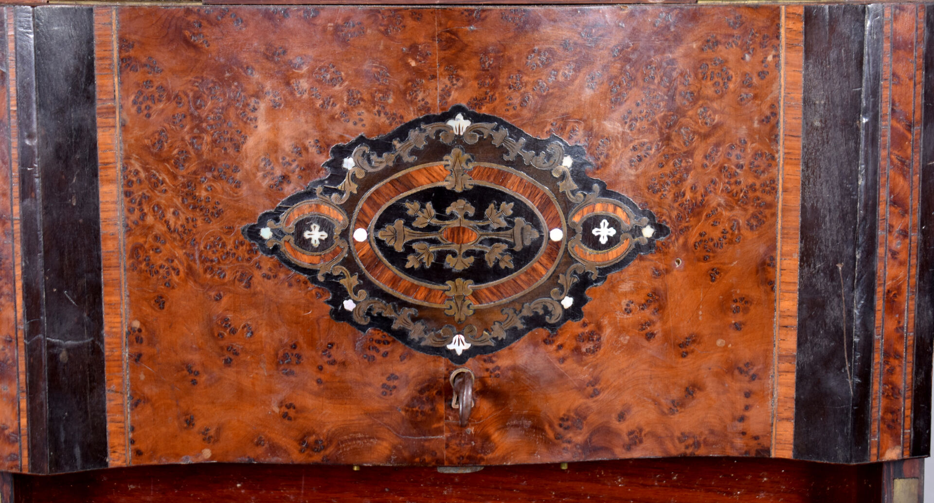 Cave à liqueur en placage de loupe de noyer, amarante et bois de rose, à décor marqueté de laiton et nacre. L’intérieur plaqué d’acajou (usures et restaurations). Vide de son contenu. Haut. : 26,5 cm. Larg. : 32,5 cm. Prof. : 24 cm.