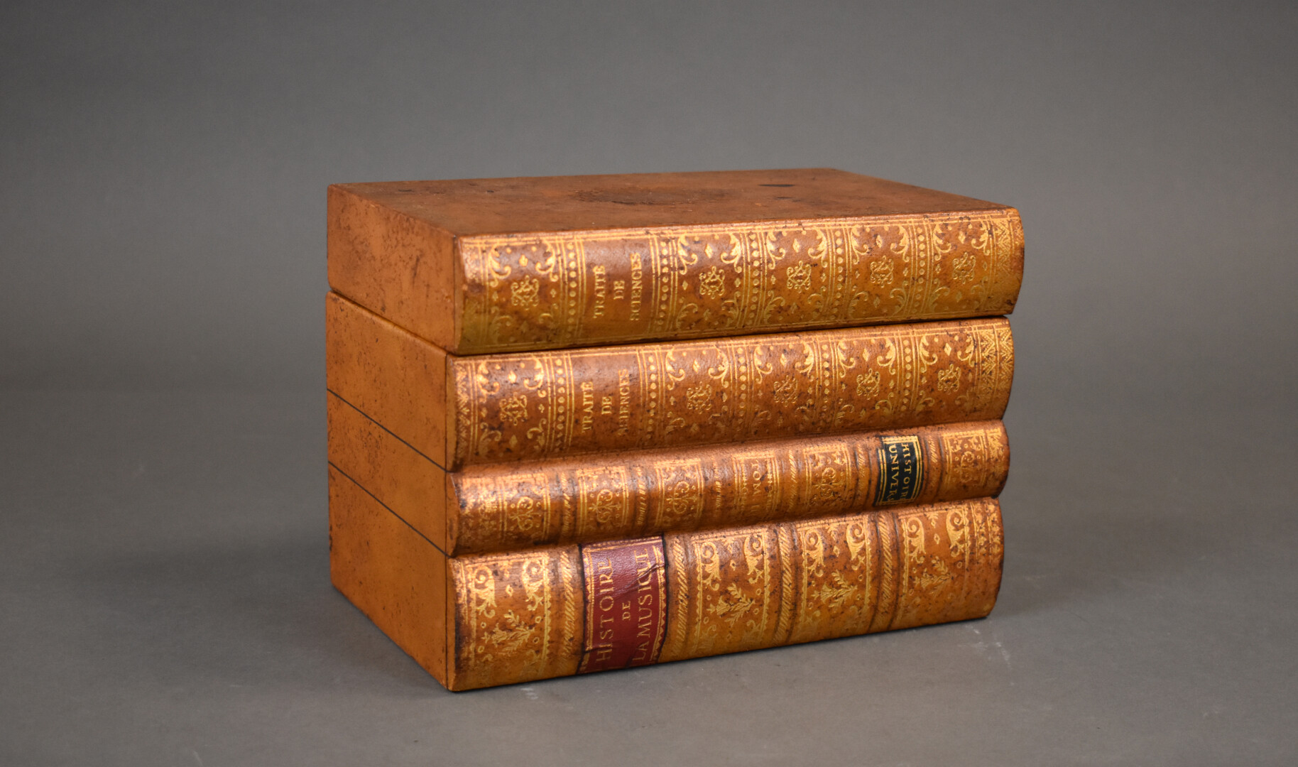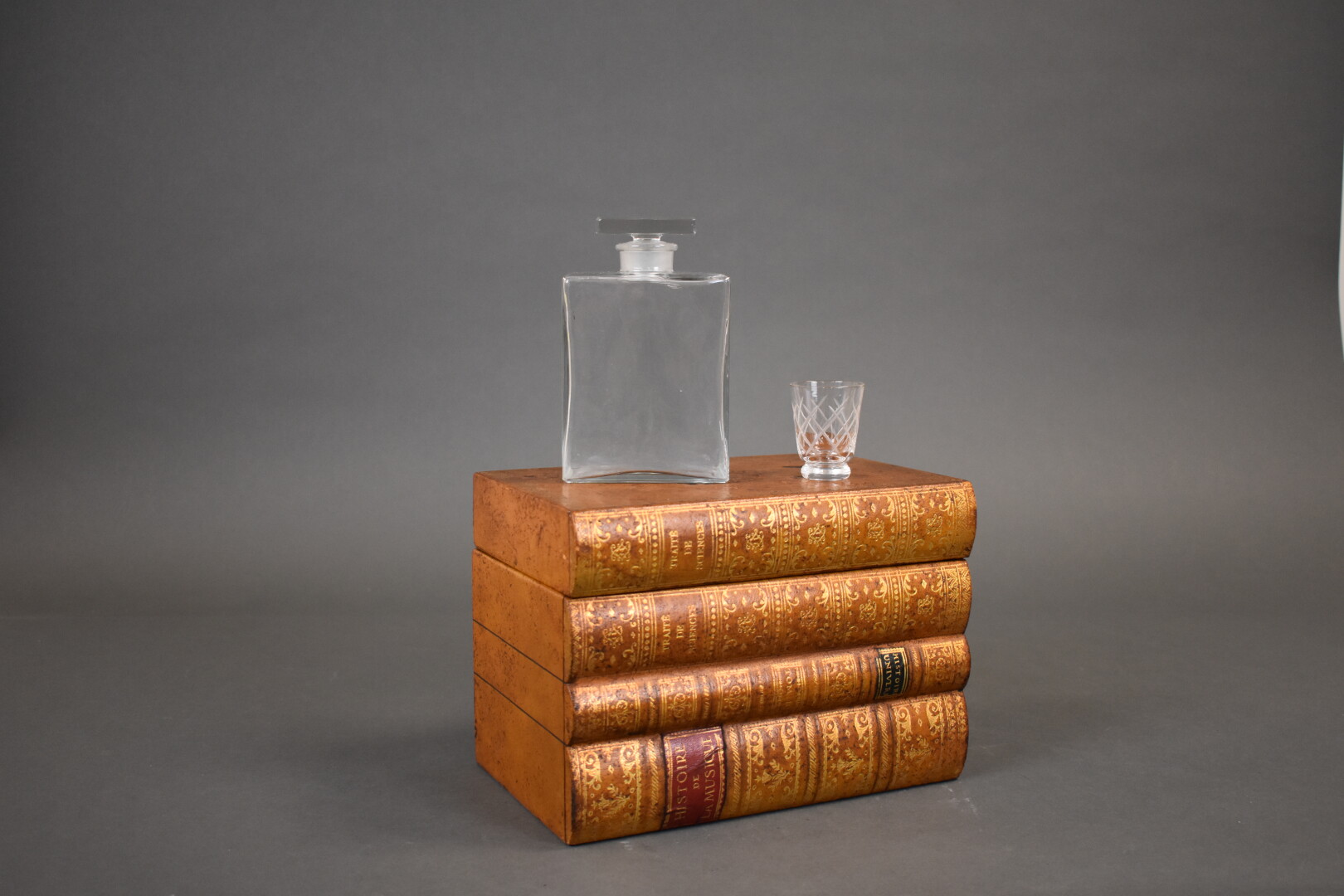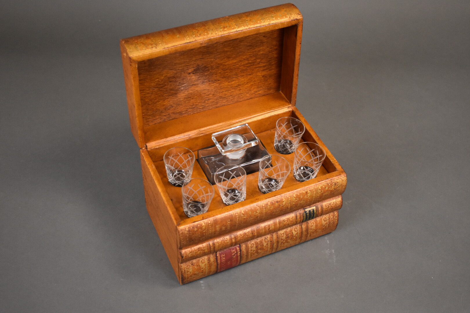 Cave à liqueur simulant trois livres empilés gainés de cuir. Elle contient 6 verres et un flacon avec son bouchon en cristal. XXe siècle.