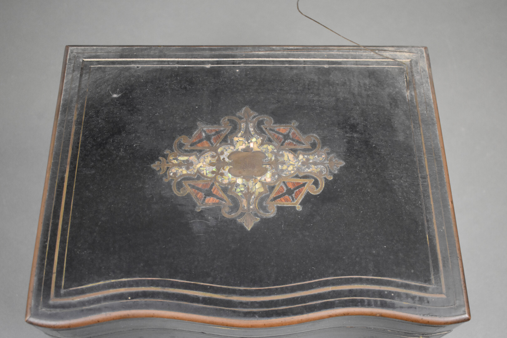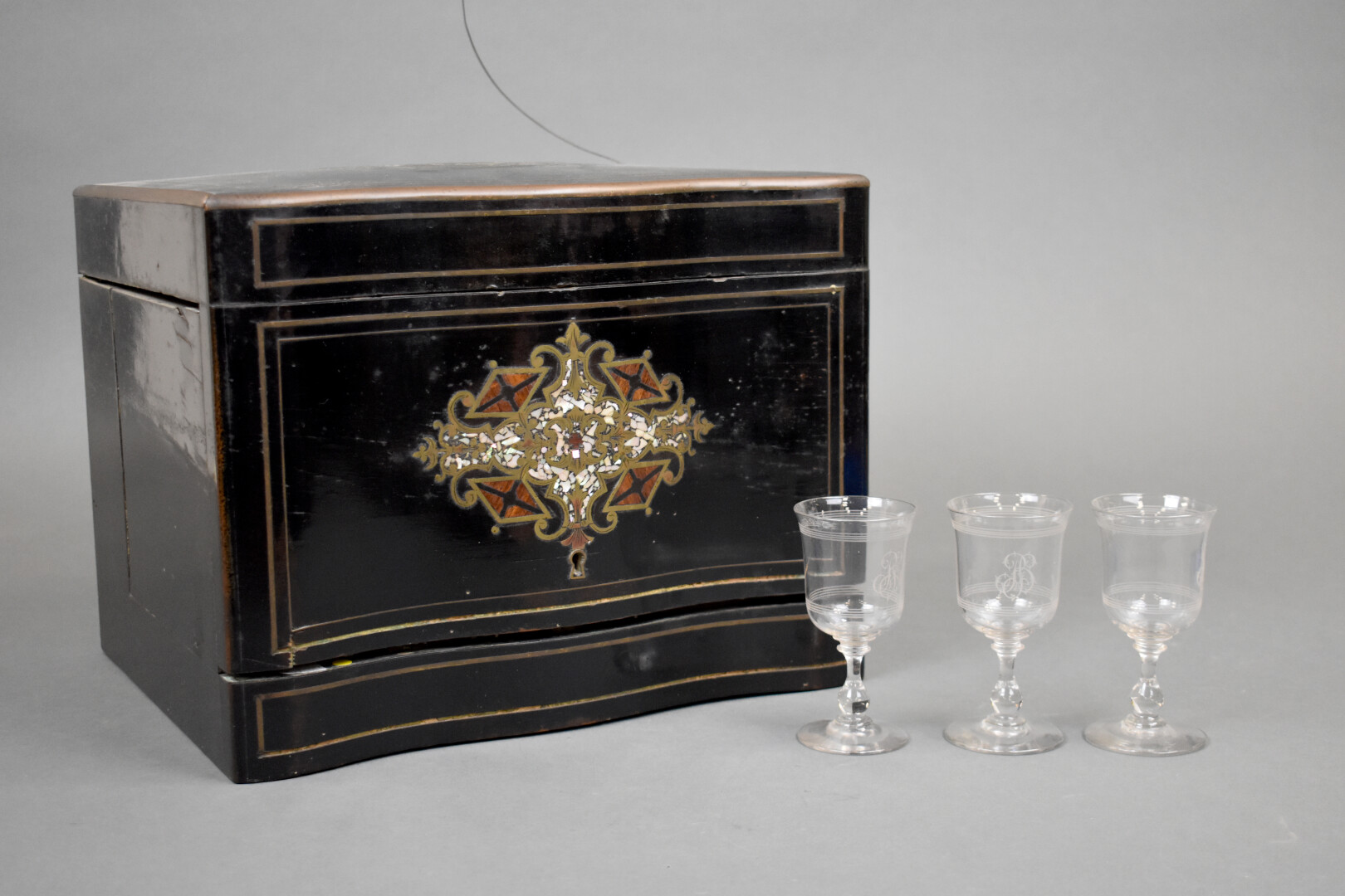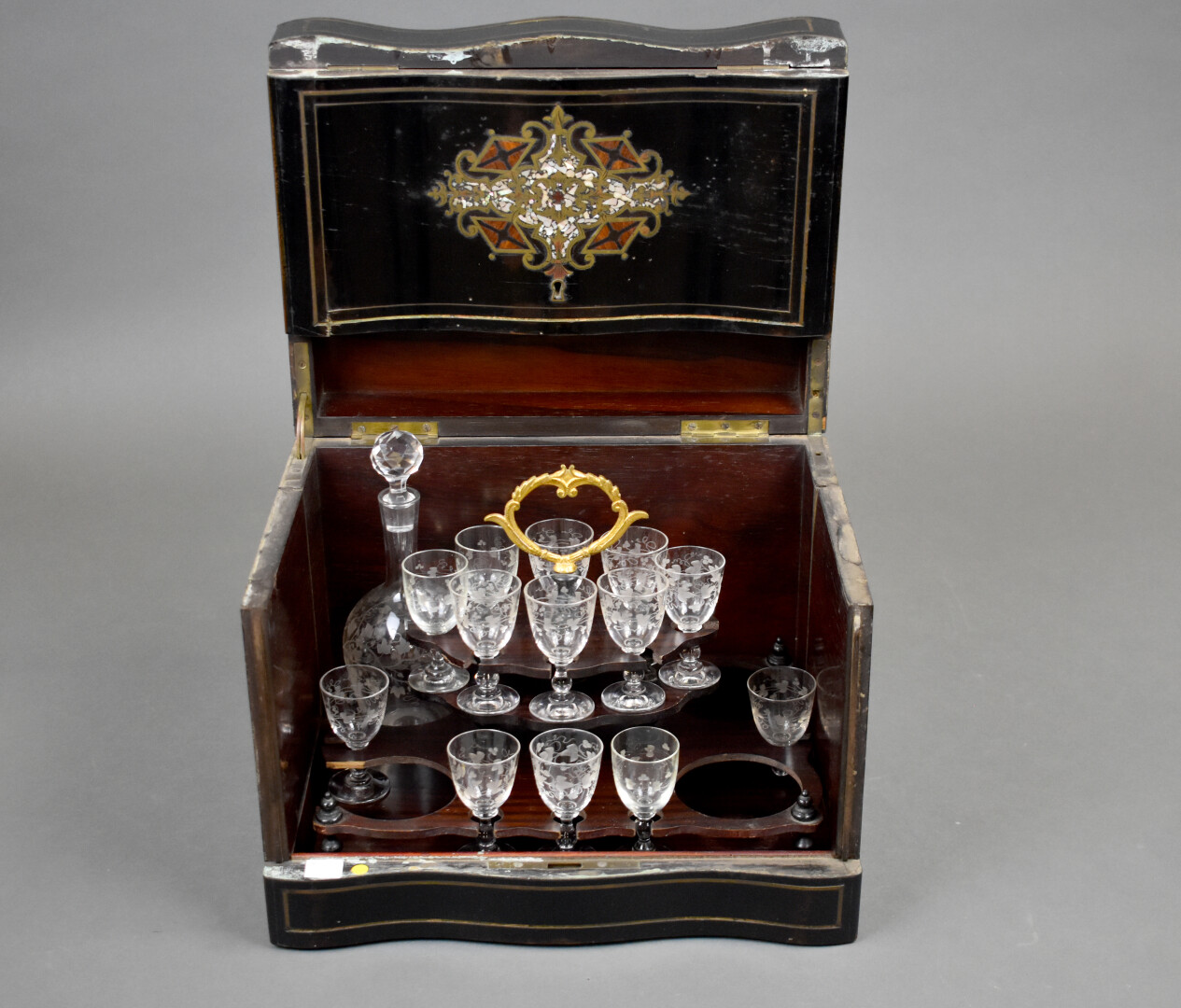 Cave à liqueurs en bois noirci à décor marqueté de laiton et burgaud (accidents et manques). Manquent 3 carafes et un verre accidenté. Époque Napoléon III. On joint trois autres verres.