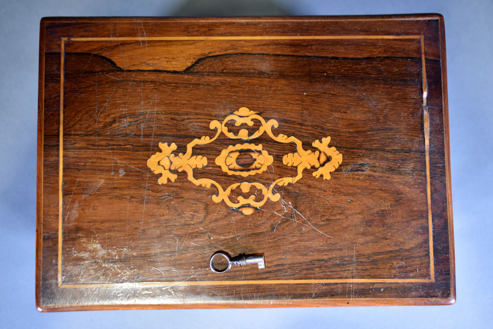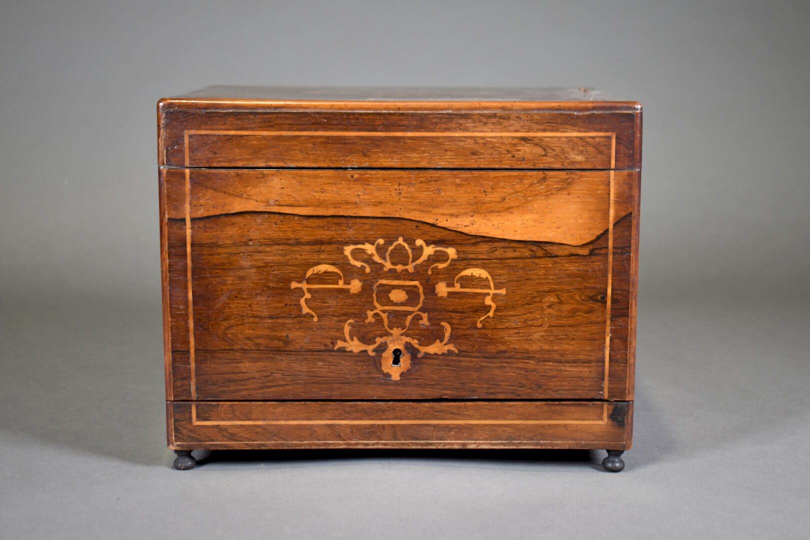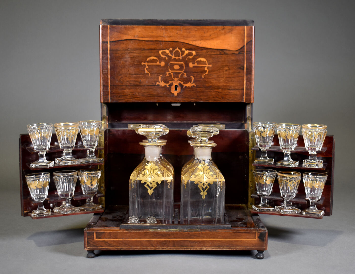 Cave à liqueurs en palissandre à décor marqueté de bois blond. Intérieur complet en cristal à décor en dorure (usures) avec 4 carafes et 12 verres à liqueur (usures et petits éclats, fond à refixer).