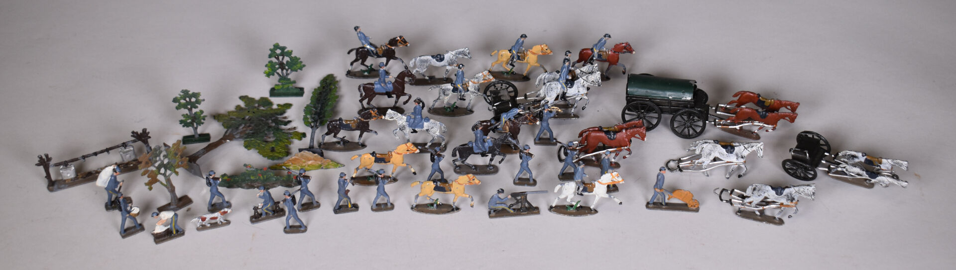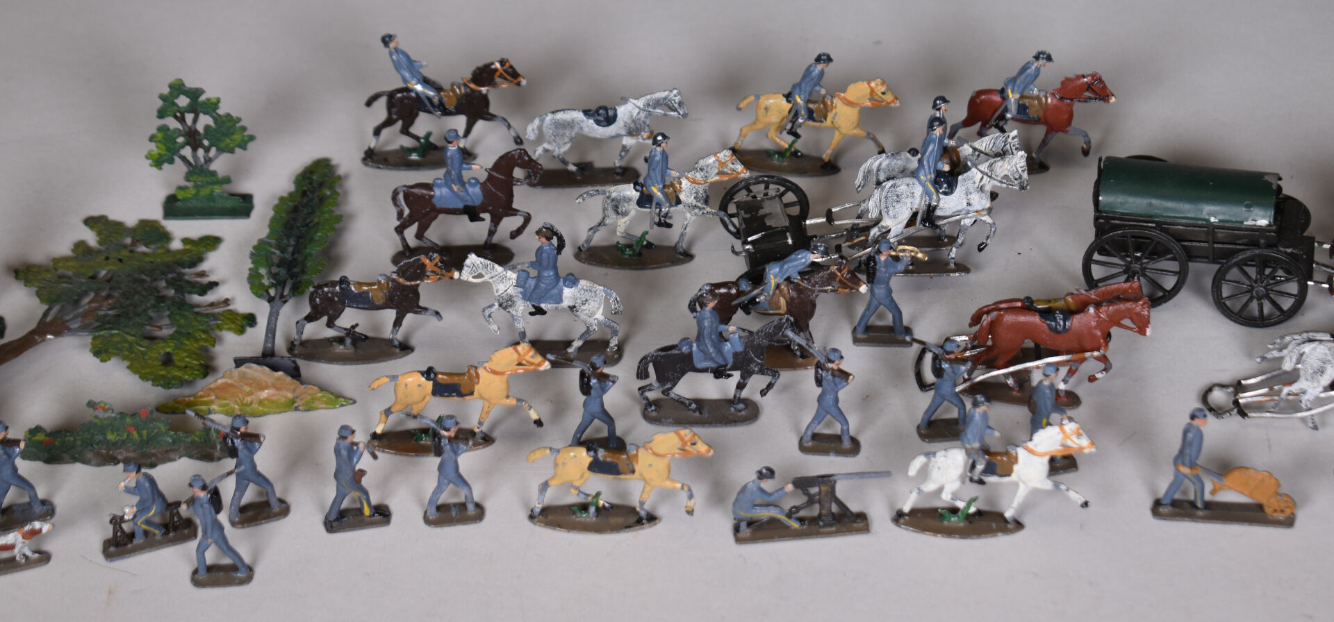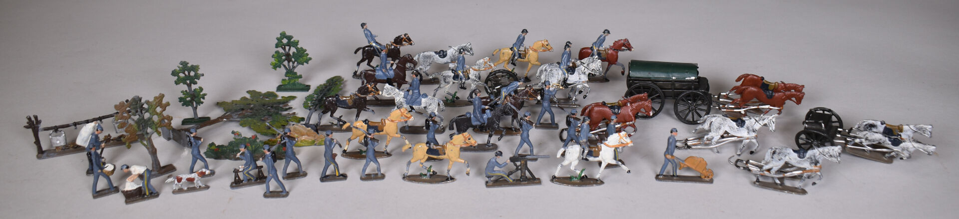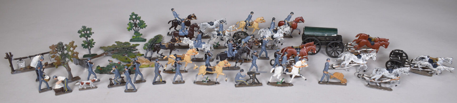 CBG Mignot demi rond de bosse soldats de plomb, guerre de 1914 comprenant cavaliers, intendances , artillerie et divers. Éléments pouvant composer un diorama. État d’usage.