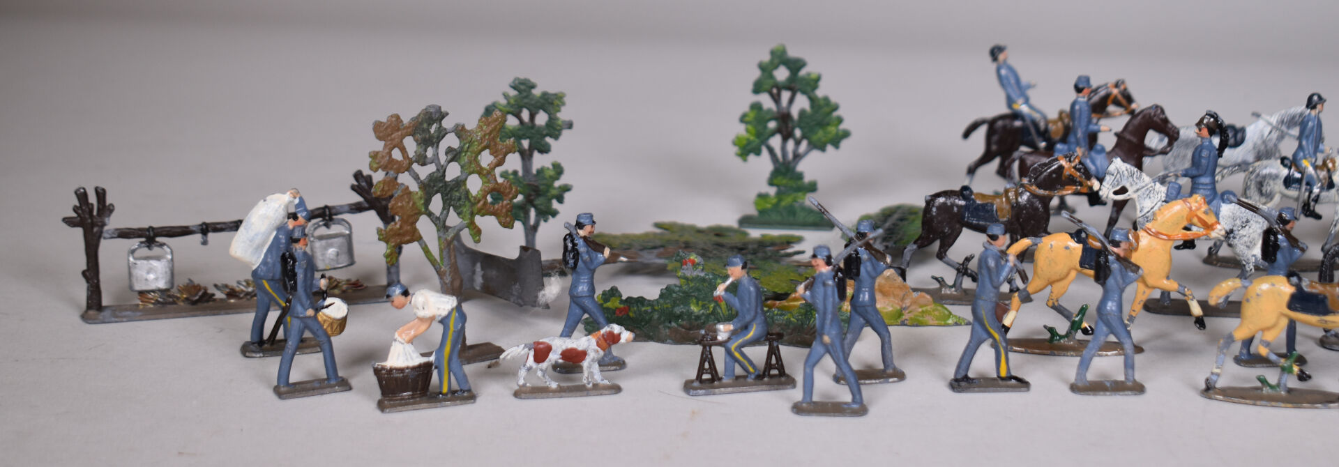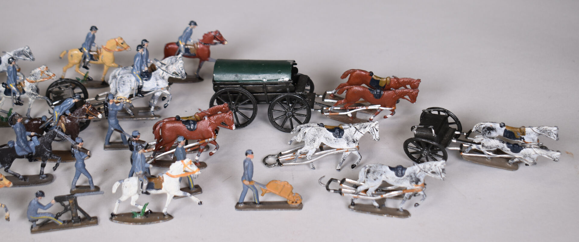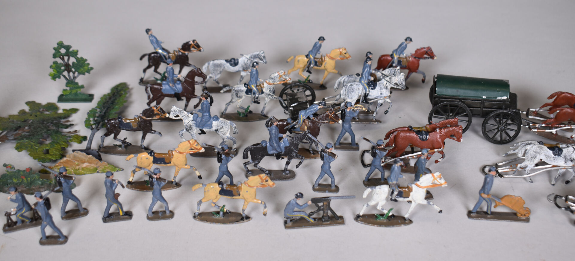 CBG Mignot demi rond de bosse soldats de plomb, guerre de 1914 comprenant cavaliers, intendances , artillerie et divers. Éléments pouvant composer un diorama. État d’usage.