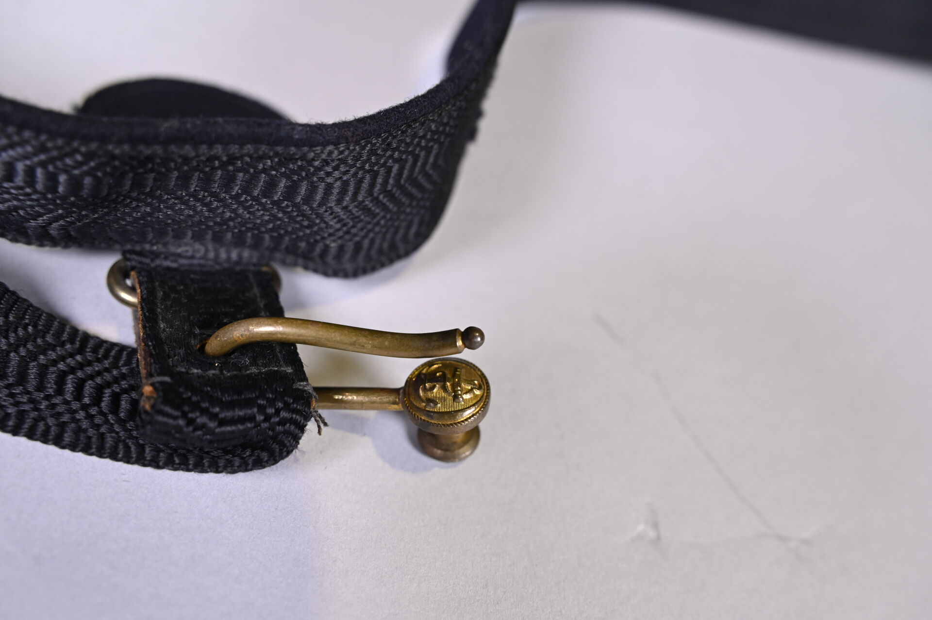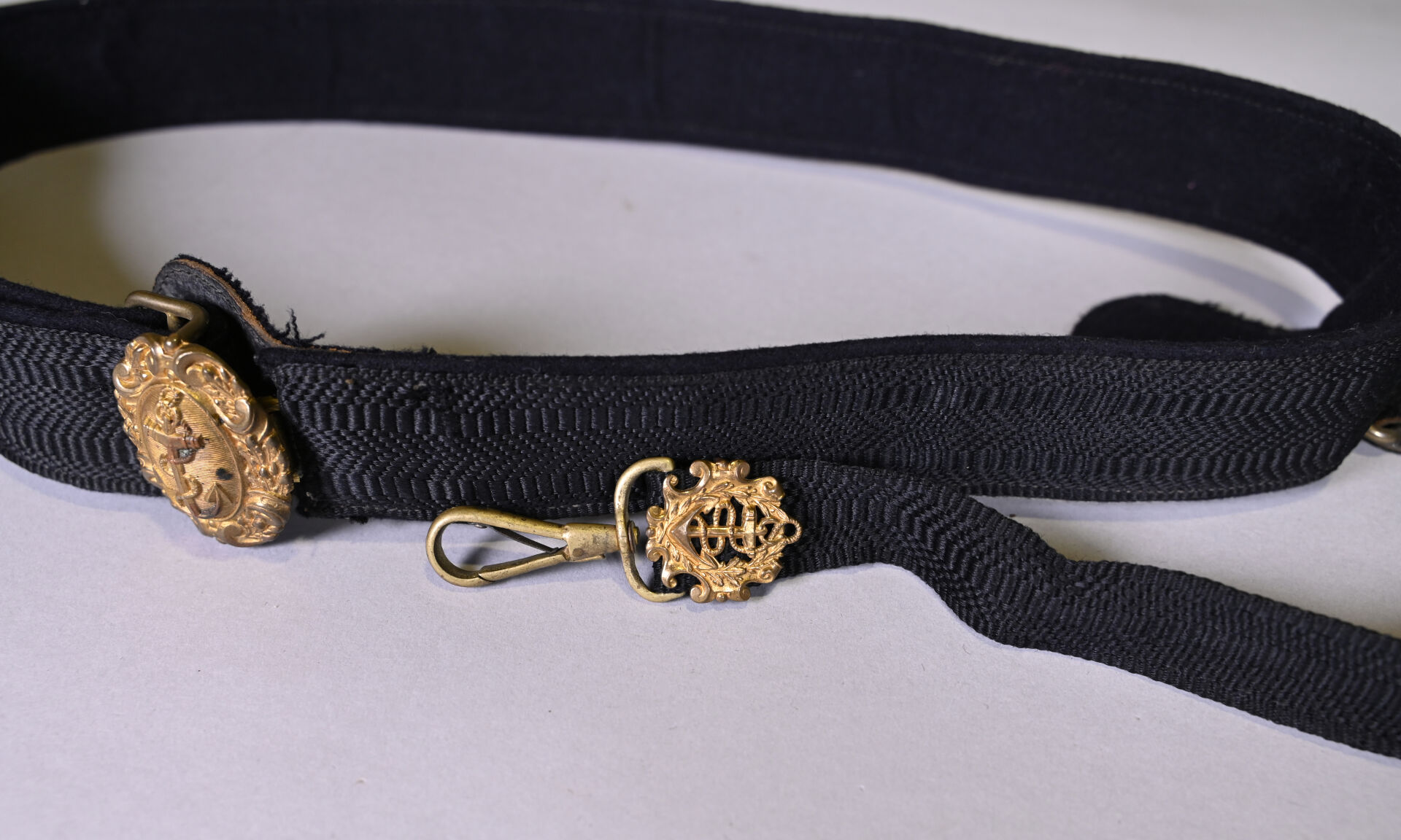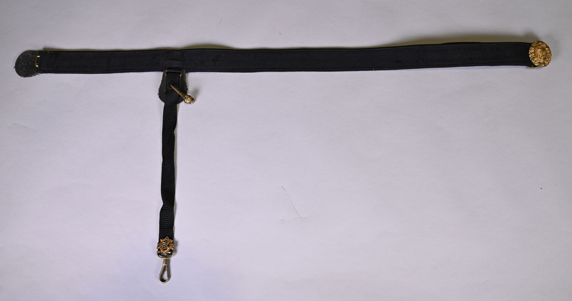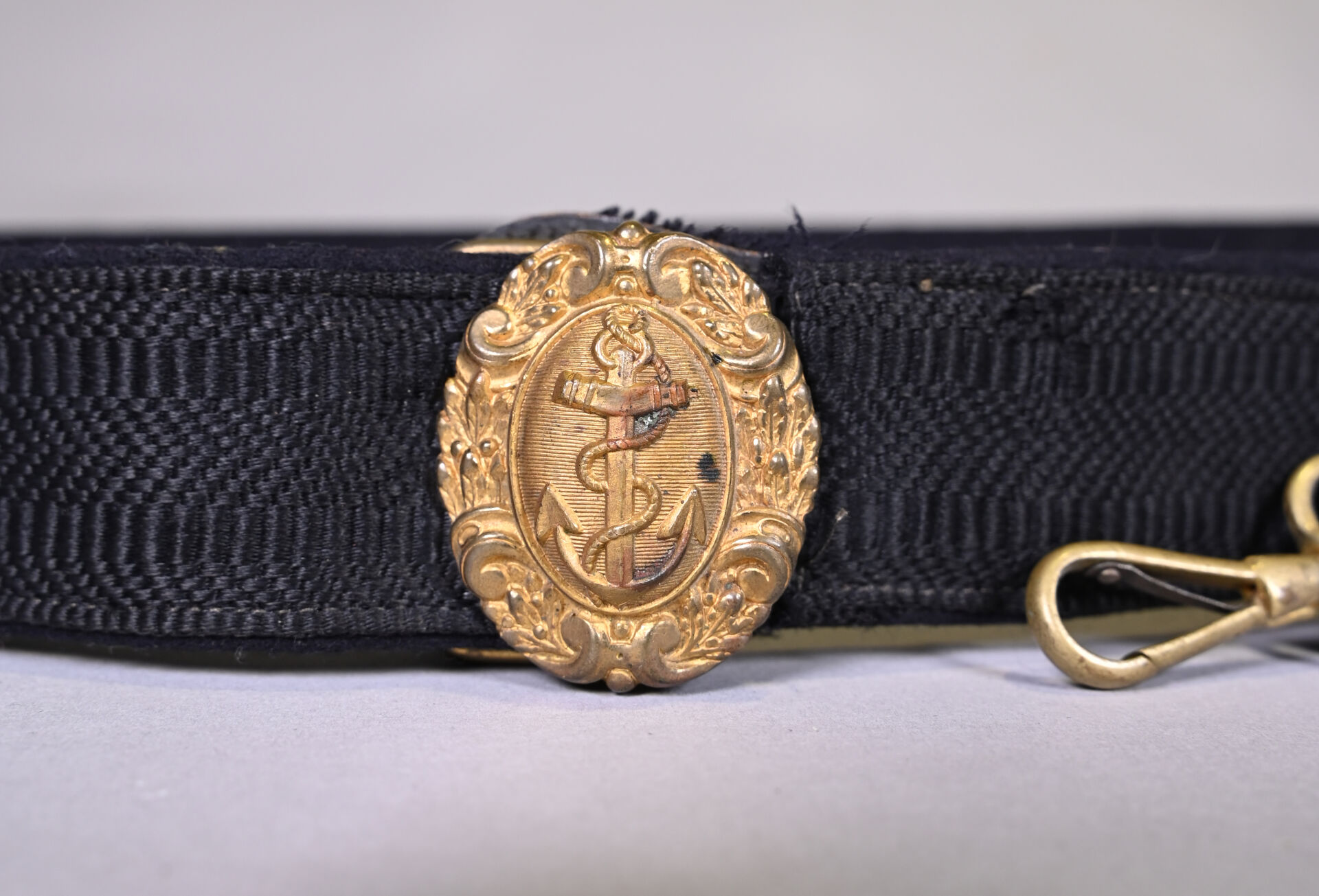 Ceinturon porte-épée. Marine française XIXe siècle. Plateau ovale à l’encre étalingué. Corps du ceinturon en passementerie de cannetilles noires. État 1.