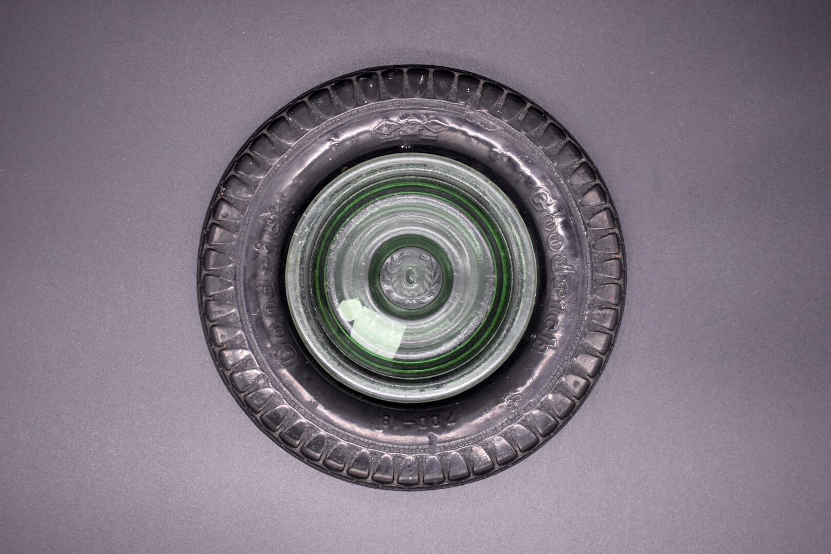 Cendrier en caoutchouc et verre vert publicitaire en forme de pneu « GOODRICH – 700-18 ». Diam. : 17 cm.