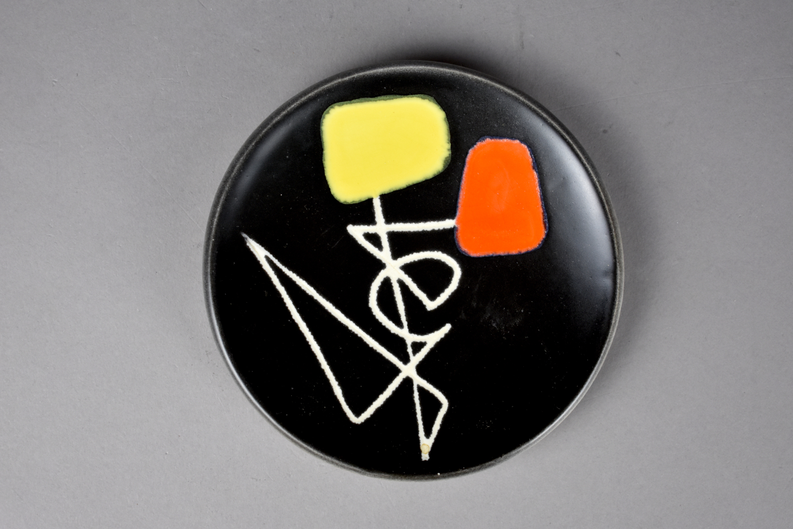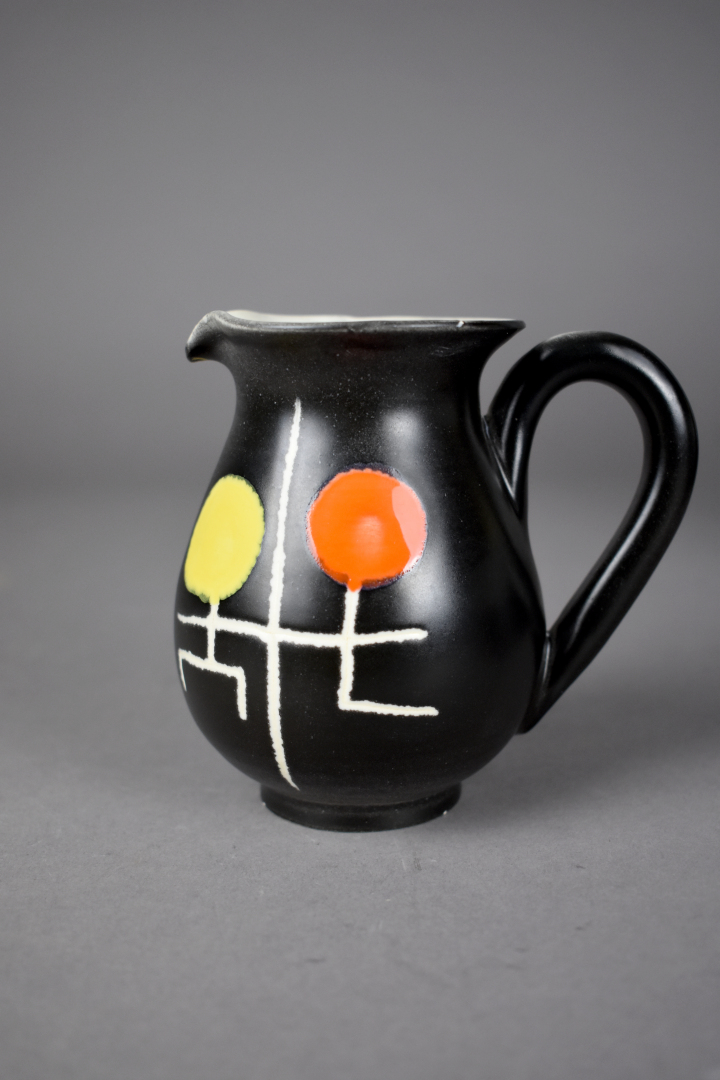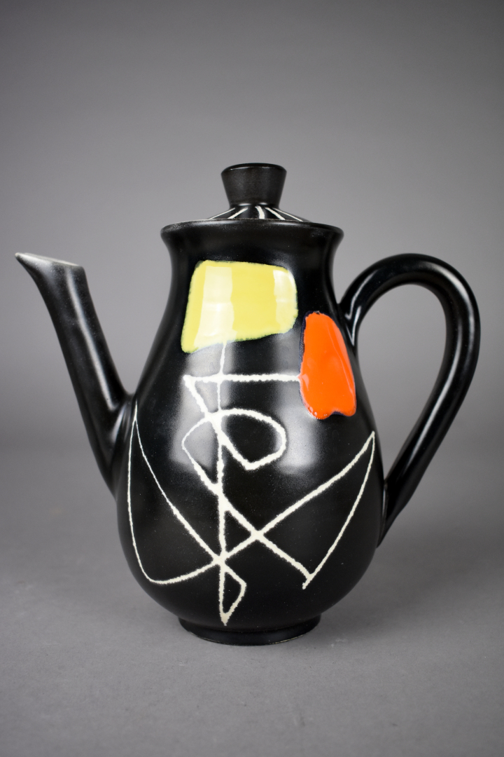 CERENNE à Vallauris. Service à thé modèle « King »en céramique émaillée en polychromie de motifs géométriques sur fond noir (éclats). Il comprent une théière, un pot à lait, un pot à sucre, six tasses et sous-tasses. Marqués. Vers 1950.