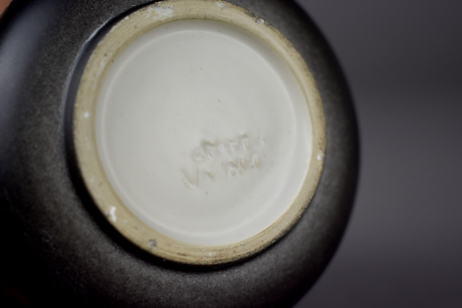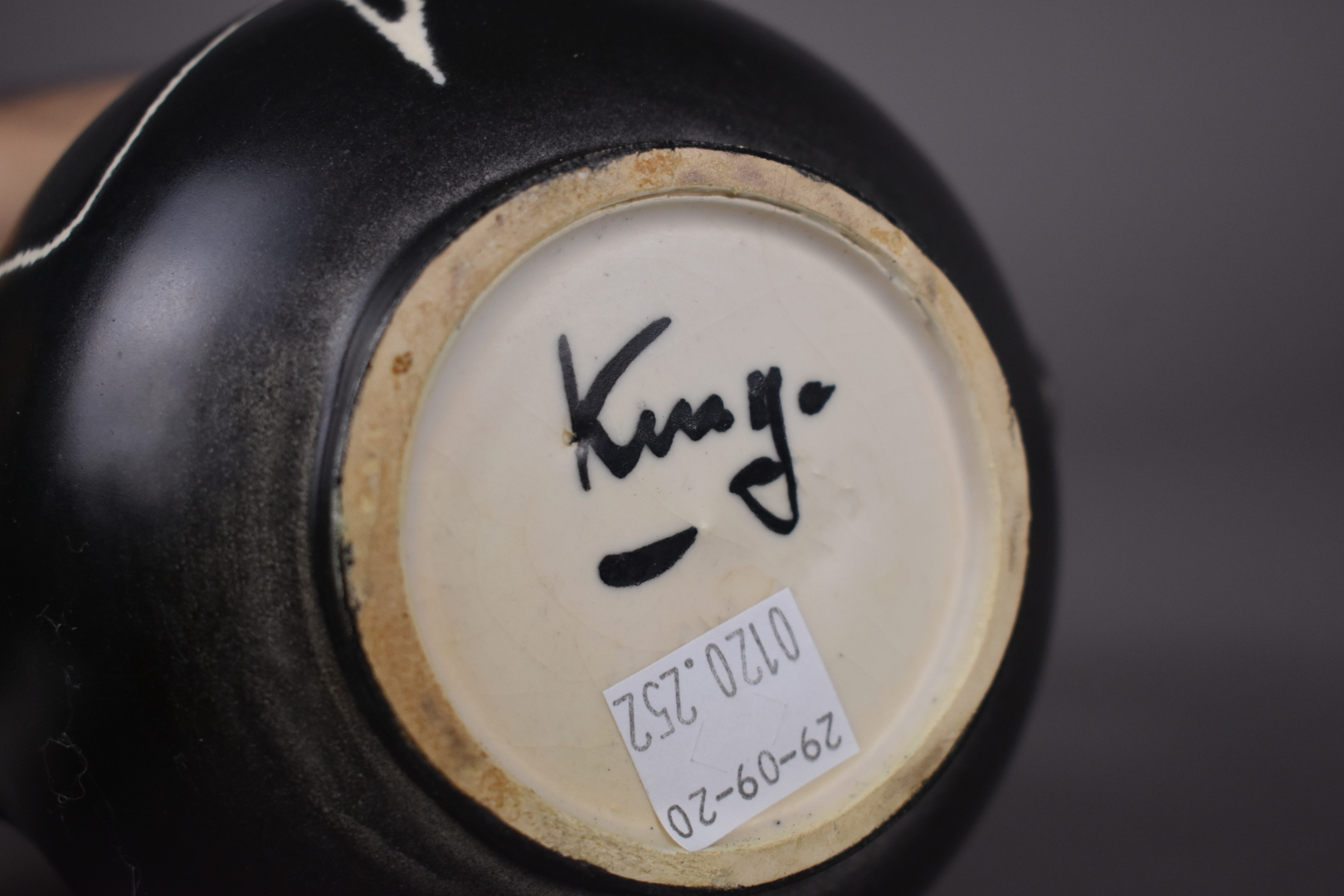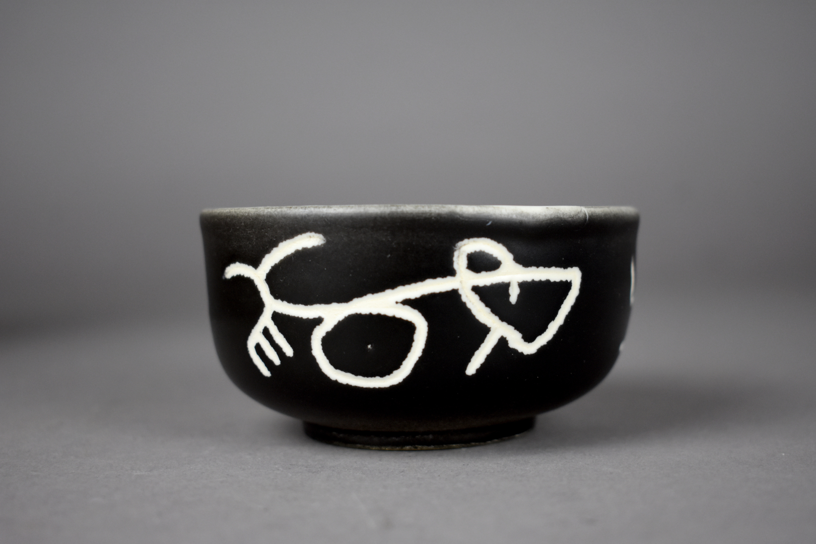 CERENNE à Vallauris. Service à thé modèle « King »en céramique émaillée en polychromie de motifs géométriques sur fond noir (éclats). Il comprent une théière, un pot à lait, un pot à sucre, six tasses et sous-tasses. Marqués. Vers 1950.