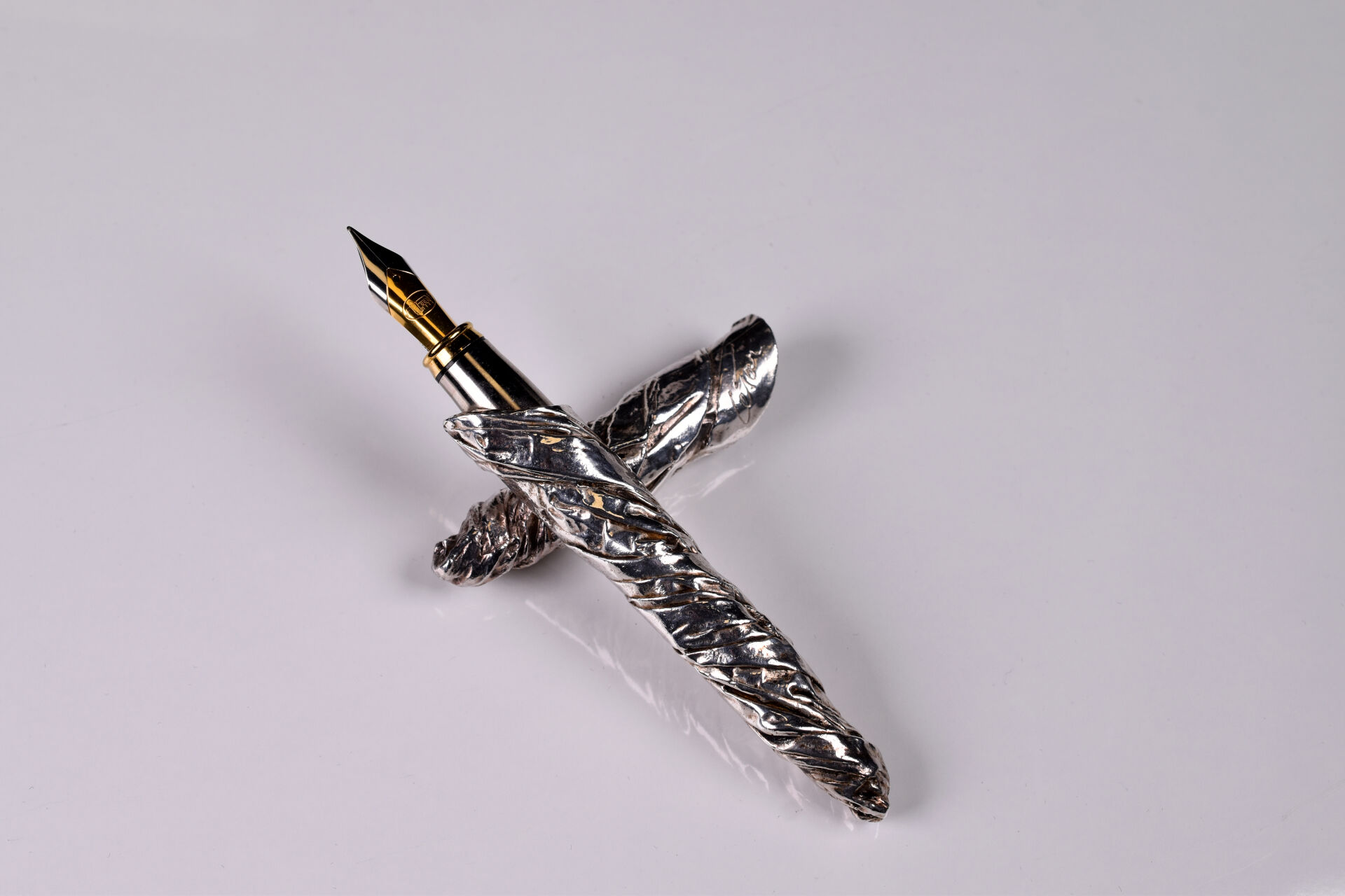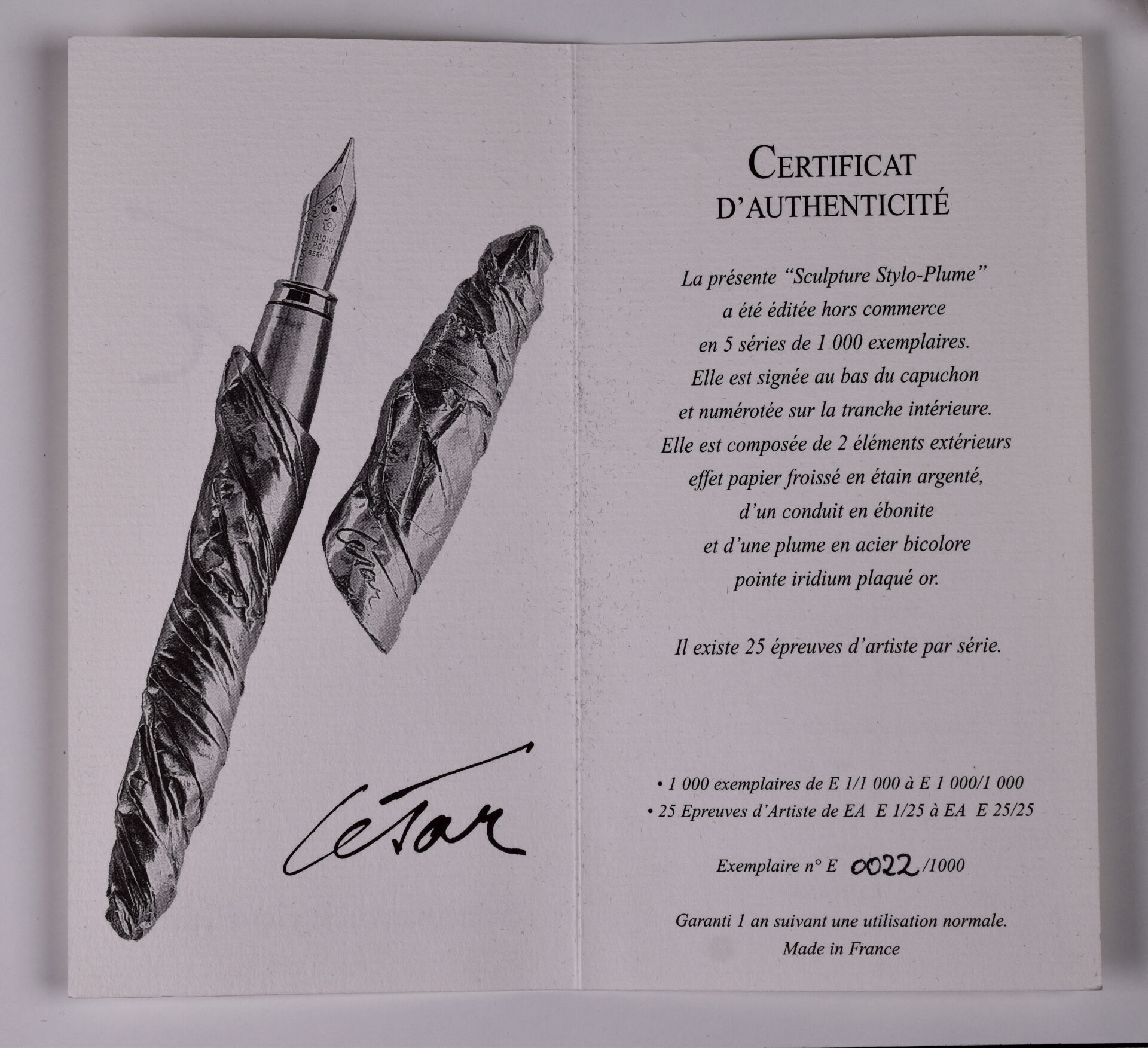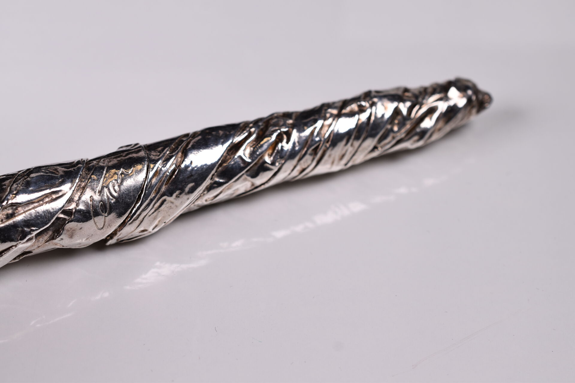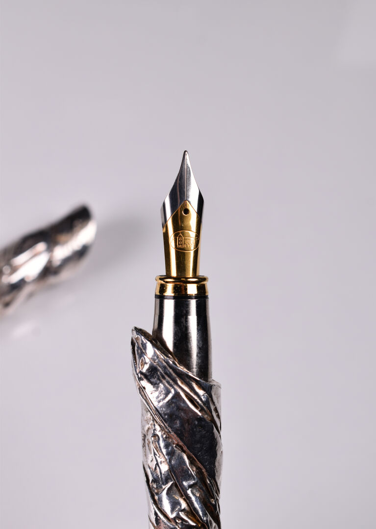 César BALDICCINI dit CESAR (1921-1998). Stylo sculpture en métal argenté signé. Edition Azygos. Long. : 15 cm. Accompagné de son certificat, numéroté sur 0022/1000. Boite.