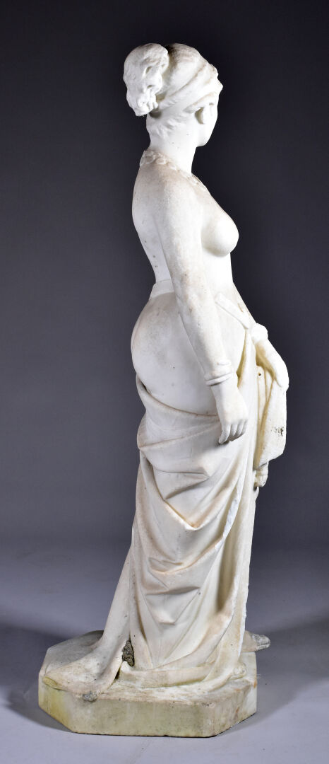 Cesare ZOCCHI (1851 – 1922). « Popée ». Sculpture en marbre blanc (usures de surface liées à une exposition prolongée aux intempéries). Signée, située et datée 1889 en bas sur la base. Haut. : 120 cm.