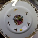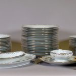 CHADELAUD – LIMOGES. Partie de service de table en porcelaine à décor décalcomanié de scènes dans le goût chinois et dorure sur fond légèrement céladon. Il comprend 17 assiettes plates, 12 assiettes creuses, 12 assiettes à dessert, 2 soupières, 1 jatte, 1 plat de service oblong, 1 plat à anses, un saladier, 2 raviers, 1 saucière à fond solidaire. Marqué au dessous.