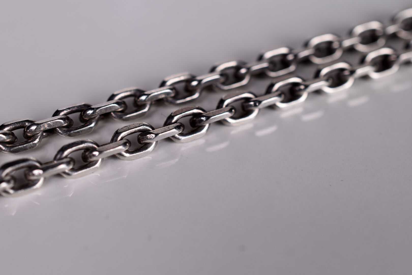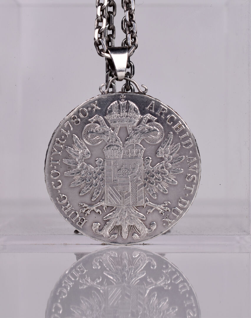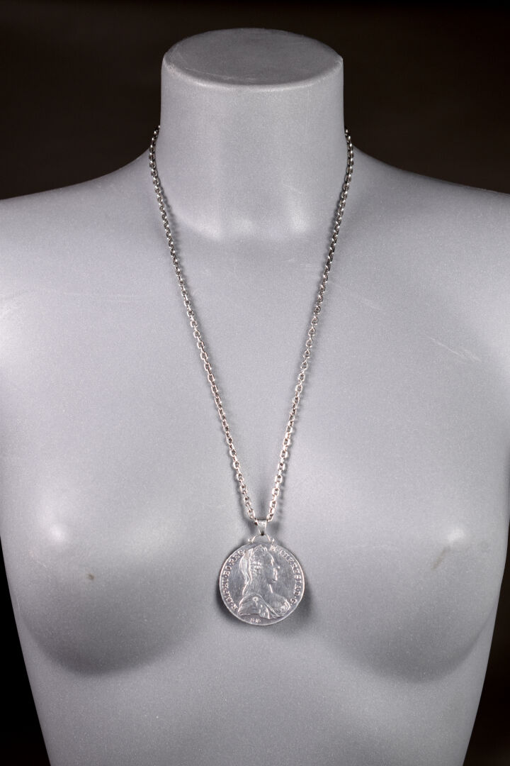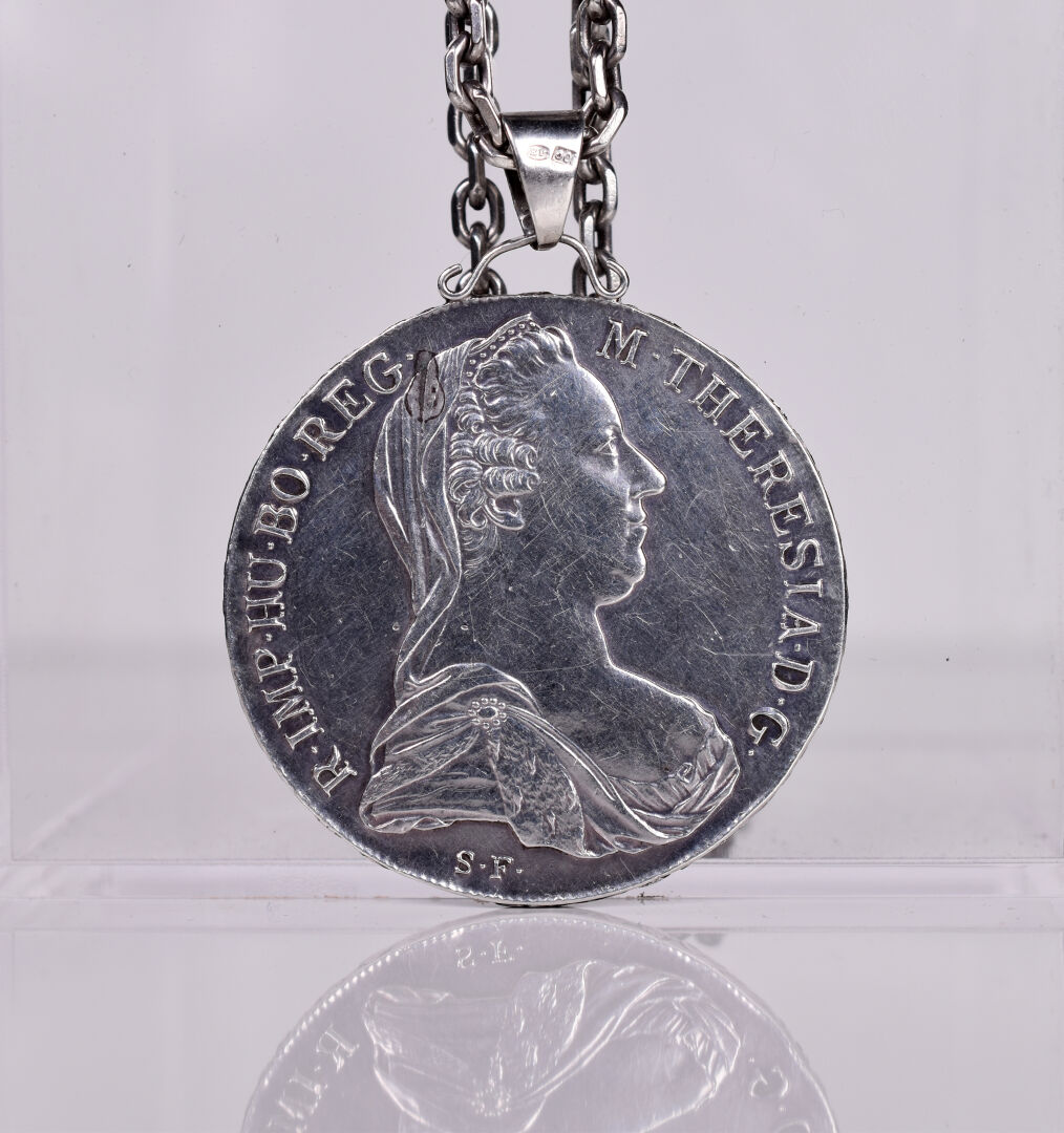 Chaine en argent 925/1000e et son pendentif pièce. Pièce Marie-Thérèse d’Autriche. Long. de la chine : 60 cm. Haut. du pendentif. : 5 cm. Poids total : 49 g.