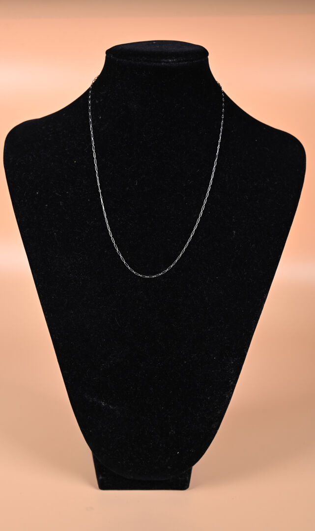 Chaine en or gris 750 millièmes (18k) et platine 850 millièmes à maille fine style cheval. Longueur : 44,5 cm. Poids : 2,8 g