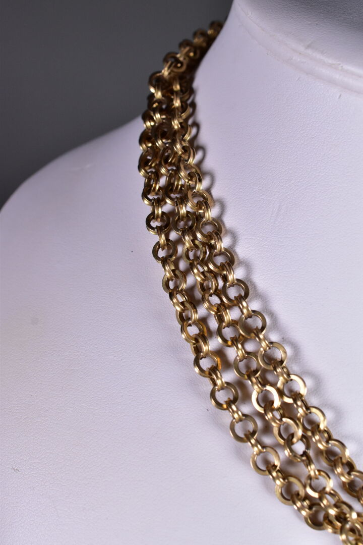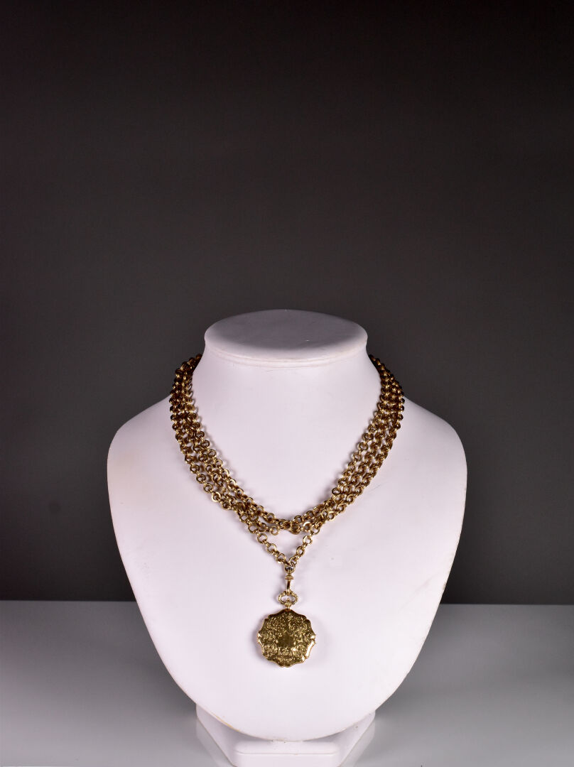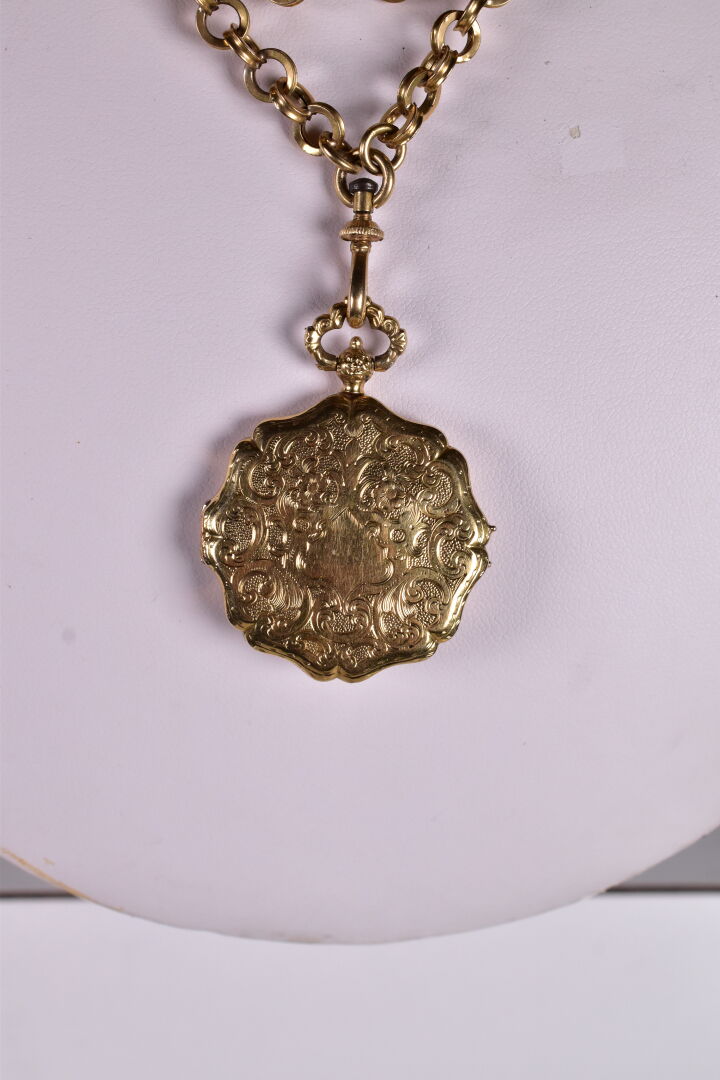 Chaine giletière double rang et son médaillon en or jaune 18K 750/1000e (petits chocs). Long. : 75 cm. Poids. : 38,3 g.