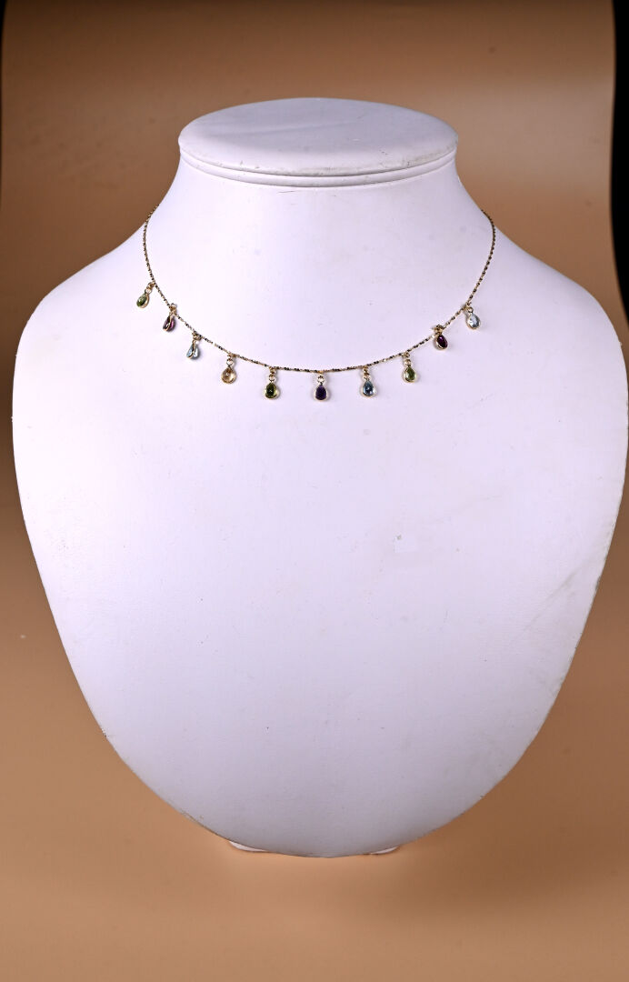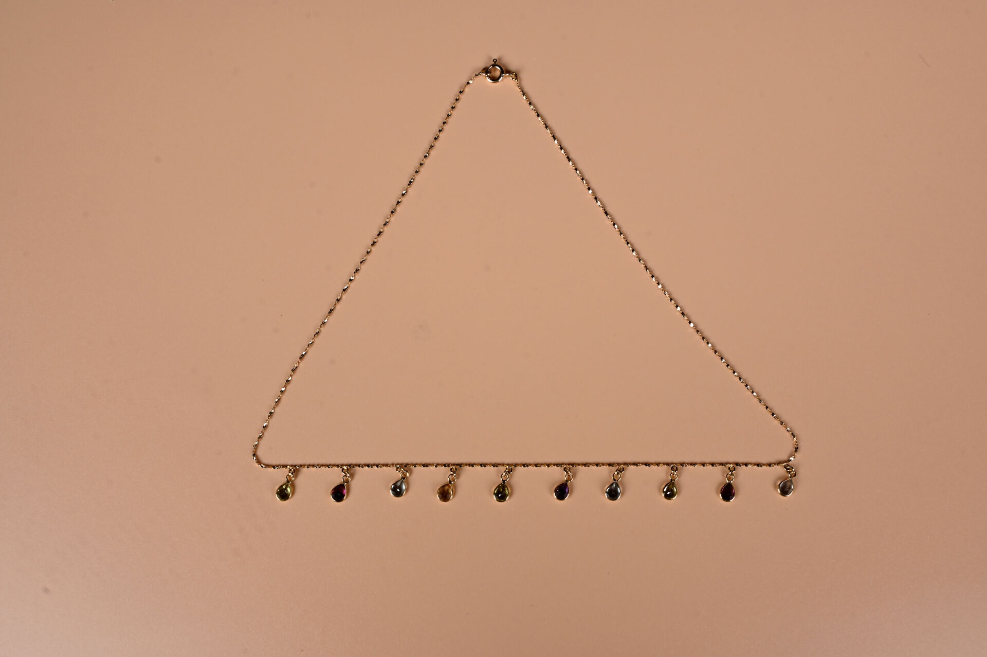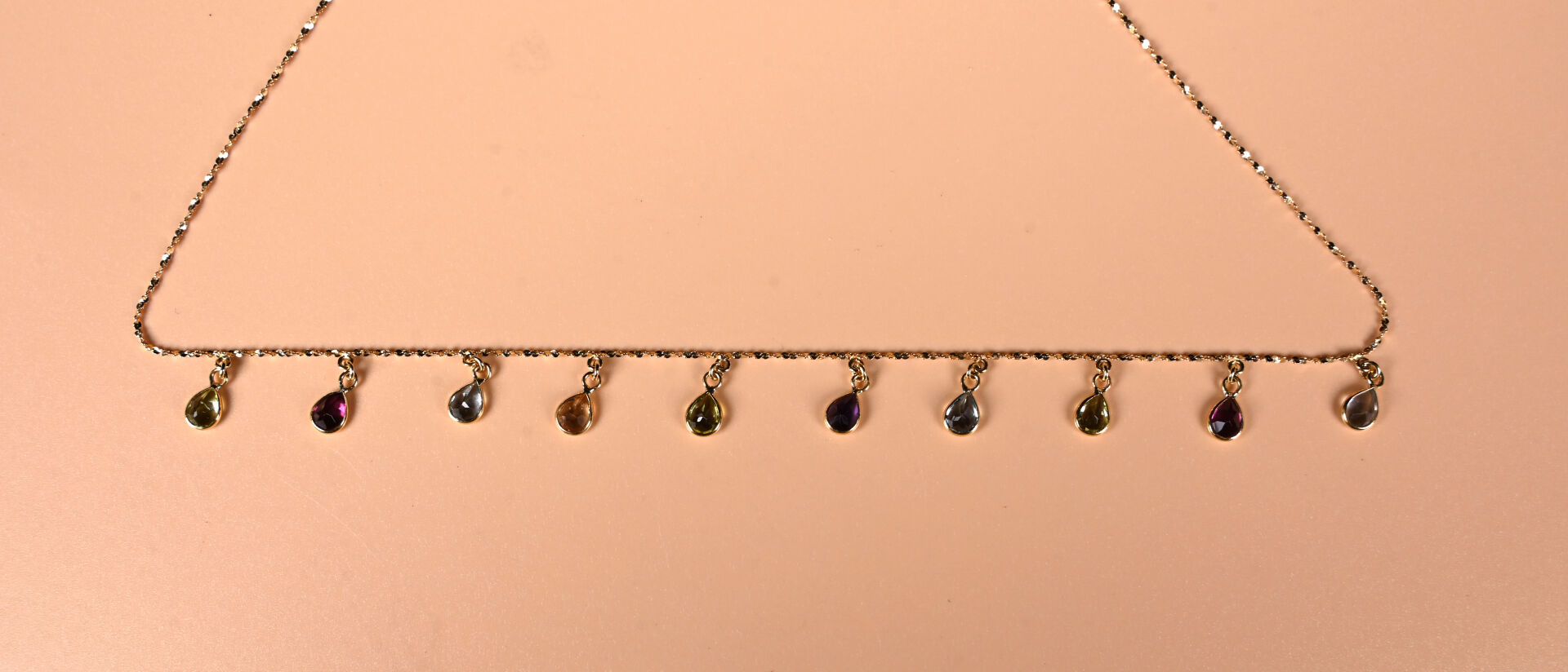 Chaîne « tutti frutti » en or jaune 18K 750/1000e et goutes de pierres fines. Long. : 42 cm. Poids brut. : 3,2 g.