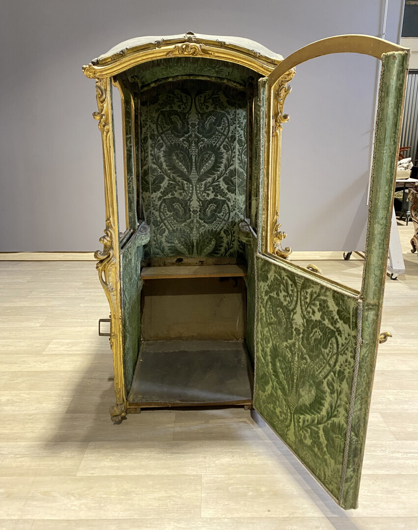 Chaise à porteurs de forme mouvementée en bois mouluré, sculpté et doré, à décor de concrétions marines, festons, coquilles, enroulements et feuilles d’acanthe, à sept panneaux peints à fond doré des vertus cardinales dont la force, la fidélité, la sagesse, la richesse et de putti jouant. Elle ouvre en façade par un vantail vitré et présente deux fenêtres de chaque côté. Le toit amovible en toile enduite et ornements de bronzes dorés sur le pourtour (renforts sous la caisse, accidents, usures, manques, fentes, quelques reprises à la dorure, traces d’insectes xylophages, intérieur refait, vitres manquantes).