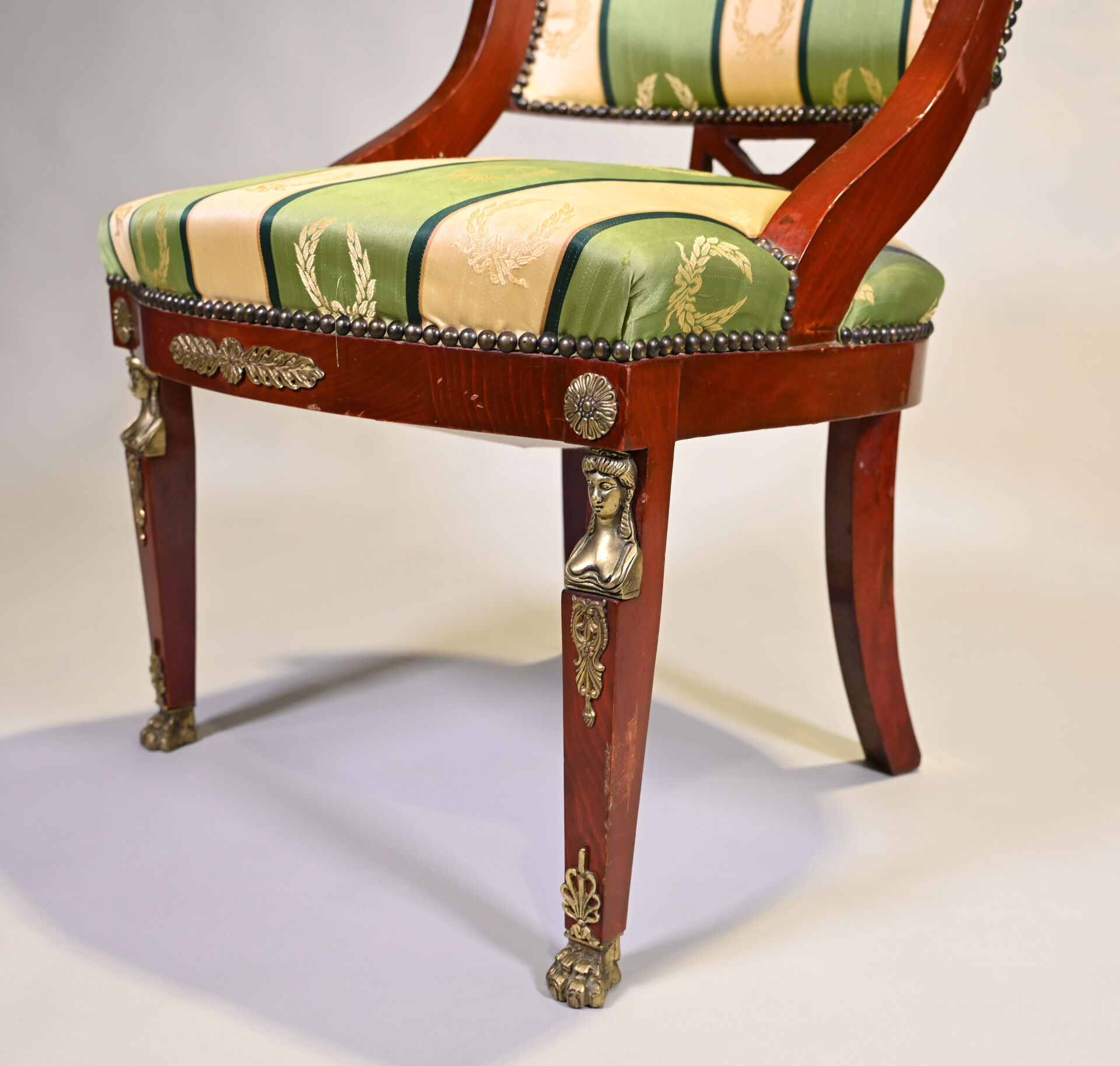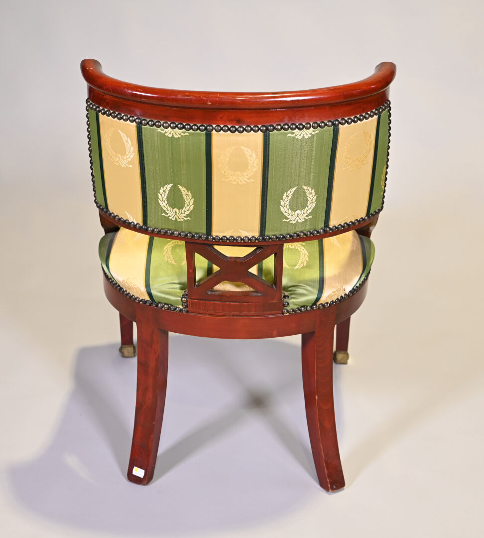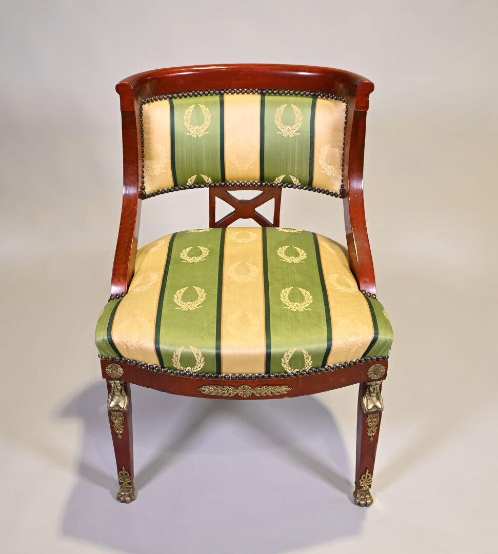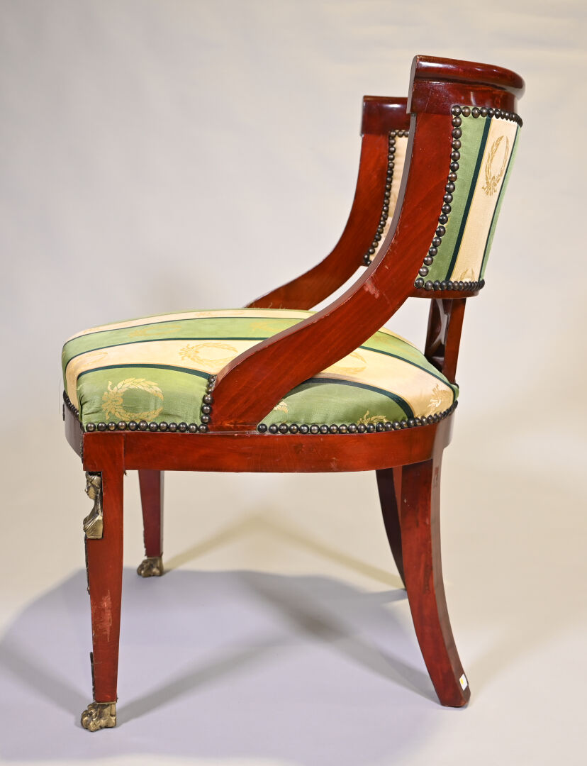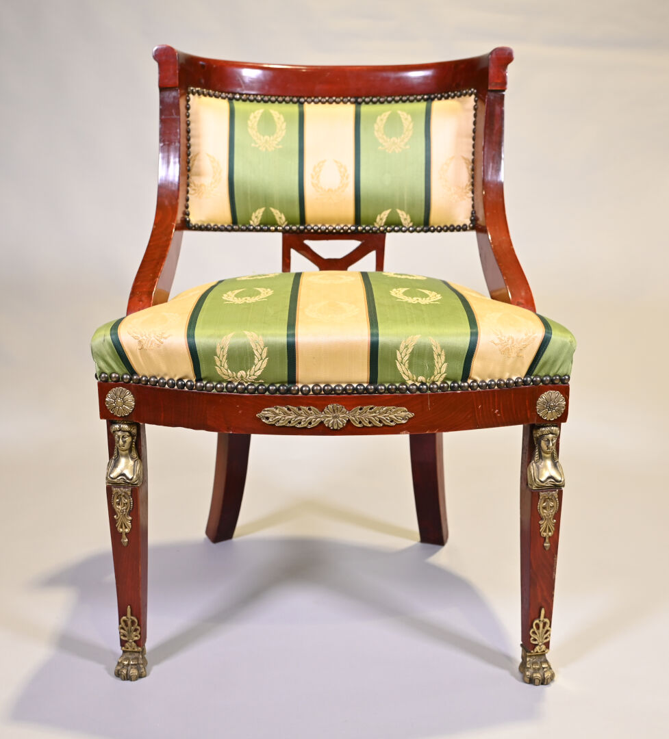 Chaise en bois teinté à l’imitation de l’acajou, les pieds antérieurs en gaine, postérieurs sabre. Garniture de satin vert et or à décor de couronnes de laurier. Style Empire, XXe siècle. Haut. : 86,5 cm – Larg. : 63 cm – Prof. : 69 cm.