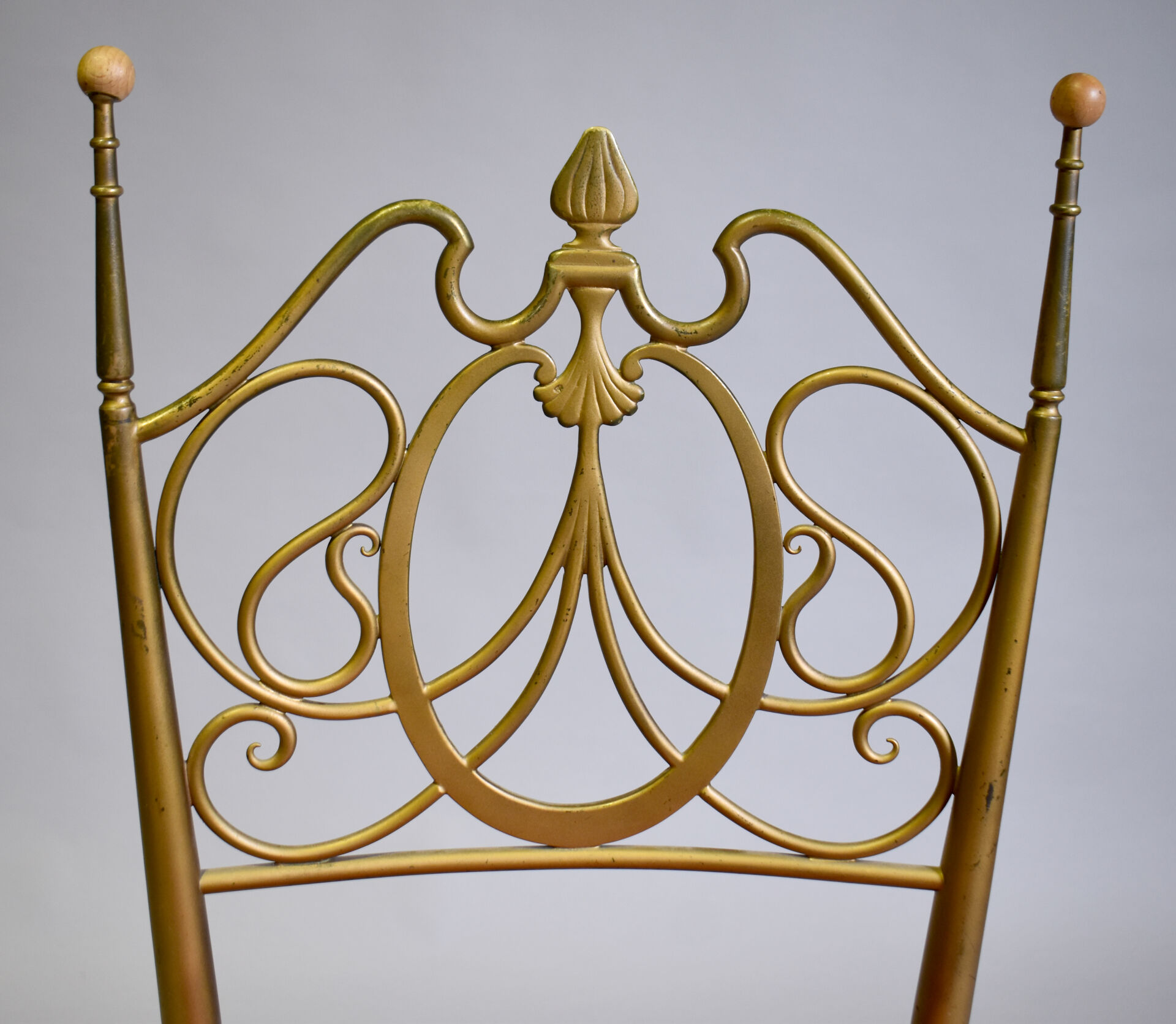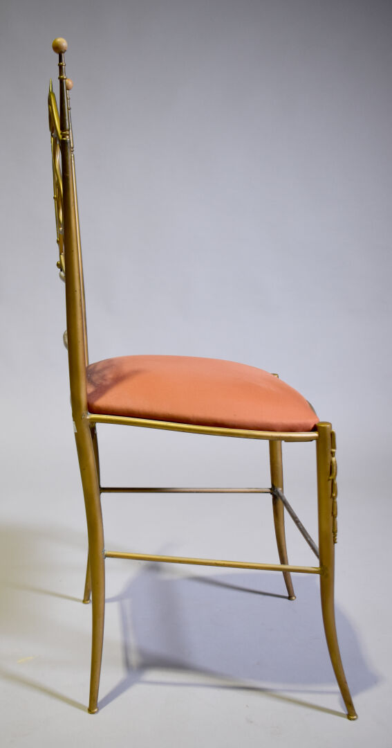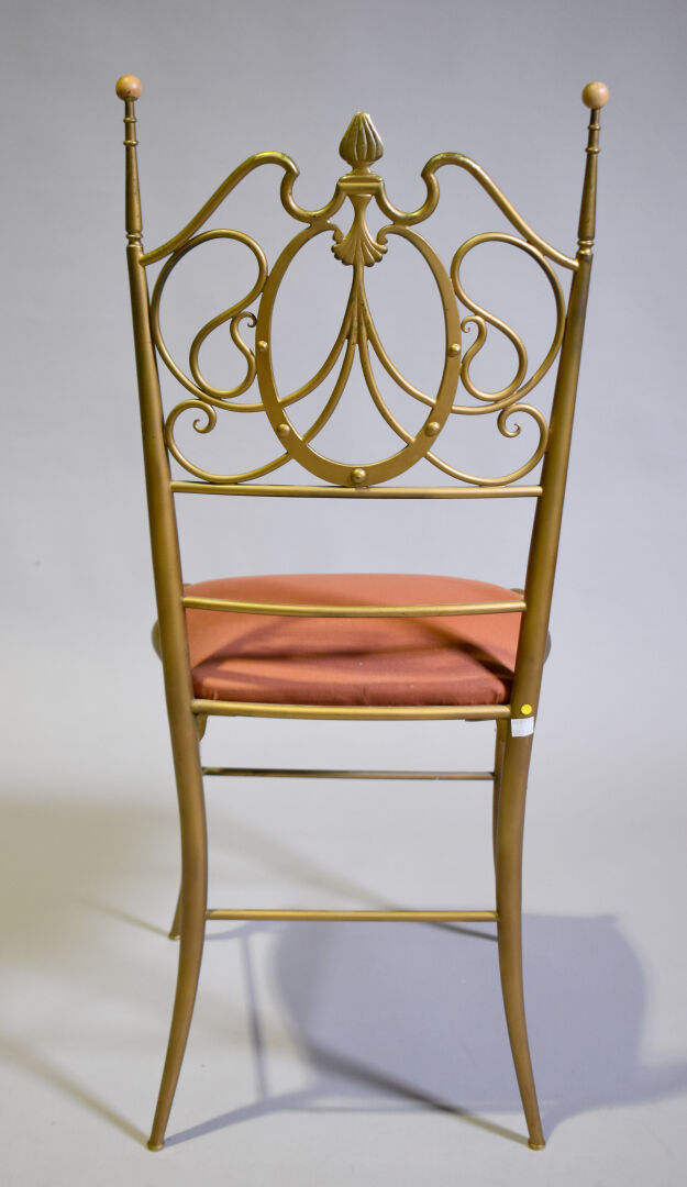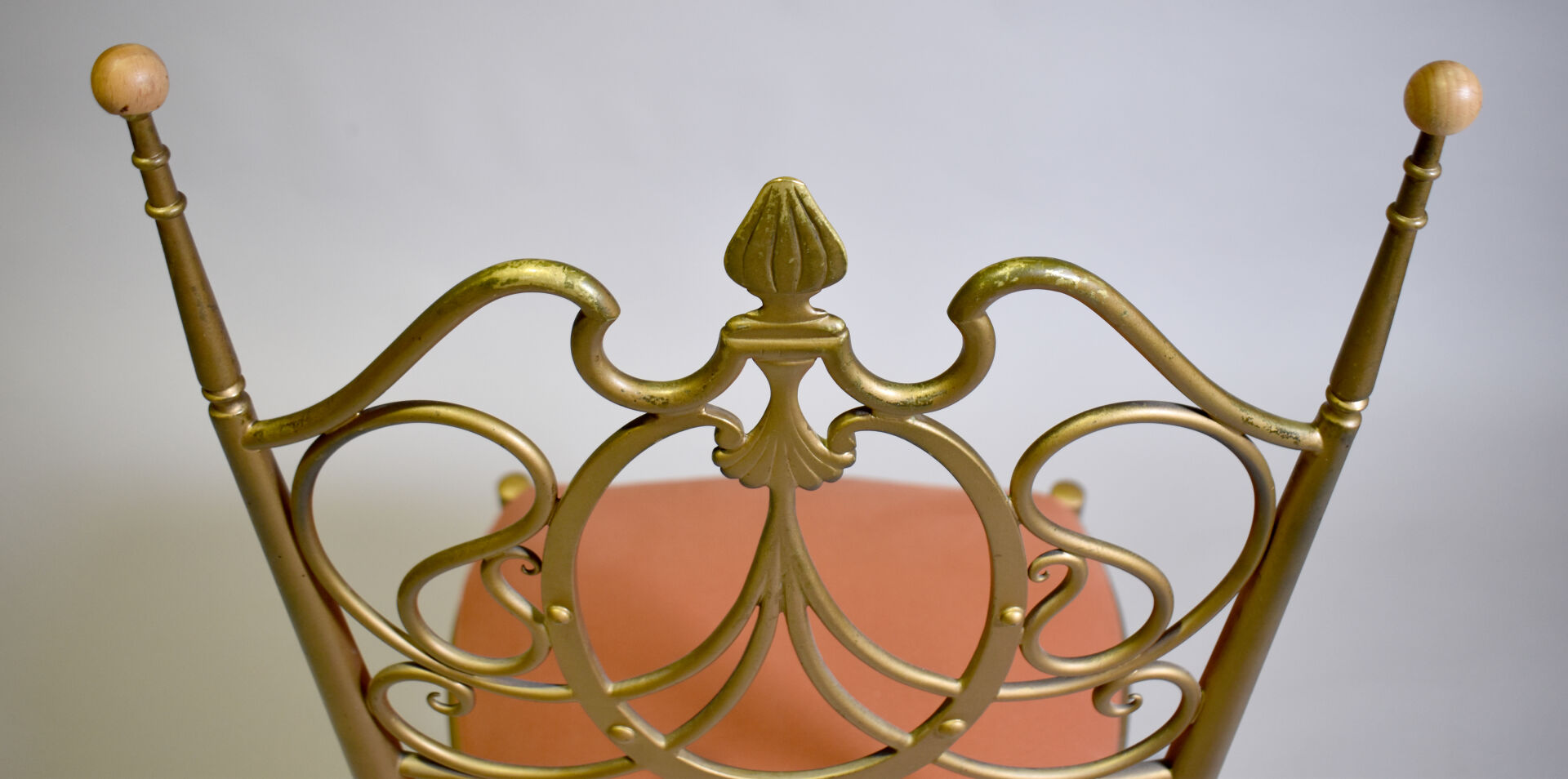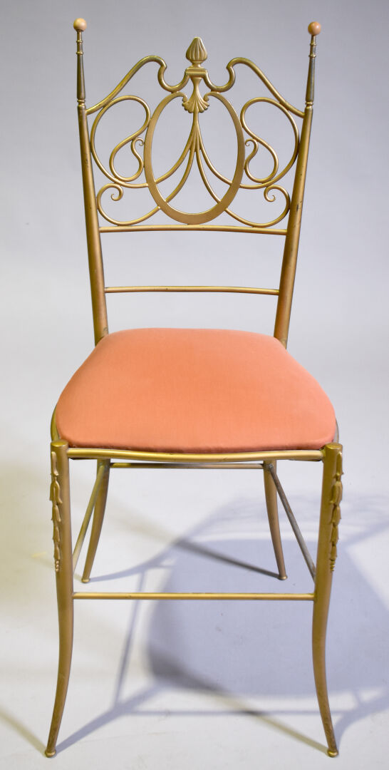 Chaise volante en métal doré, le dossier ajouré d’entrelacs et palmette. Galette garnie de tissu corail. Style Art Nouveau. Haut. : 97 cm.