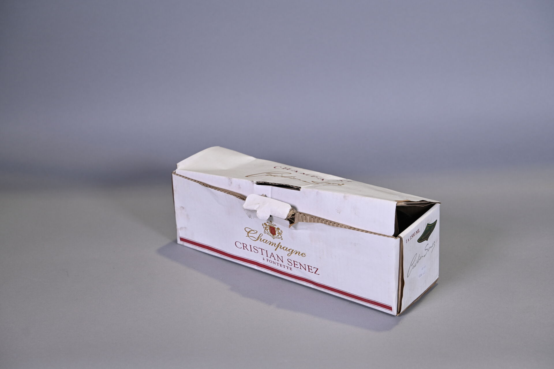 CHAMPAGNE – 1 magnum, Champagne, Christian Senez, Brut. Niveau à 3,7 cm sous la coiffe. En étui d’origine.