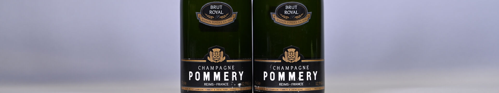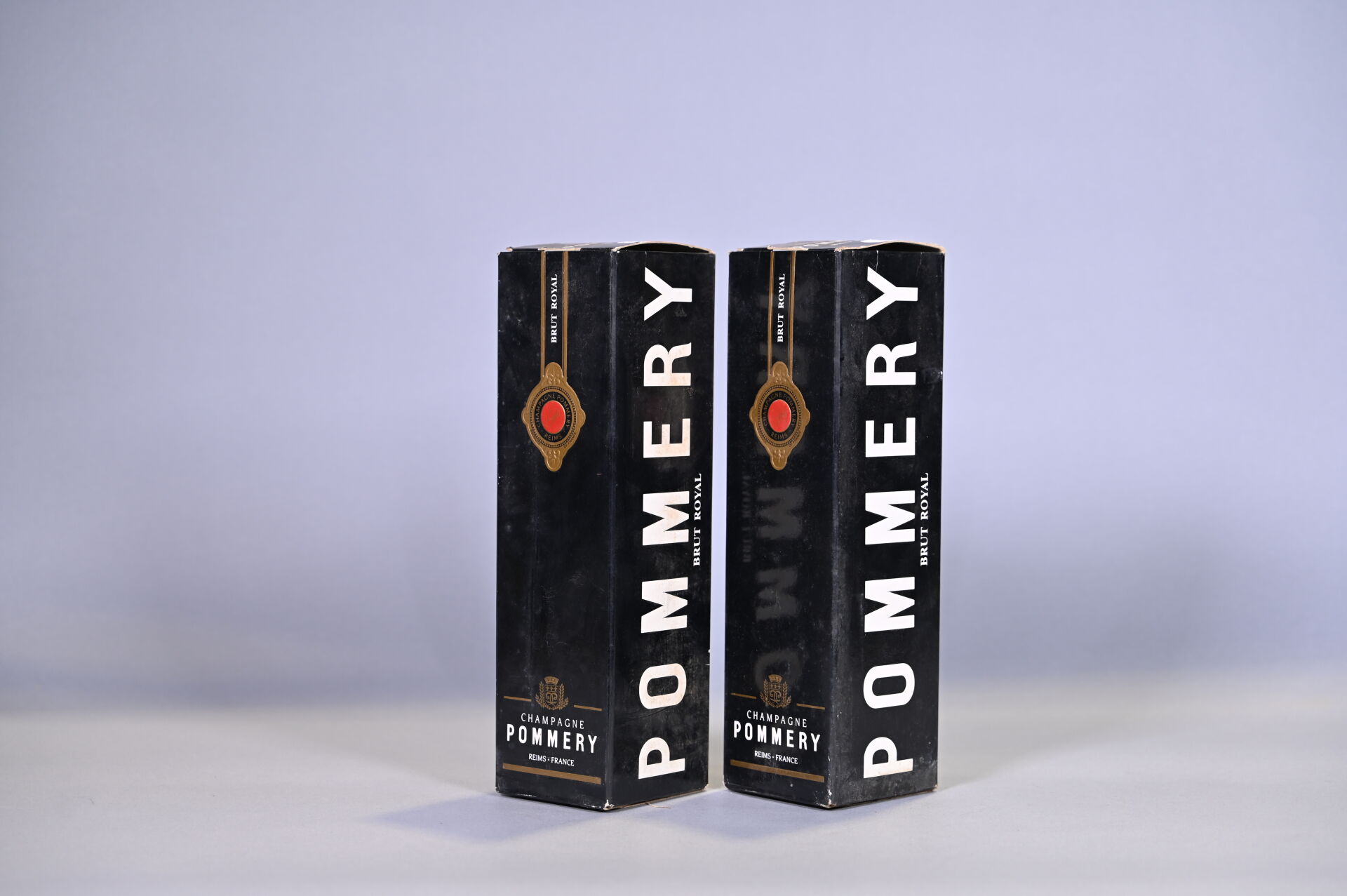 CHAMPAGNE – 2 bouteilles, Champagne, Pommery, Brut Royal. En étuis individuels d’origine (légèrement sales à sales). Etiquettes très légèrement abimées.