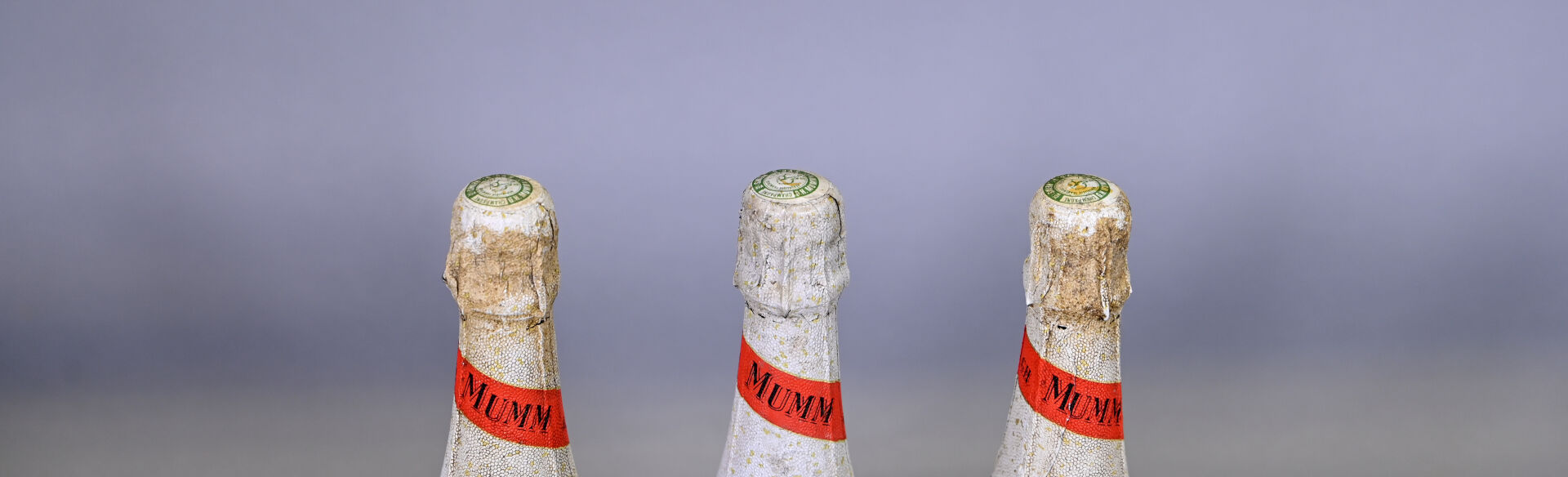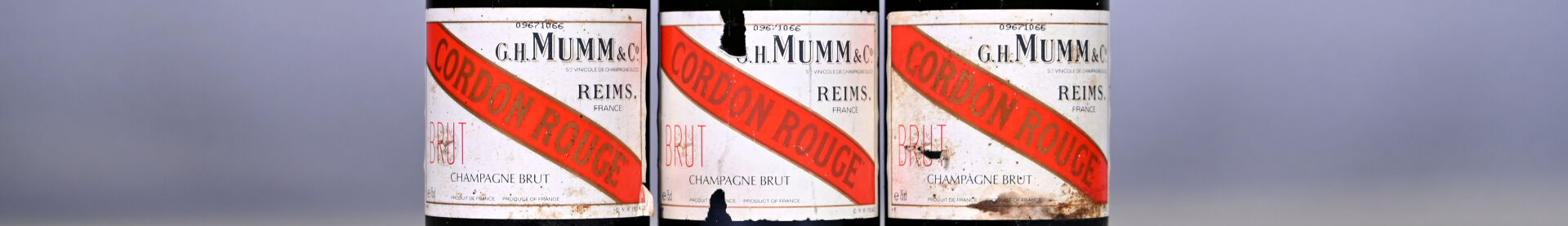 CHAMPAGNE – 3 bouteilles, Champagne, Mumm, Cordon Rouge, Brut. Coiffes légèrement sales à sales. Etiquettes légèrement sales à sales et abimées.