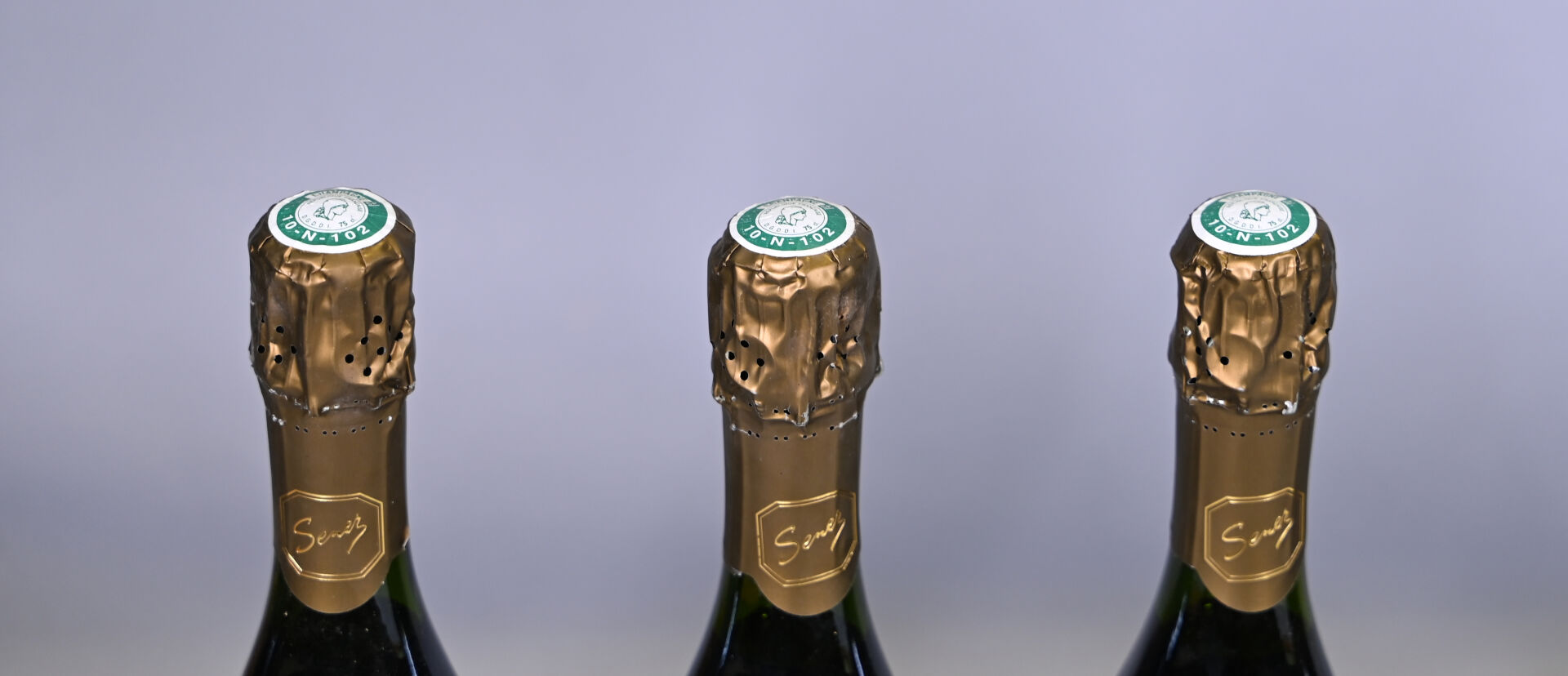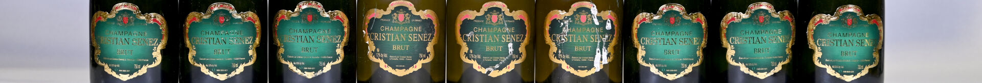 CHAMPAGNE – 9 bouteilles, Champagne, Christian Senez, Brut, 1996 (3) et 2000 (6). Niveaux à 2 cm sous la coiffe ou mieux. Deux étiquettes légèrement abimées à abimées.