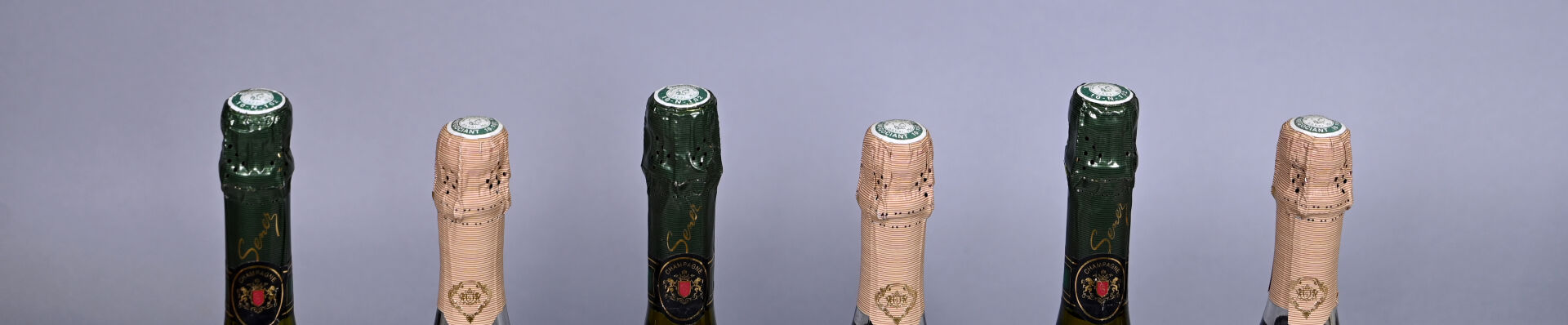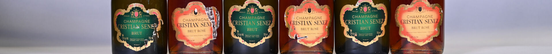 3 bouteilles, Champagne, Christian Senez, Brut, 1999. Niveaux à 1 cm sous la coiffe ou mieux. Etiquettes légèrement abimées à abimées.