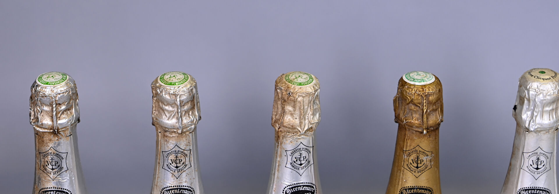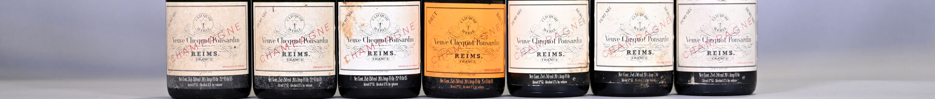 6 bouteilles, Champagne, Veuve Clicquot Ponsardin, Demi-Sec. Coiffes légèrement sales à sales et abimées. Etiquettes légèrement sales à sales.
