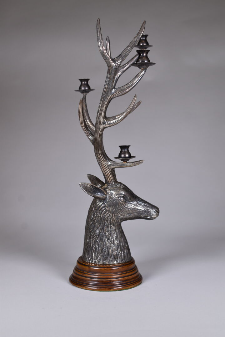 Chandelier en bronze argenté représentant un trophée de cerf, les quatre lumières sur ses bois. La base en bois tourné. XXe siècle. Haut. : 50,5 cm.