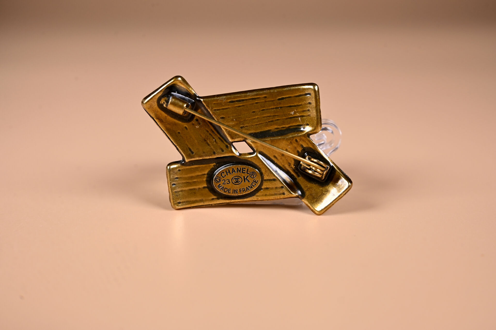 CHANEL 2023. Broche en métal doré avec inscriptions en noir. Signée au dos. Long. 5 cm.