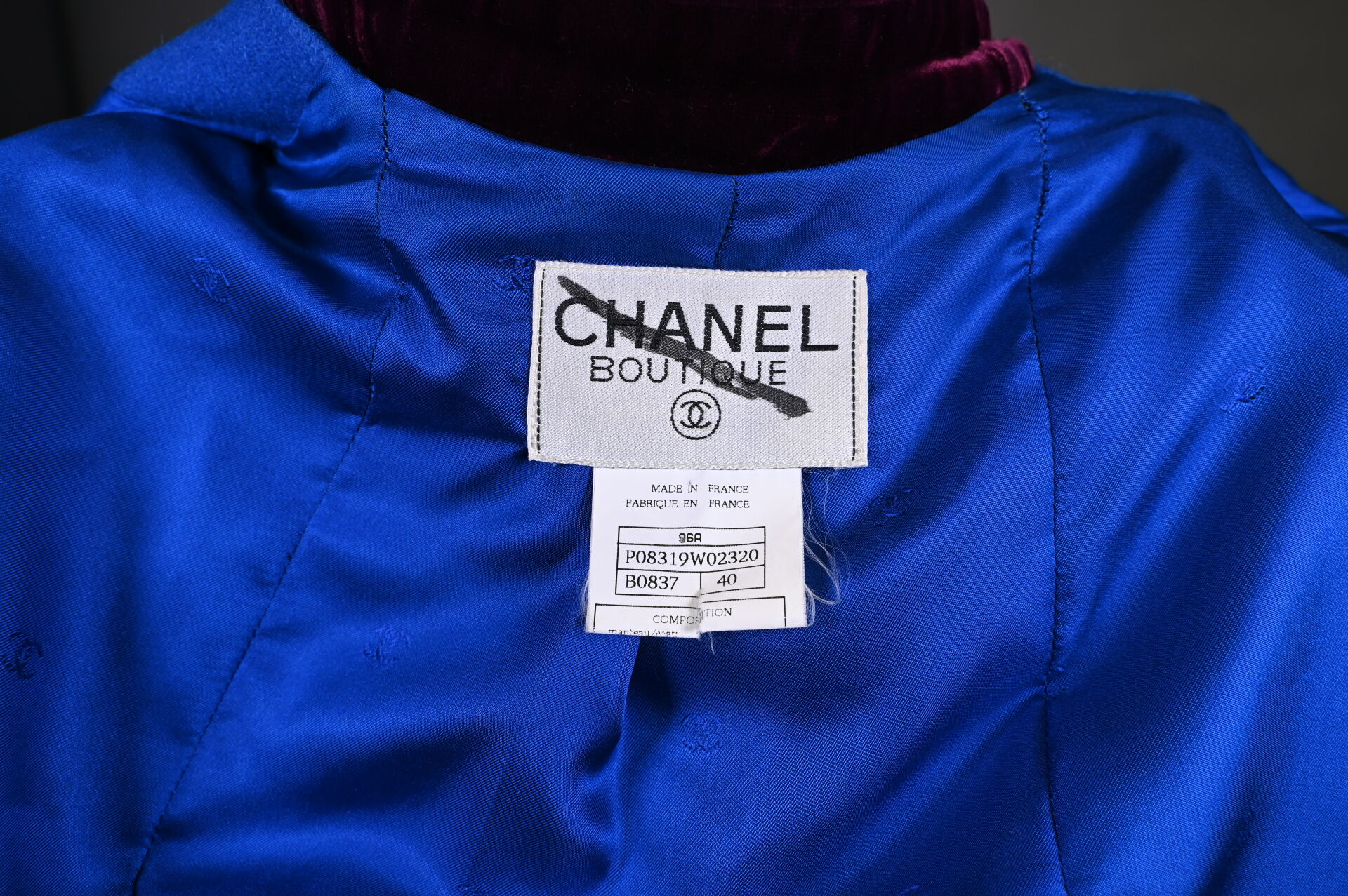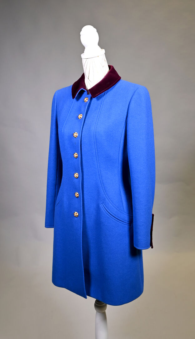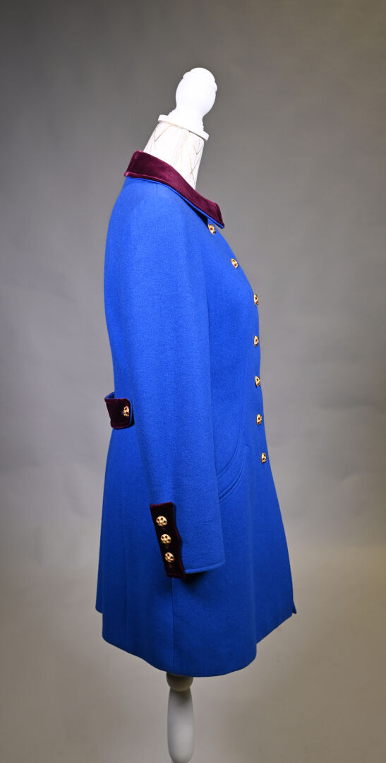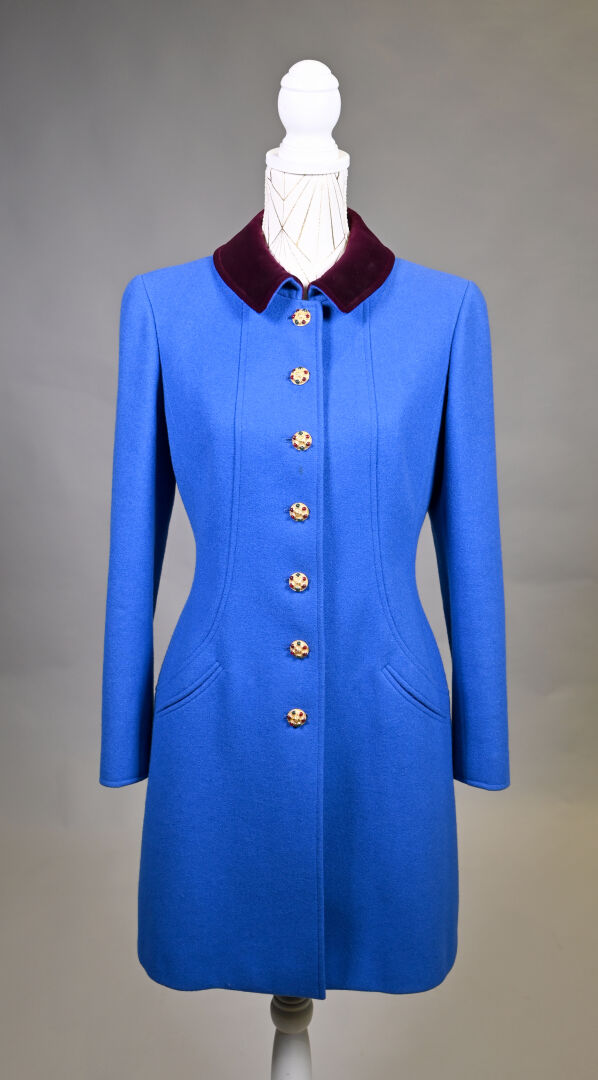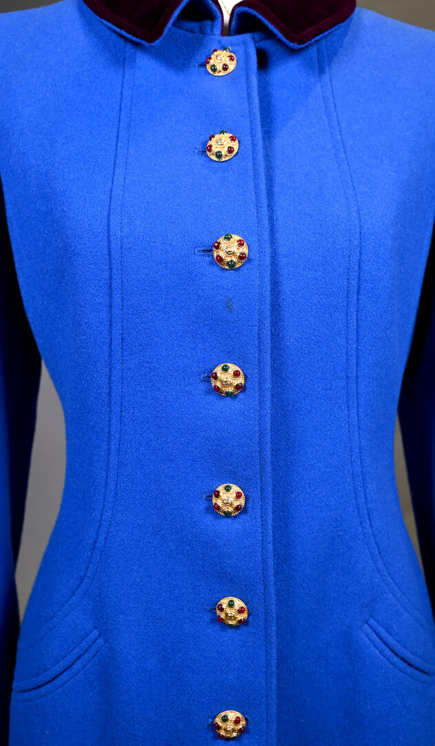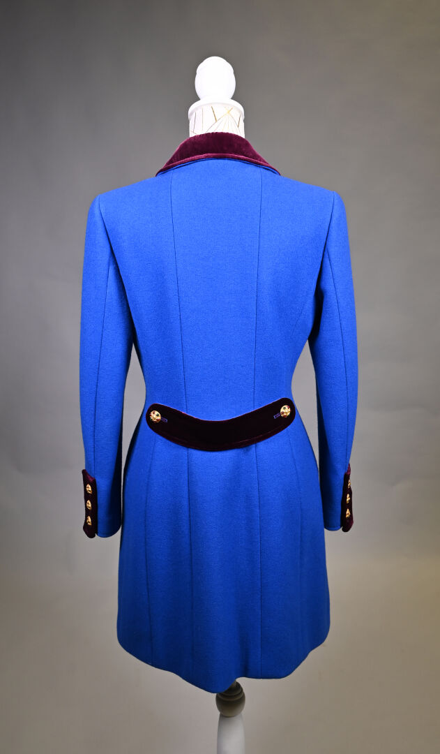 CHANEL BOUTIQUE (dégriffé). Manteau en laine bleu électrique, le col, les manchettes et le dos de la ceinture garnis de velours aubergine (une tache). Les boutons bijoux en métal doré et cabochons de verroterie. L’intérieur doublé de soie bleue. Taille 36. Long.: 95 cm.